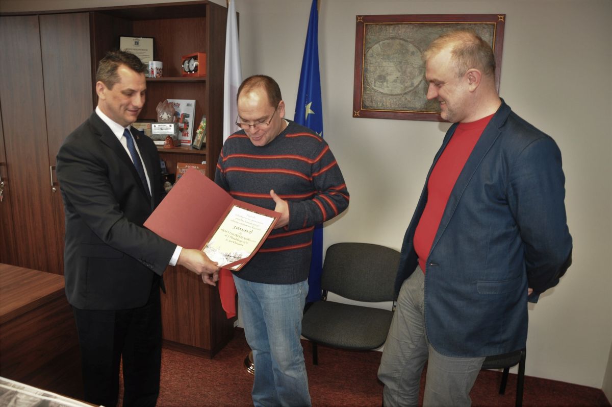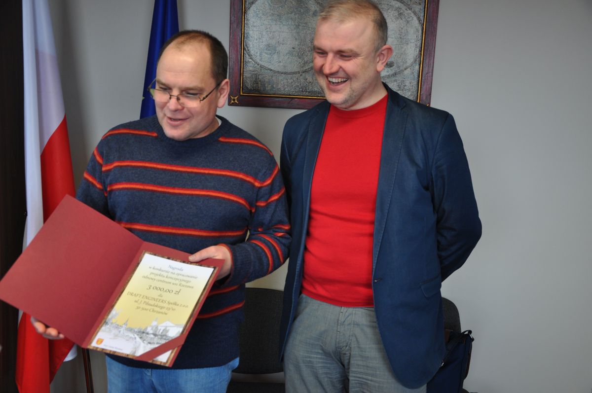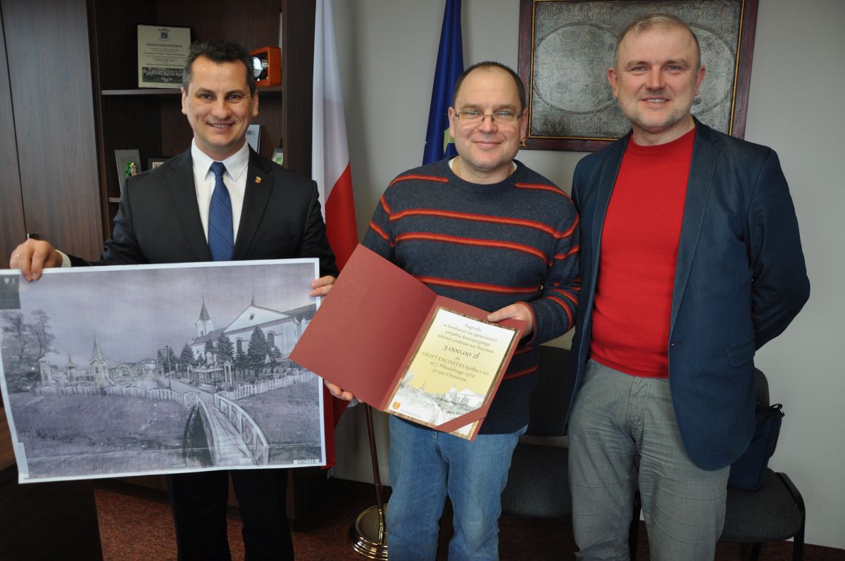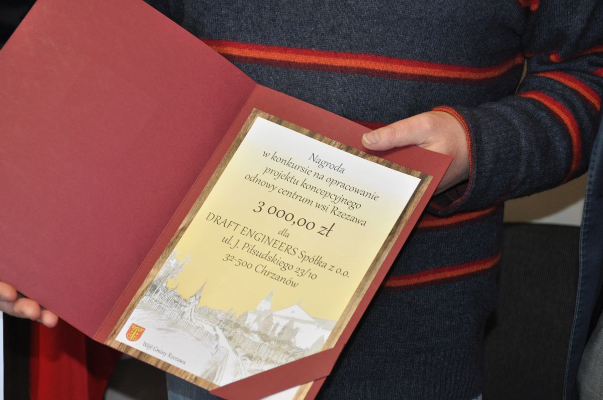 Centrum Rzezawy wygląda coraz bardziej okazale. Planowana inwestycja jeszcze bardziej podkreśliłaby piękno stolicy naszej gminy, a mieszkańcy zyskali kolejne tereny, gdzie w słoneczne dni można byłoby spędzić przyjemnie wolny czas – zaznacza wójt Gminy Rzezawa Mariusz Palej, który wczoraj w siedzibie urzędu wręczył nagrodę w wysokości 3 tys. złotych przedstawicielom chrzanowskiej firmy, która opracowała projekt koncepcyjny odnowy centrum Rzezawy.