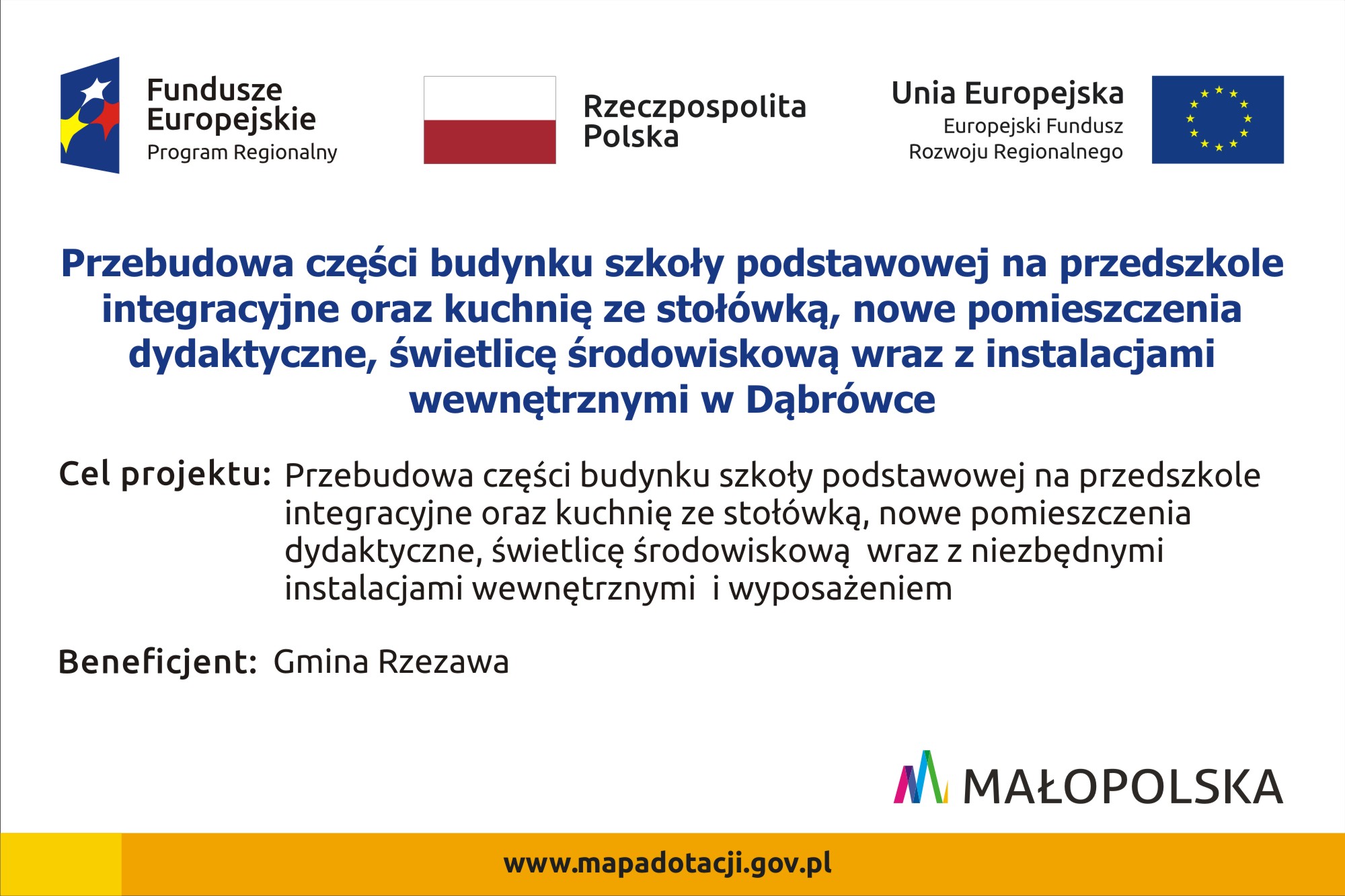 Natomiast w dniu 29.07.2020r. podpisano Umowę o dofinansowanie na zadanie pn. Przebudowa części budynku szkoły podstawowej na przedszkole integracyjne oraz kuchnię ze stołówką, nowe pomieszczenia dydaktyczne, świetlicę środowiskową wraz z instalacjami wewnętrznymi w Dąbrówce w ramach Regionalnego Programu Operacyjnego Województwa Małopolskiego, Oś 11 Rewitalizacja przestrzeni regionalnej, Działanie 11.2 Odnowa obszarów wiejskich.