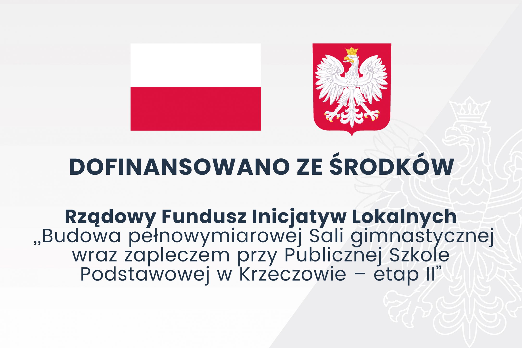 Gmina Rzezawa otrzymała dofinansowanie na realizacje zadania pn. "Budowa pełnowymiarowej Sali gimnastycznej wraz zapleczem przy Publicznej Szkole Podstawowej w Krzeczowie – etap II” w ramach Rzadowego Funduszu Inicjatyw Lokalnych w kwocie 500 000,00 zł - II NABÓR