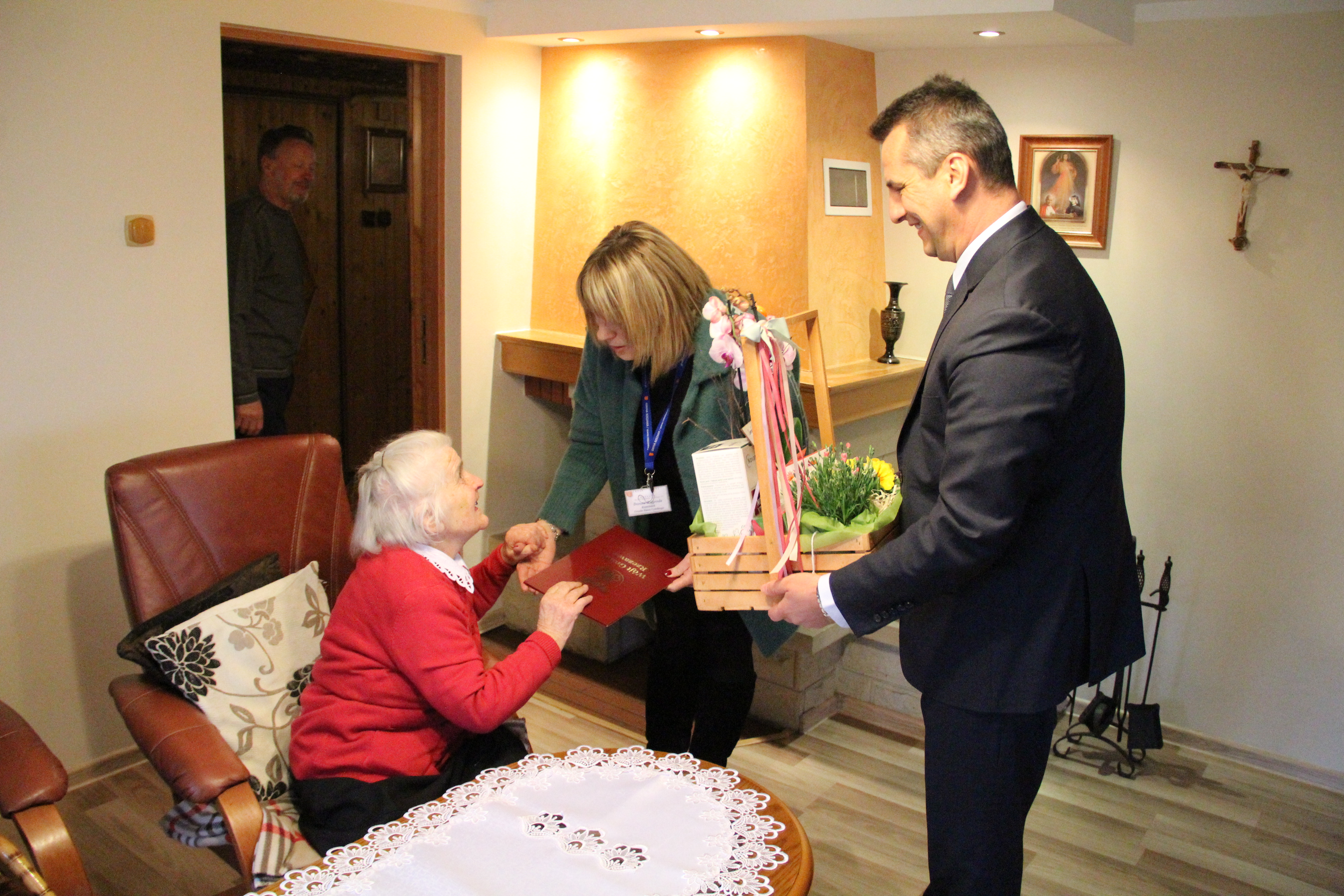 Pani Maria Słonina z Buczkowa, która urodziła się 31 marca 1921 roku, świętuje dzisiaj swoje 101. urodziny. Z tej okazji Wójt Gminy Rzezawa Mariusz Palej wraz z Kierownikiem Urzędu Stanu Cywilnego w Rzezawie Dorotą Wągrodą odwiedzili czcigodną Solenizantkę i wręczyli jej drobny upominek oraz okolicznościowy list gratulacyjny.