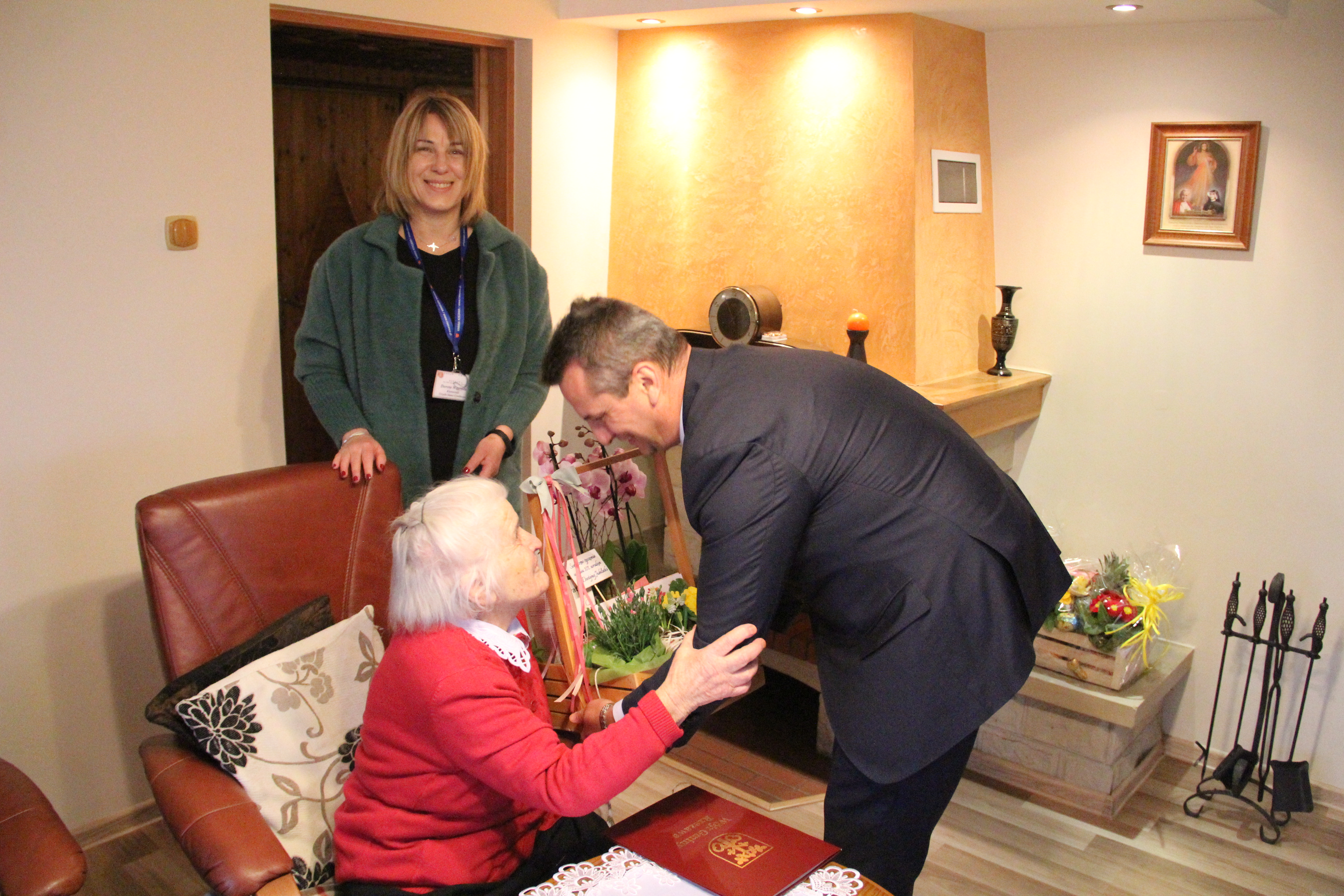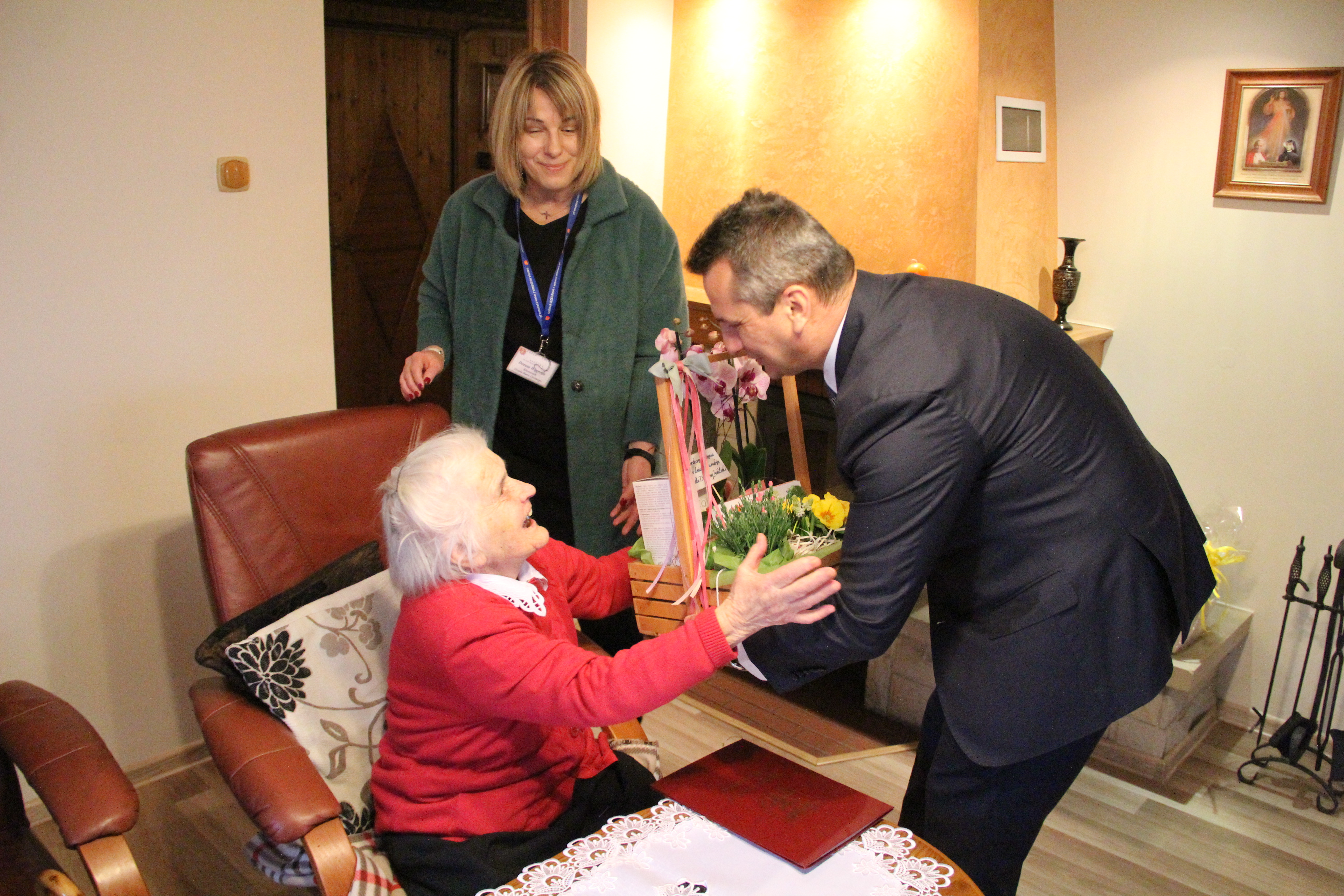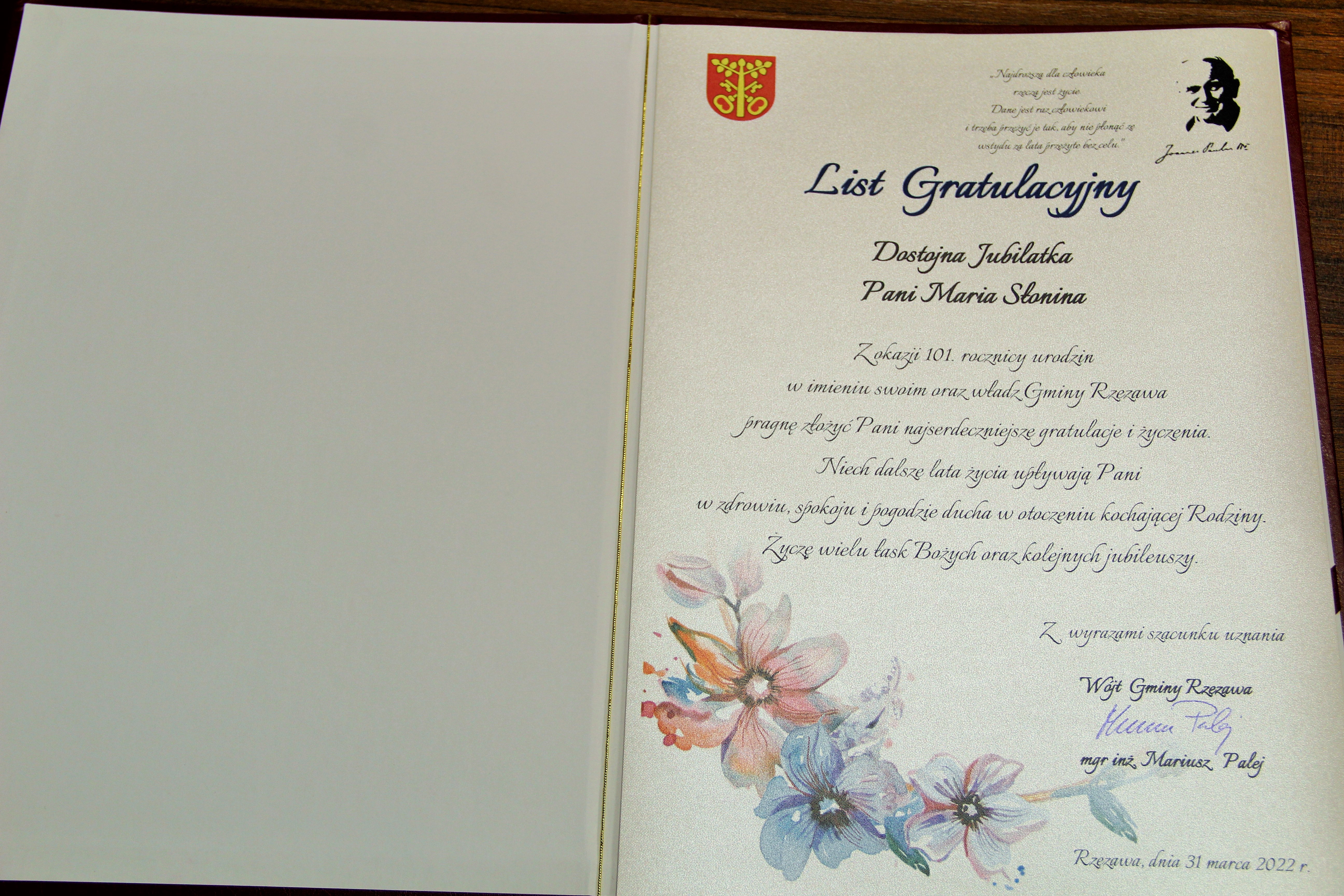 Przedstawiciele Gminy Rzezawa w imieniu własnym oraz całej lokalnej społeczności życzyli Pani Marii dużo zdrowia, szczęścia, zadowolenia, Bożej Opatrzności oraz wszelkiej pomyślności na kolejne lata życia.