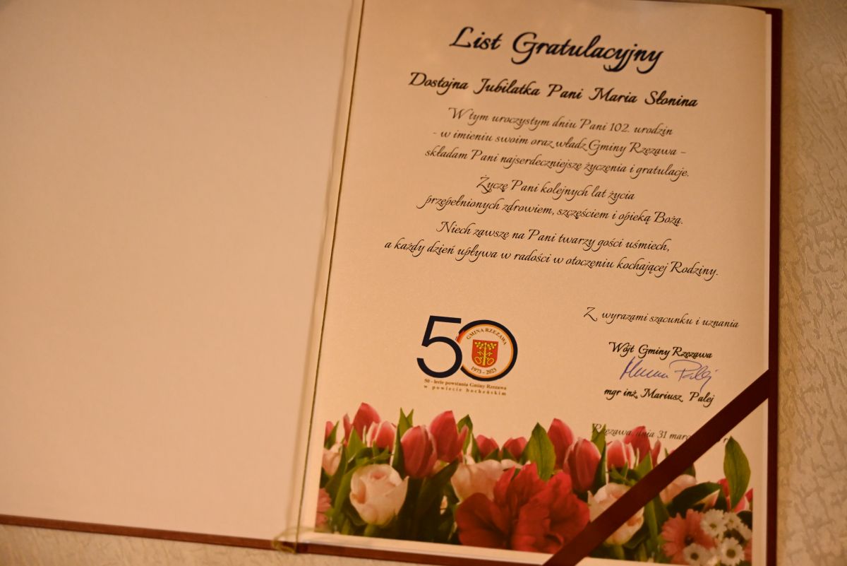 Przedstawiciele Urzędu Gminy Rzezawa życzyli Jubilatce kolejnych wielu długich lat życia w zdrowiu, pomyślności i pogodzie ducha. Podziękowali również za wszelkie trudy życia codziennego, które ukształtowały jej ogromne doświadczenie życiowe – skarbnicę wiedzy dla kolejnych pokoleń. Pani Maria z okazji swojego święta otrzymała okolicznościowy list gratulacyjny wraz z drobnym upominkiem oraz bukiet kwiatów.