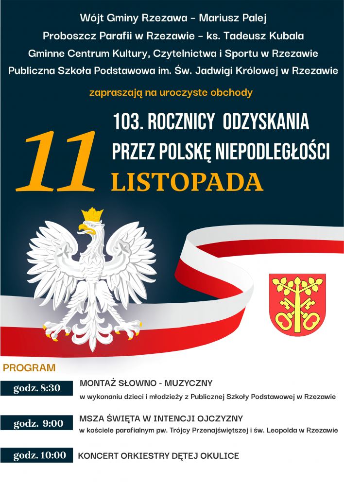 11 listopada w Rzezawie odbędą się uroczyste obchody Narodowego Święta Niepodległości. Szczegółowy program uroczystości znajduje się na plakacie.
