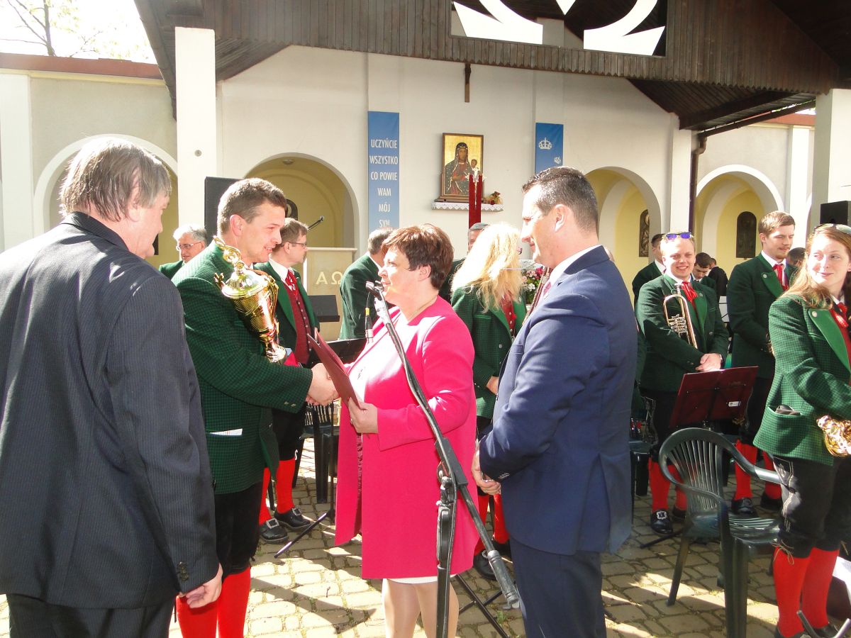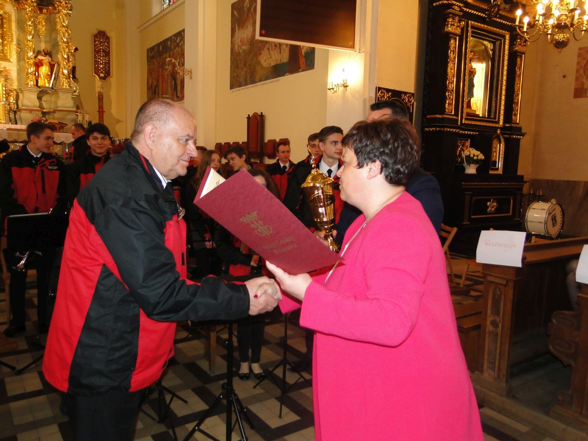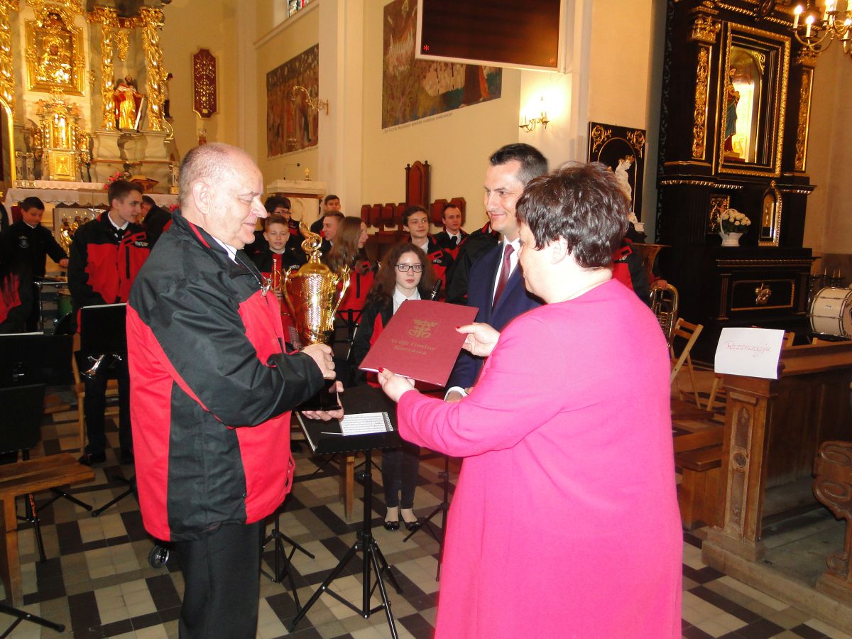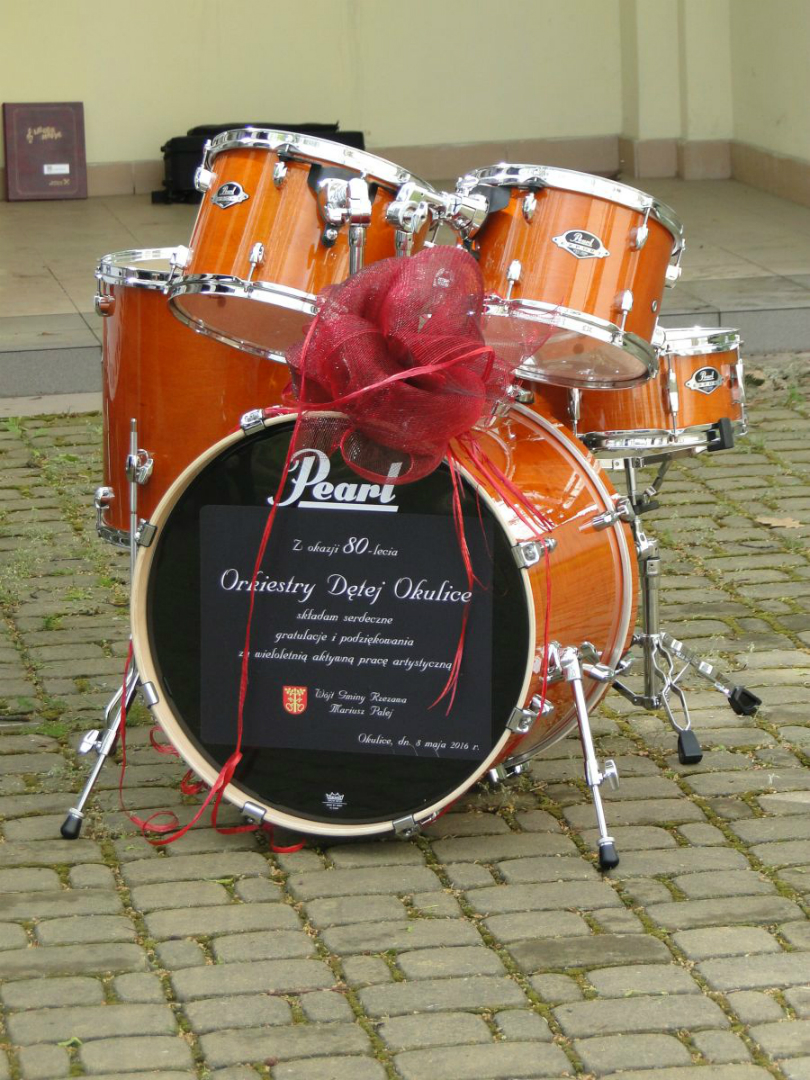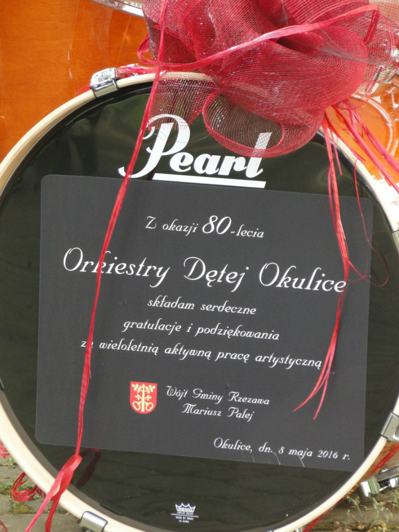 Jak na jubileusz przystało przyszedł także czas na życzenia i prezenty. Pan Wójt Mariusz Palej przekazał słowa uznania i gratulacje dla wszystkich osób tworzących orkiestrę na przestrzeni tych lat oraz podarował ufundowaną przez samorząd gminy wspaniałą perkusję. Kolejno gratulacje złożyli Starosta Bocheński Pan Ludwik Węgrzyn, kapelmistrzowie poszczególnych orkiestr, Dyrektor GCKCziS w Rzezawie oraz Zarząd Orkiestry z Krasocina. Życzenia złożyli również Dyrektor Miejskiego Centrum Kultury „Sokół” z Nowego Sącza Pan Antoni Malczak i Stanisław Migacz – główny specjalista do spraw orkiestr dętych. Następnie członkowie Orkiestry Dętej z Okulic przyjęli z rąk Prezesa Zarządu Oddziału Gminnego Związku OSP RO w Rzezawie Pana Krzysztofa Kołodzieja oraz Wójta Gminy Rzezawa Pana Mariusza Paleja odznaczenia za wysługę lat. Na zakończenie koncertu Prezes Orkiestry Dętej Okulie Pan Krzysztof Dziadowiec podziękował wszystkim za pomoc i zaangażowanie w przygotowaniu tej uroczystości jak również za pracę na przestrzeni tych lat poprzednim członkom orkiestry oraz kapelmistrzom.