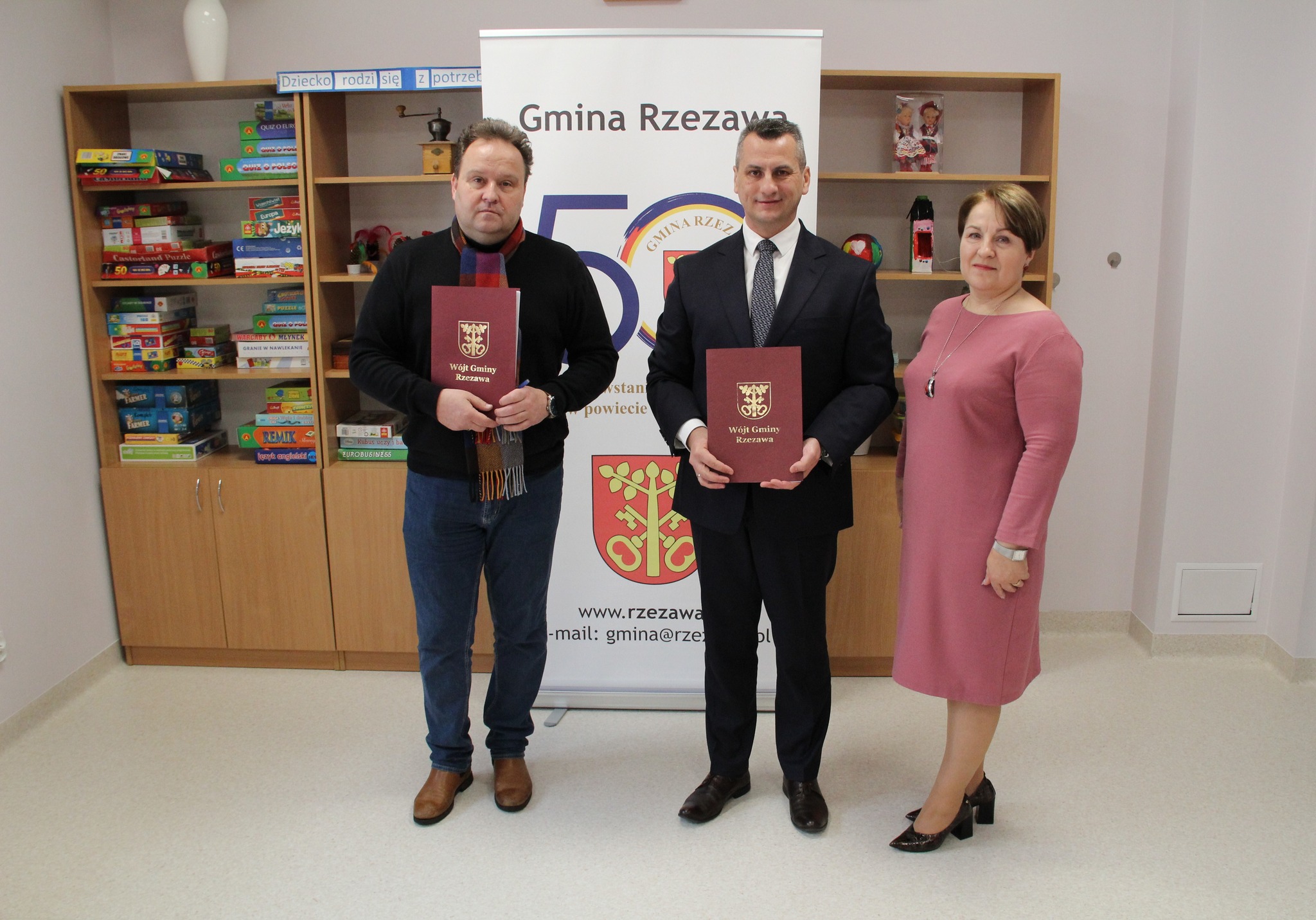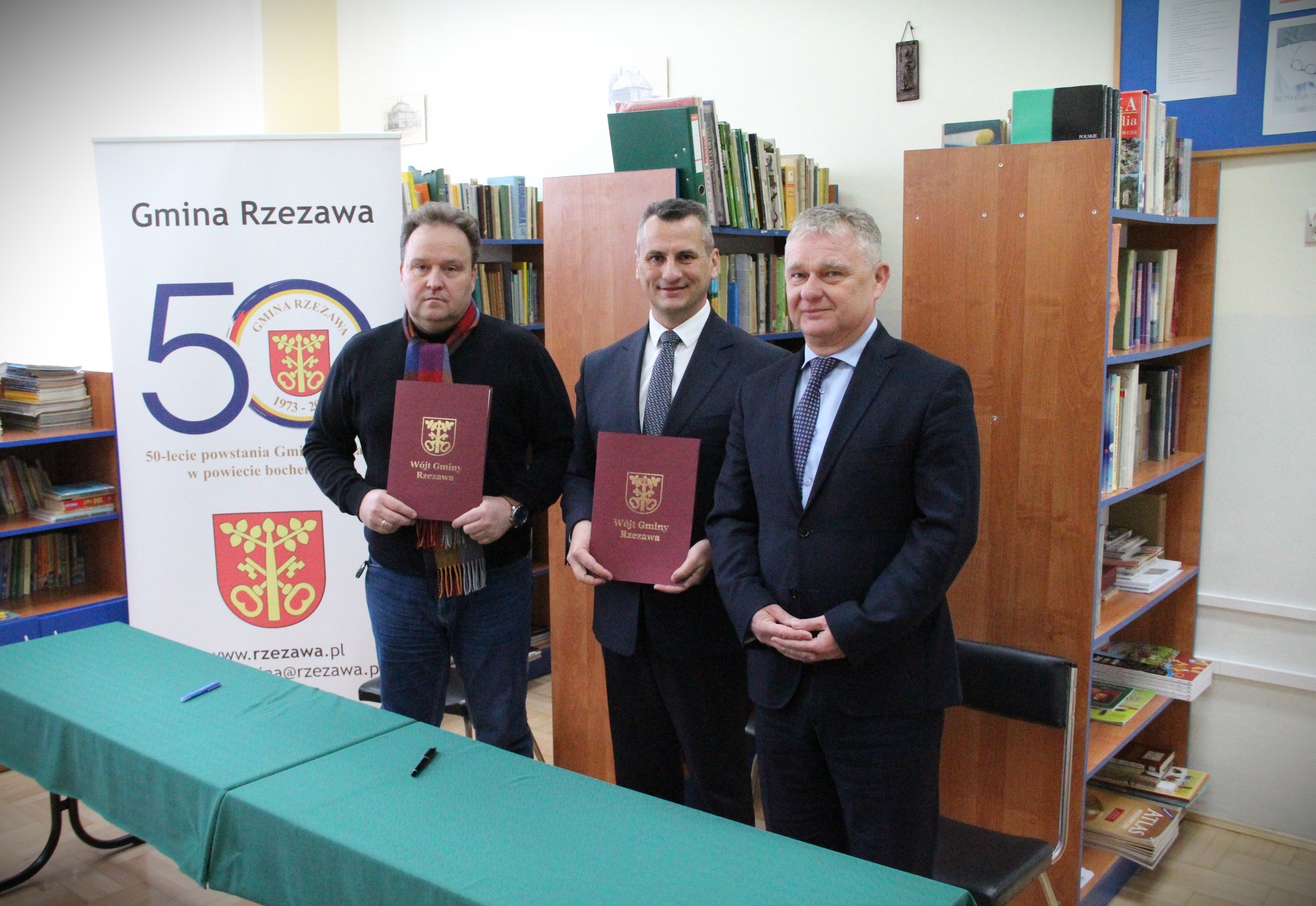 Podpisanie umów na opracowanie dokumentacji projektowych odbyło się 8 lutego w szkołach, przy których powstaną nowoczesne boiska sportowe. W ich podpisaniu wzięli udział: Wójt Gminy Rzezawa Mariusz Palej, Wykonawca inwestycji oraz Dyrektorzy ZS-P w Dąbrówce i PSP w Okulicach.