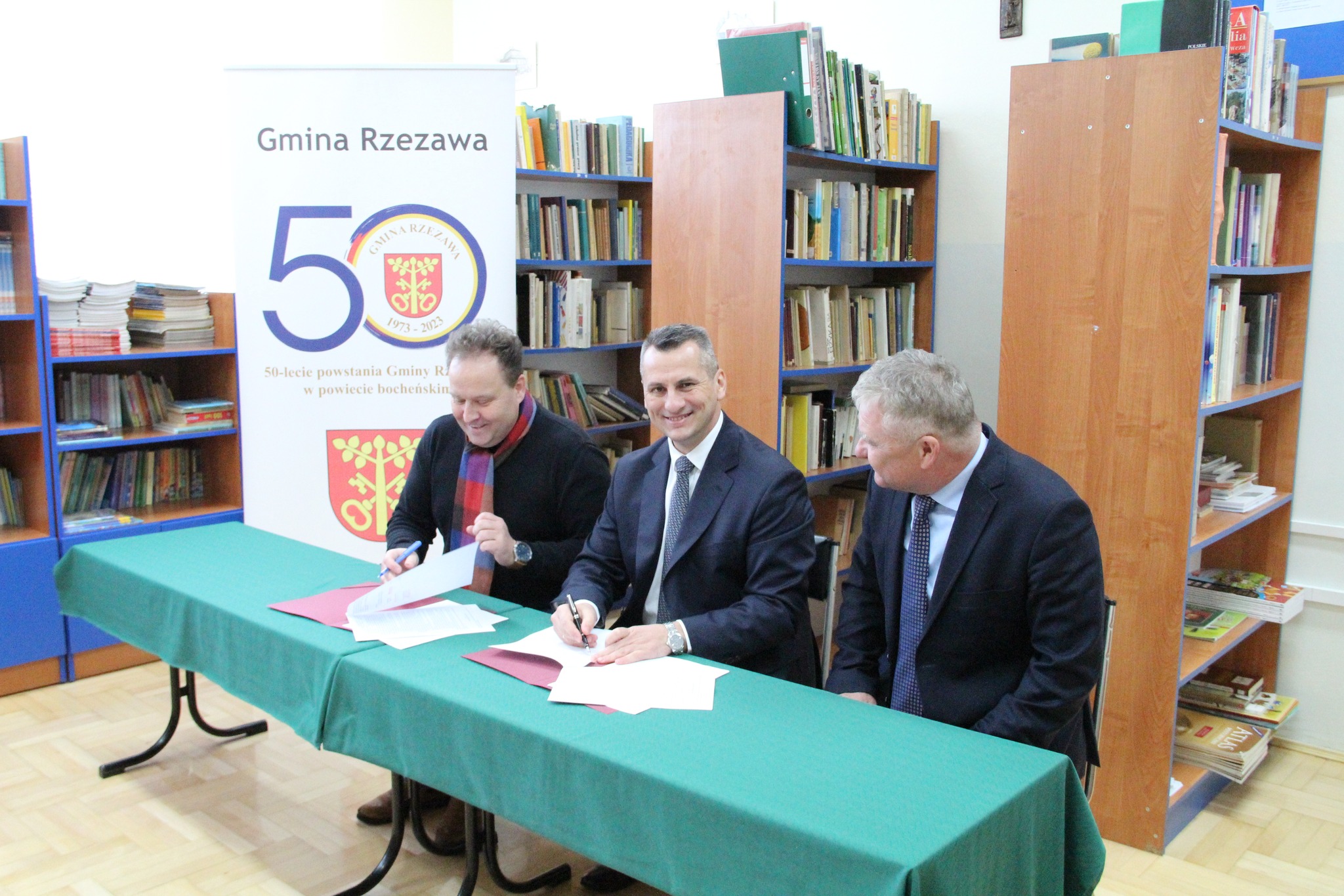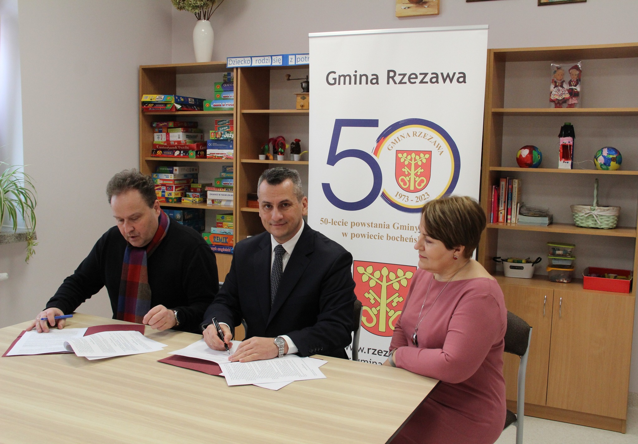 Podpisanie umów na opracowanie dokumentacji projektowych odbyło się 8 lutego w szkołach, przy których powstaną nowoczesne boiska sportowe. W ich podpisaniu wzięli udział: Wójt Gminy Rzezawa Mariusz Palej, Wykonawca inwestycji oraz Dyrektorzy ZS-P w Dąbrówce i PSP w Okulicach.
