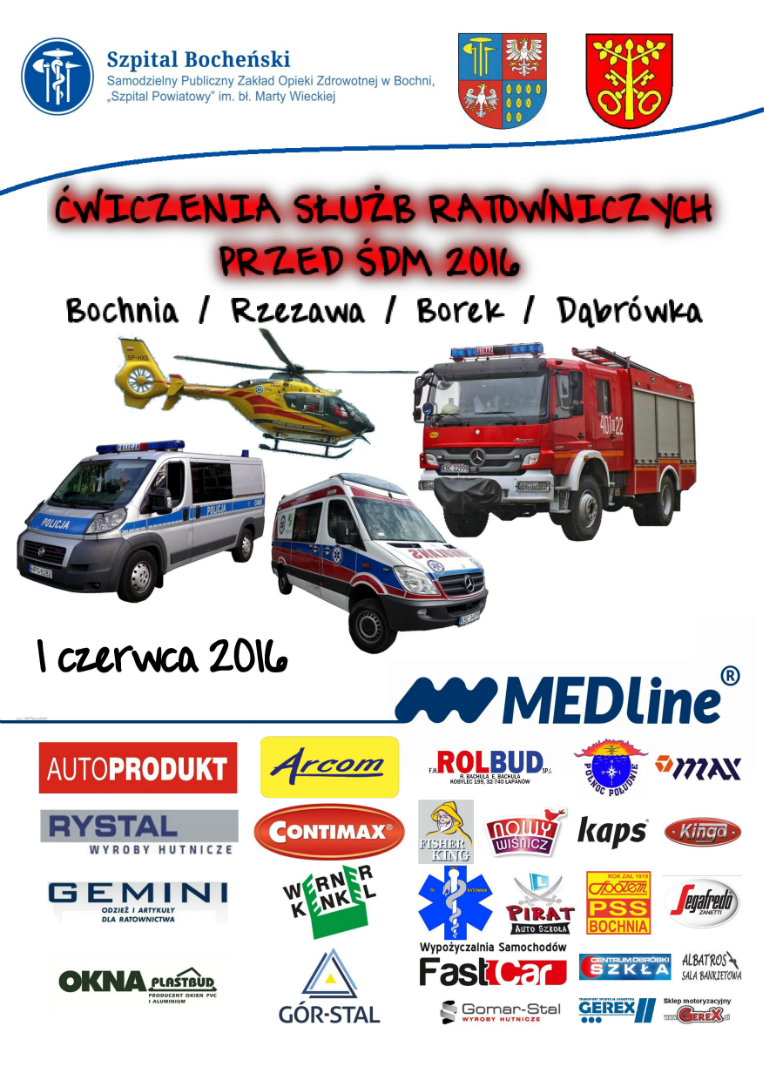 W dniu 01 czerwca 2016 r. w Dąbrówce z inicjatywy Samodzielnego Publicznego Zespołu Opieki Zdrowotnej Szpitala Powiatowego w Bochni, Związku Zawodowego Pracowników Ratownictwa Medycznego przy S.P. Z.O.Z. w Bochni, zostaną przeprowadzone ćwiczenia zespołów ratownictwa medycznego oraz służb współdziałania / Komendy Powiatowej Państwowej Straży Pożarnej w Bochni, Komendy Powiatowej Policji w Bochni/, w które włączy się również Gmina Rzezawa.