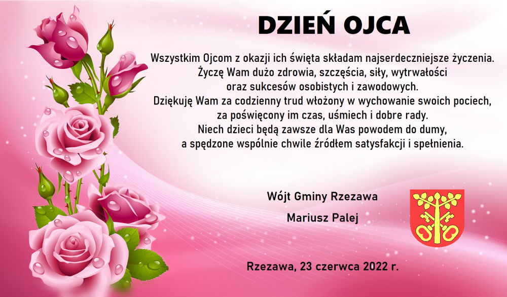 Wszystkim Ojcom z okazji ich święta składam najserdeczniejsze życzenia. Życzę Wam dużo zdrowia, szczęścia, siły, wytrwałości oraz sukcesów osobistych i zawodowych. Dziękuję Wam za codzienny trud włożony w wychowanie swoich pociech, za poświęcony im czas, uśmiech i dobre rady. Niech dzieci będą zawsze dla Was powodem do dumy, a spędzone wspólnie chwile źródłem satysfakcji i spełnienia.