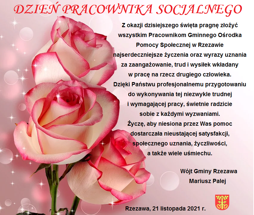 Z okazji dzisiejszego święta pragnę złożyć wszystkim Pracownikom Gminnego Ośrodka Pomocy Społecznej w Rzezawie najserdeczniejsze życzenia oraz wyrazy uznania za zaangażowanie, trud i wysiłek wkładany w pracę na rzecz drugiego człowieka. Dzięki Państwu profesjonalnemu przygotowaniu do wykonywania tej niezwykle trudnej i wymagającej pracy, świetnie radzicie sobie z każdymi wyzwaniami.