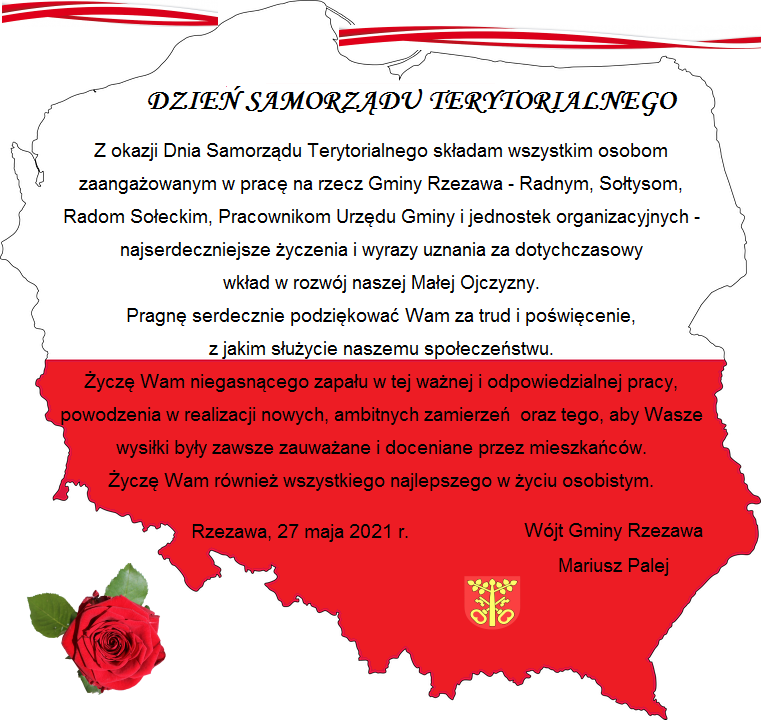 Z okazji Dnia Samorządu Terytorialnego składam wszystkim osobom zaangażowanym w pracę na rzecz Gminy Rzezawa - Radnym, Sołtysom, Radom Sołeckim, Pracownikom Urzędu Gminy i jednostek organizacyjnych - najserdeczniejsze życzenia i wyrazy uznania za dotychczasowy wkład w rozwój naszej Małej Ojczyzny. Pragnę serdecznie podziękować Wam za trud i poświęcenie, z jakim służycie naszemu społeczeństwu. Życzę Wam niegasnącego zapału w tej ważnej i odpowiedzialnej pracy, powodzenia w realizacji nowych, ambitnych zamierzeń oraz tego, aby Wasze wysiłki były zawsze zauważane i doceniane przez mieszkańców. Życzę Wam również wszystkiego najlepszego w życiu osobistym.