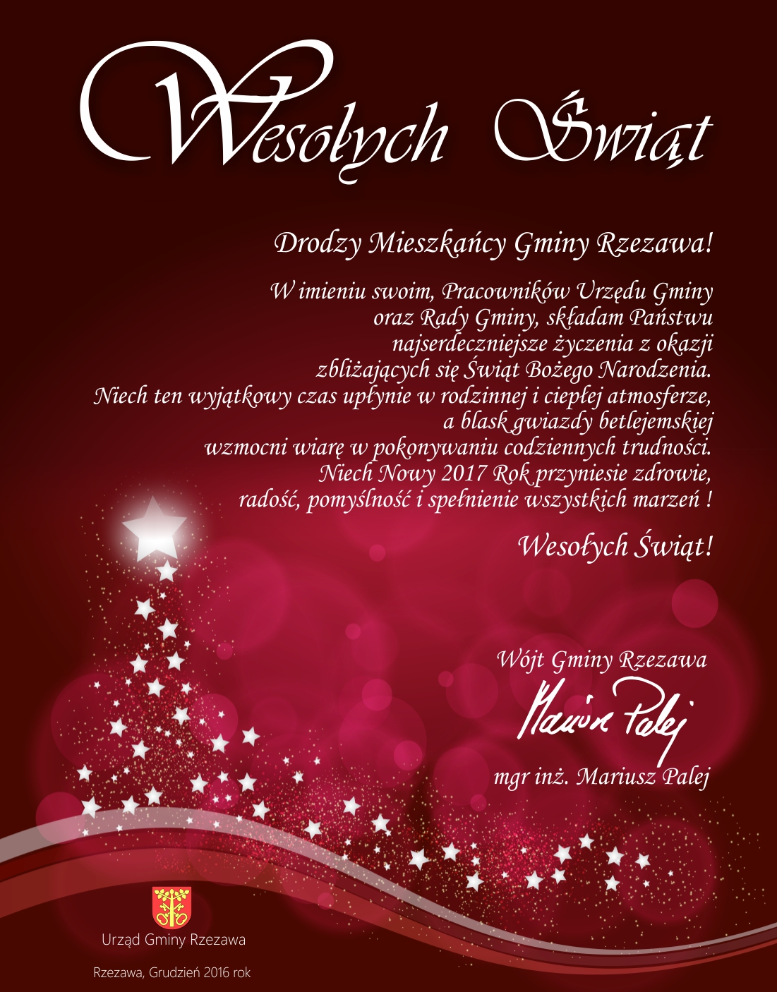 W imieniu swoim, Pracowników Urzędu Gminy oraz Rady Gminy, składam Państwu najserdeczniejsze życzenia z okazji zbliżających się Świąt Bożego Narodzenia. Niech ten wyjątkowy czas upłynie w rodzinnej i ciepłej atmosferze, a blask gwiazdy betlejemskiej wzmocni wiarę w pokonywaniu codziennych trudności. Niech Nowy 2017 Rok przyniesie zdrowie, radość, pomyślność i spełnienie wszystkich marzeń !