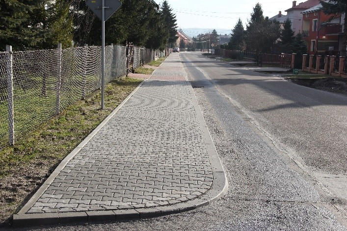 (Zakres prac: Budowa prawo (ok. 651 mb) i lewo stronnego chodnika (ok. 57 mb), Instalacja odwadniająca, Budowa i przebudowa zjazdów, Rozbudowa skrzyżowania, Rozbiórka