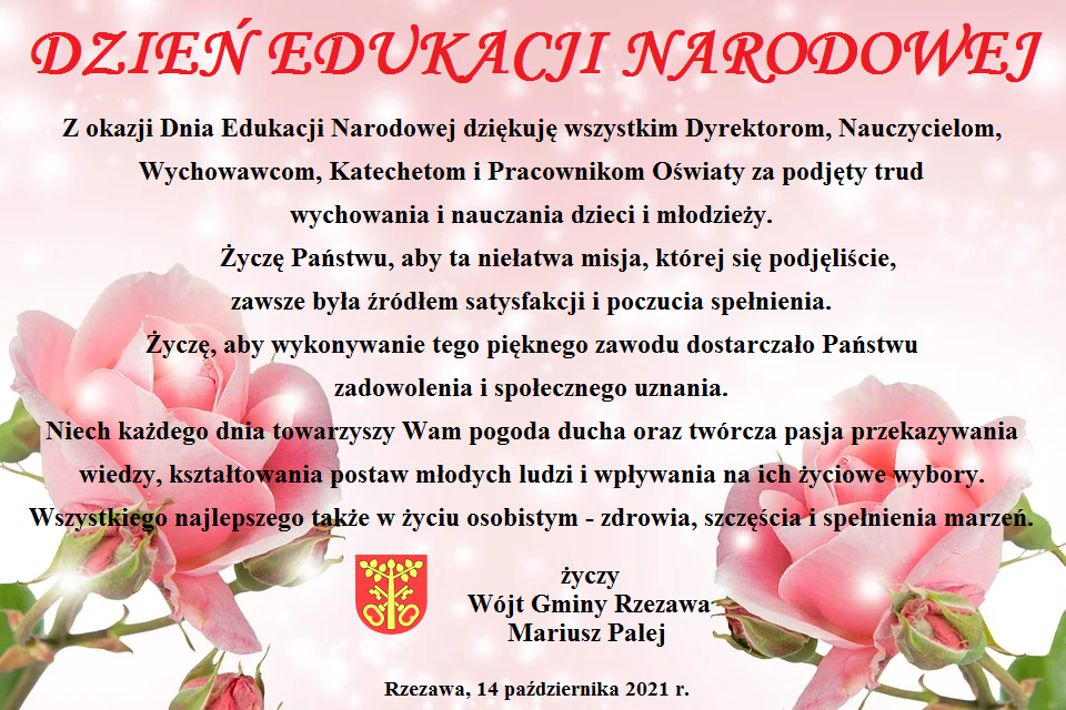 Z okazji Dnia Edukacji Narodowej dziękuję wszystkim Dyrektorom, Nauczycielom, Wychowawcom, Katechetom i Pracownikom Oświaty za podjęty trud wychowania i nauczania dzieci i młodzieży.