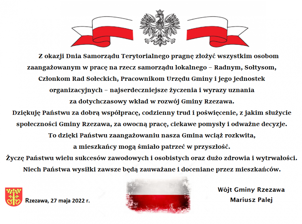 Z okazji Dnia Samorządu Terytorialnego pragnę złożyć wszystkim osobom zaangażowanym w pracę na rzecz samorządu lokalnego – Radnym, Sołtysom, Członkom Rad Sołeckich, Pracownikom Urzędu Gminy i jego jednostek organizacyjnych – najserdeczniejsze życzenia i wyrazy uznania za dotychczasowy wkład w rozwój Gminy Rzezawa. Dziękuję Państwu za dobrą współpracę, codzienny trud i poświęcenie, z jakim służycie społeczności Gminy Rzezawa, za owocną pracę, ciekawe pomysły i odważne decyzje. To dzięki Państwu zaangażowaniu nasza Gmina wciąż rozkwita, a mieszkańcy mogą śmiało patrzeć w przyszłość. Życzę Państwu wielu sukcesów zawodowych i osobistych oraz dużo zdrowia i wytrwałości. Niech Państwa wysiłki zawsze będą zauważane i doceniane przez mieszkańców.