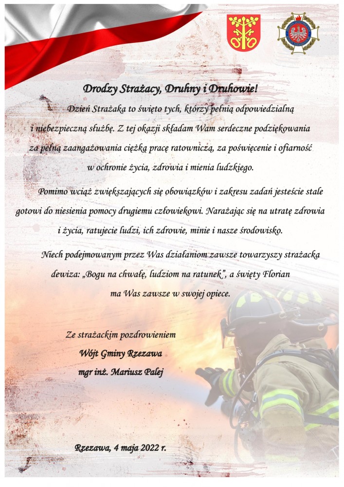 Dzień Strażaka to święto tych, którzy pełnią odpowiedzialną i niebezpieczną służbę. Z tej okazji składam Wam serdeczne podziękowania za pełną zaangażowania ciężką pracę ratowniczą, za poświęcenie i ofiarność w ochronie życia, zdrowia i mienia ludzkiego. Pomimo wciąż zwiększających się obowiązków i zakresu zadań jesteście stale gotowi do niesienia pomocy drugiemu człowiekowi. Narażając się na utratę zdrowia i życia, ratujecie ludzi, ich zdrowie, minie i nasze środowisko. Niech podejmowanym przez Was działaniom zawsze towarzyszy strażacka dewiza: „Bogu na chwałę, ludziom na ratunek”, a święty Florian ma Was zawsze w swojej opiece.
