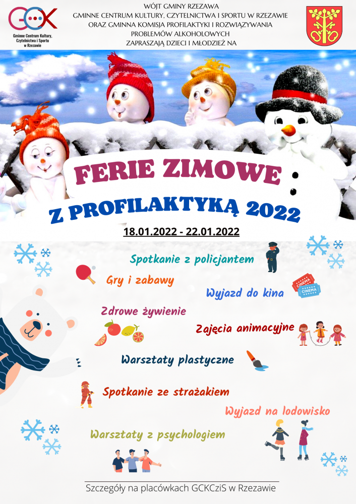Wójt Gminy Rzezawa, Gminne Centrum Kultury, Czytelnictwa i Sportu w Rzezawie oraz Gminna Komisja Profilaktyki i Rozwiązywania Problemów Alkoholowych zapraszają dzieci i młodzież na FERIE ZIMOWE Z PROFILAKTYKĄ 2022. Na uczestników zajęć czeka mnóstwo atrakcji. Szczegółowe informacje w placówkach GCKCZiS w Rzezawie.