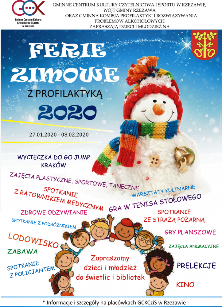 Gminne Centrum Kultury Czytelnictwa i Sportu w Rzezawie, Wójt Gminy Rzezawa oraz Gminna Komisja Profilaktyki i Rozwiązywania Problemów Alkoholowych zapraszają dzieci i młodzież na Ferie Zimowe z profilaktyką. Na uczestników zajęć czeka mnóstwo atrakcji. Szczegółowe informacje w placówkach GCKCZiS w Rzezawie.