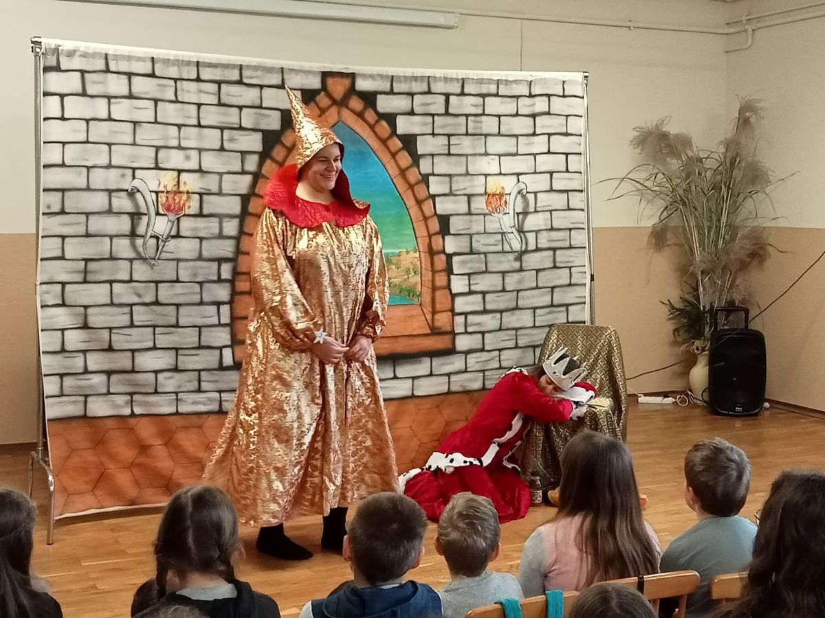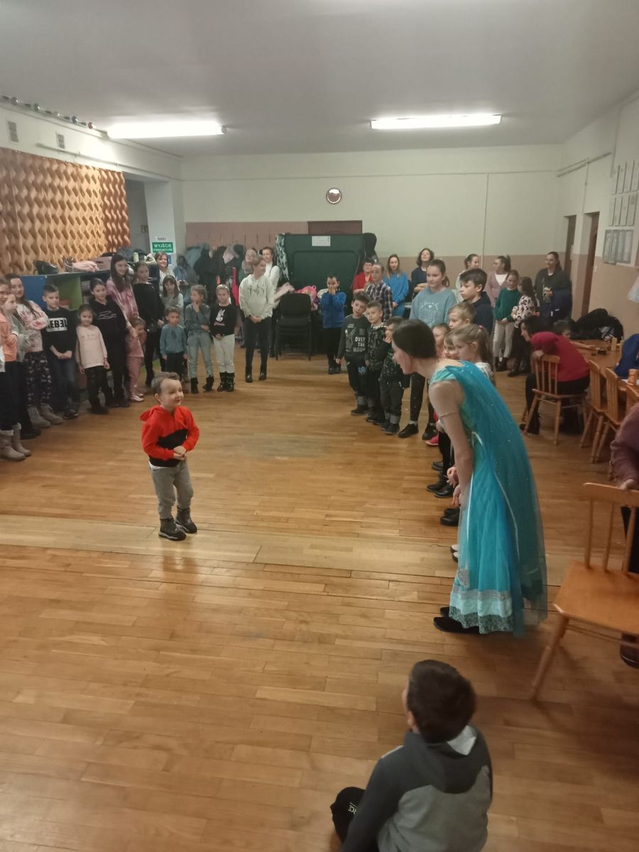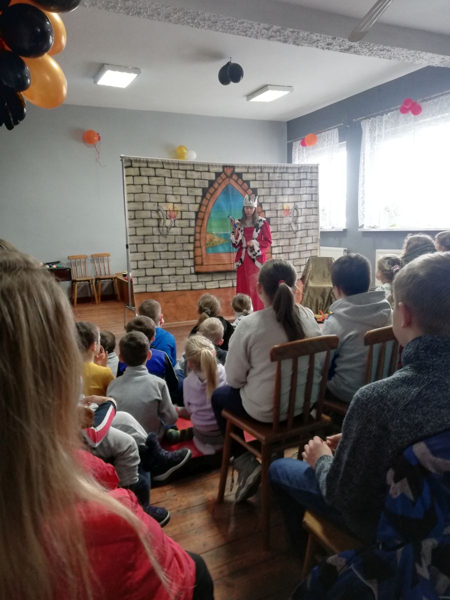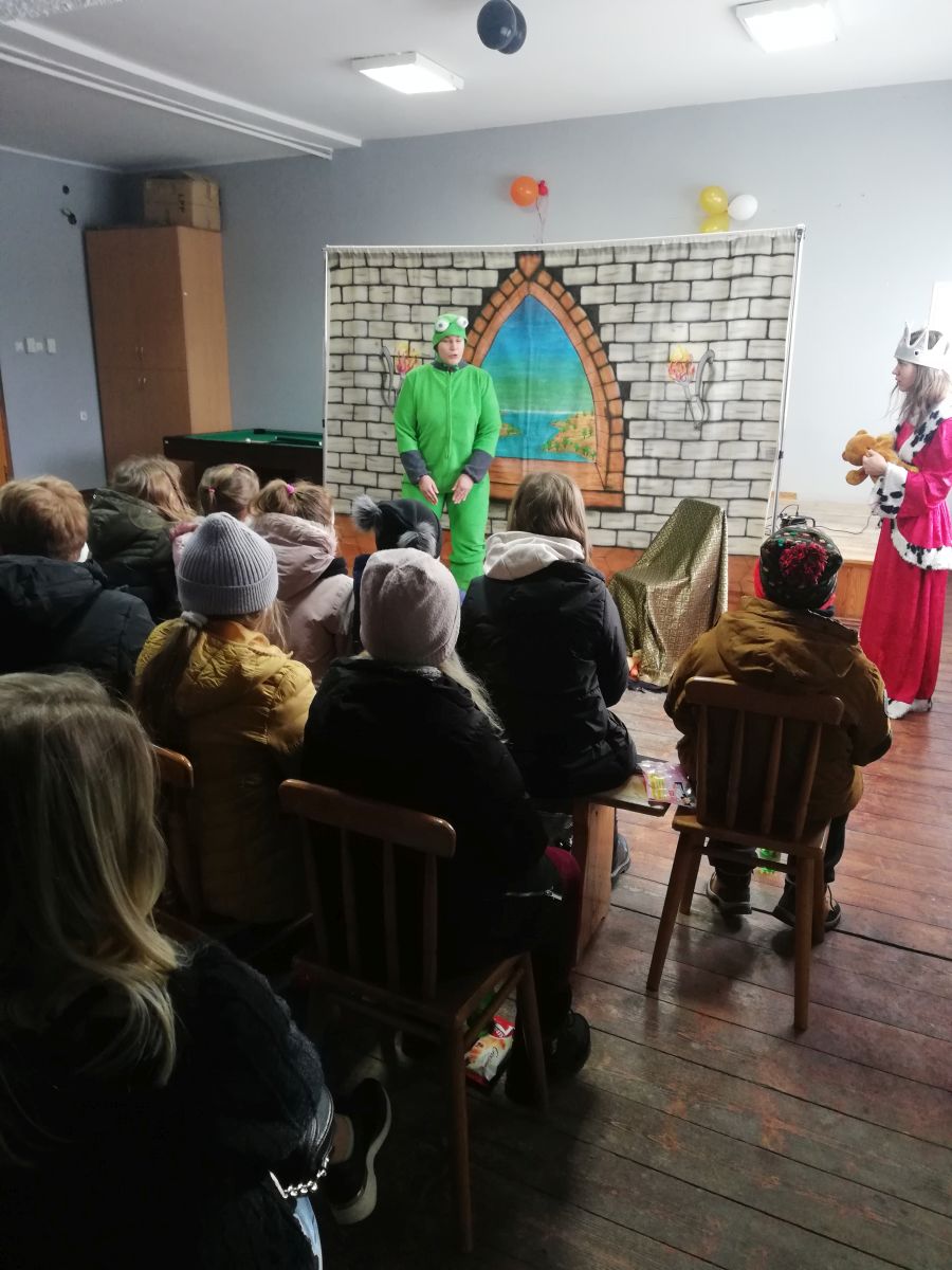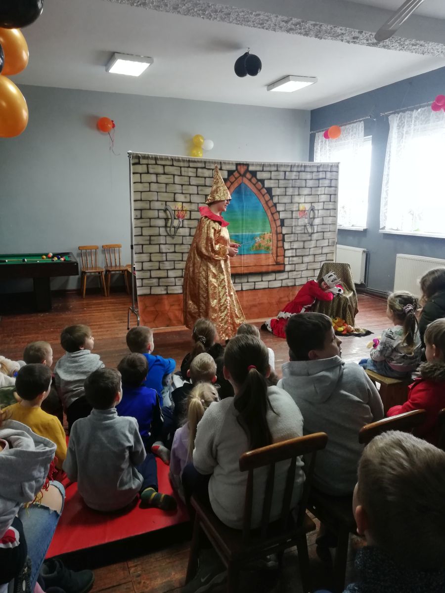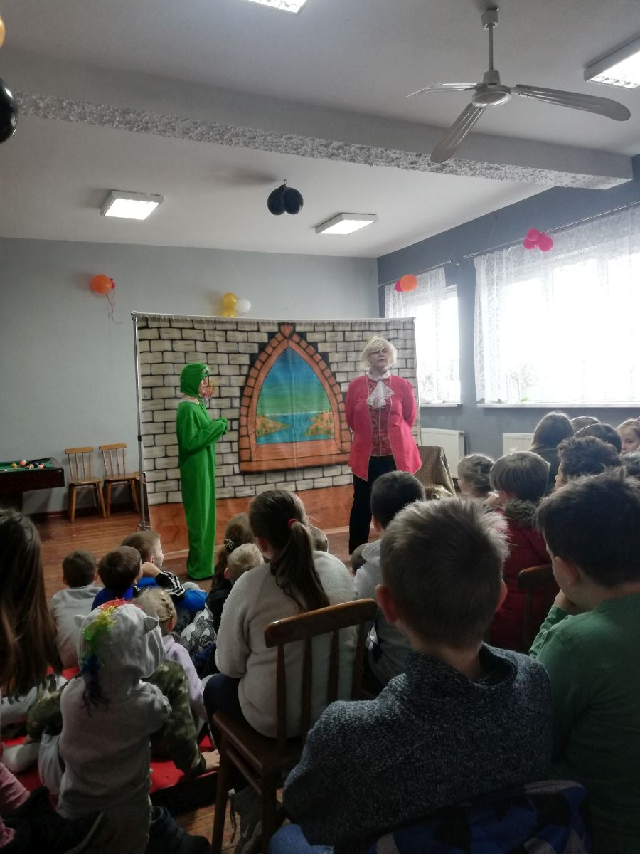 Kolejnego dnia ferii w naszej gminie gościł Teatr Edukacji i Profilaktyki „MASKA” z bajką profilaktyczno- edukacyjną, pt. ,,Złośliwości jej Królewskiej Mości”. Przedstawienie opowiadało o zasadach dobrego wychowania. Dzieci bardzo zaangażowały się w losy księżniczki, podpowiadały bohaterce, co ma robić i jak ma się zachowywać w określonych sytuacjach, aby stać się lepszą osobą. Po spektaklu dzieci wzięły udział w zabawach animacyjnych „ Kraina śniegu zabawy z Elizą i bałwankiem” prowadzonych przez aktorów teatru ,,MASKA’’.
