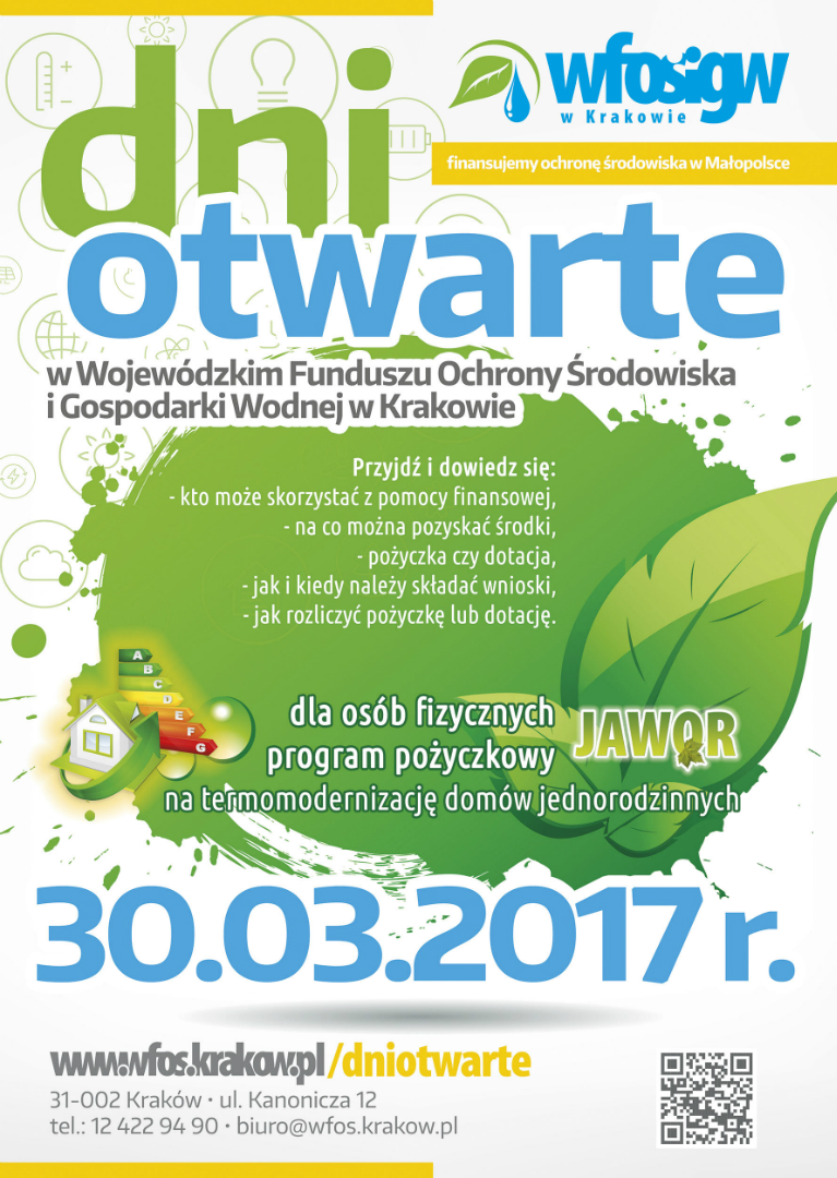 w imieniu Prezesa Zarządu Wojewódzkiego Funduszu Ochrony Środowiska i Gospodarki Wodnej w Krakowie - Pani Małgorzaty Mrugały, serdecznie zapraszamy wszystkich zainteresowanych na kolejny Dzień Otwarty, który tradycyjnie odbędzie się w ostatni czwartek miesiąca, czyli 30 marca 2017 r. w godzinach 8.00-15.00 w siedzibie Funduszu (parter, ul. Kanonicza 12).