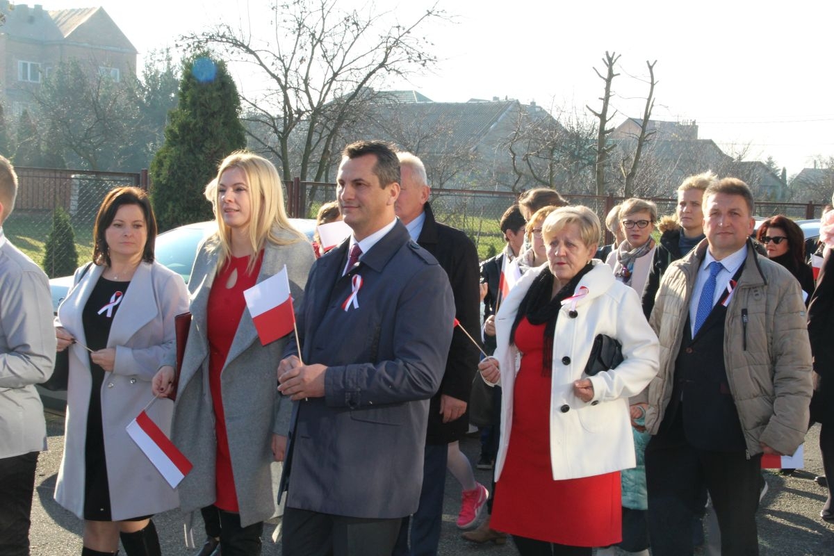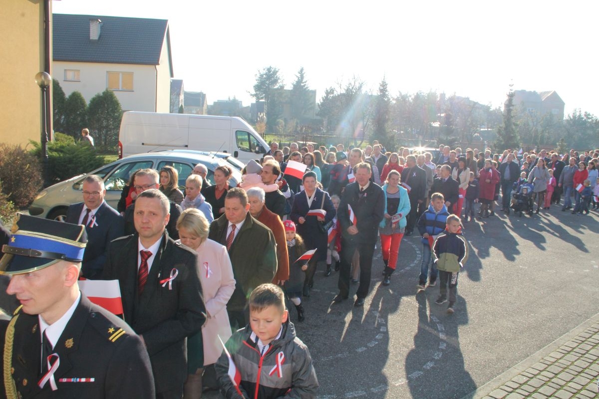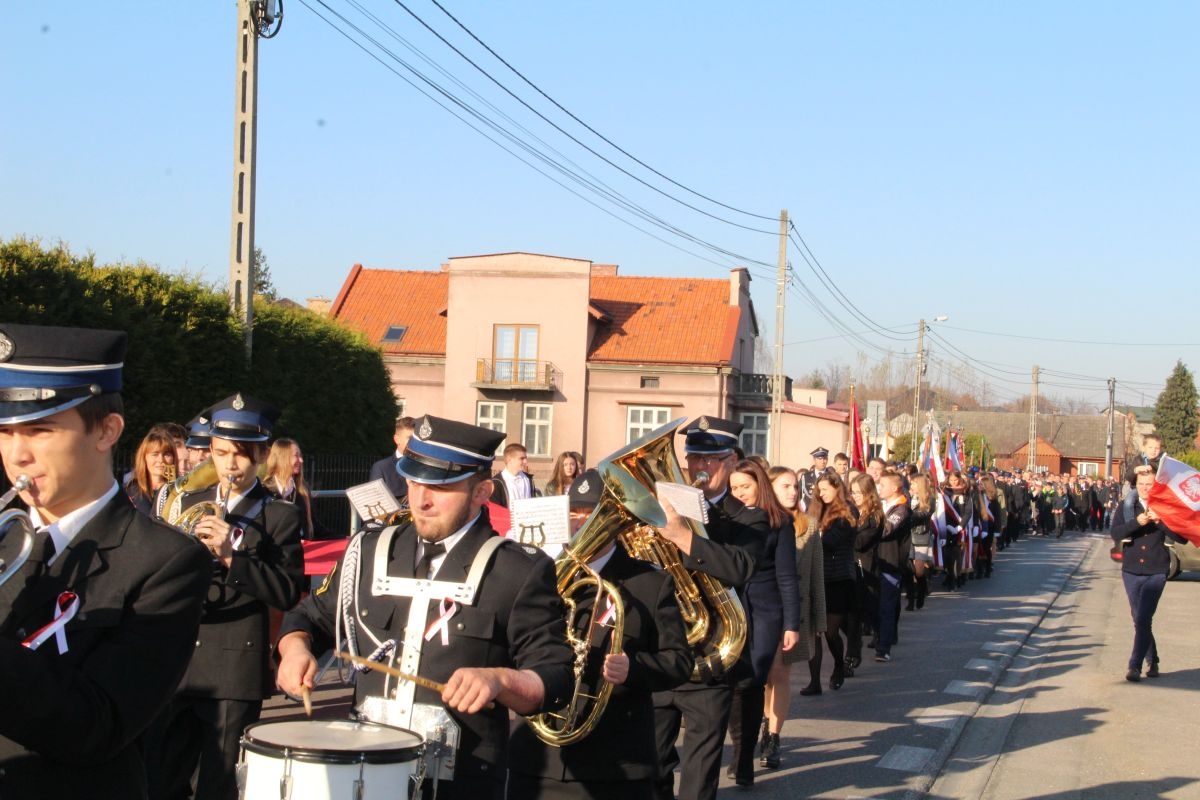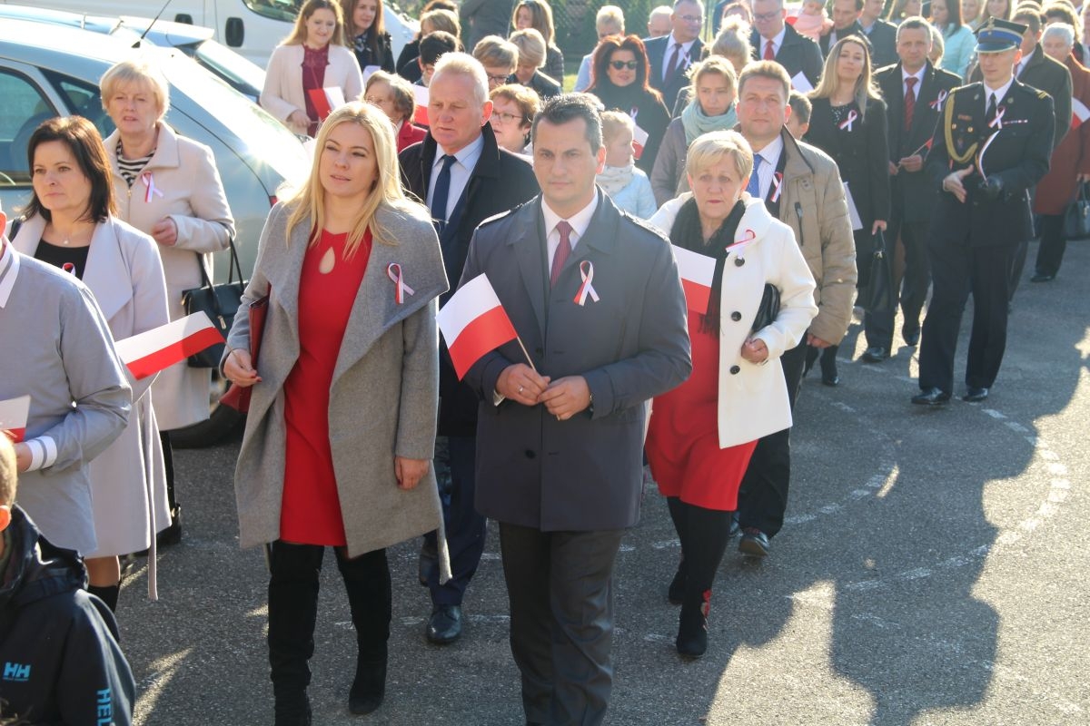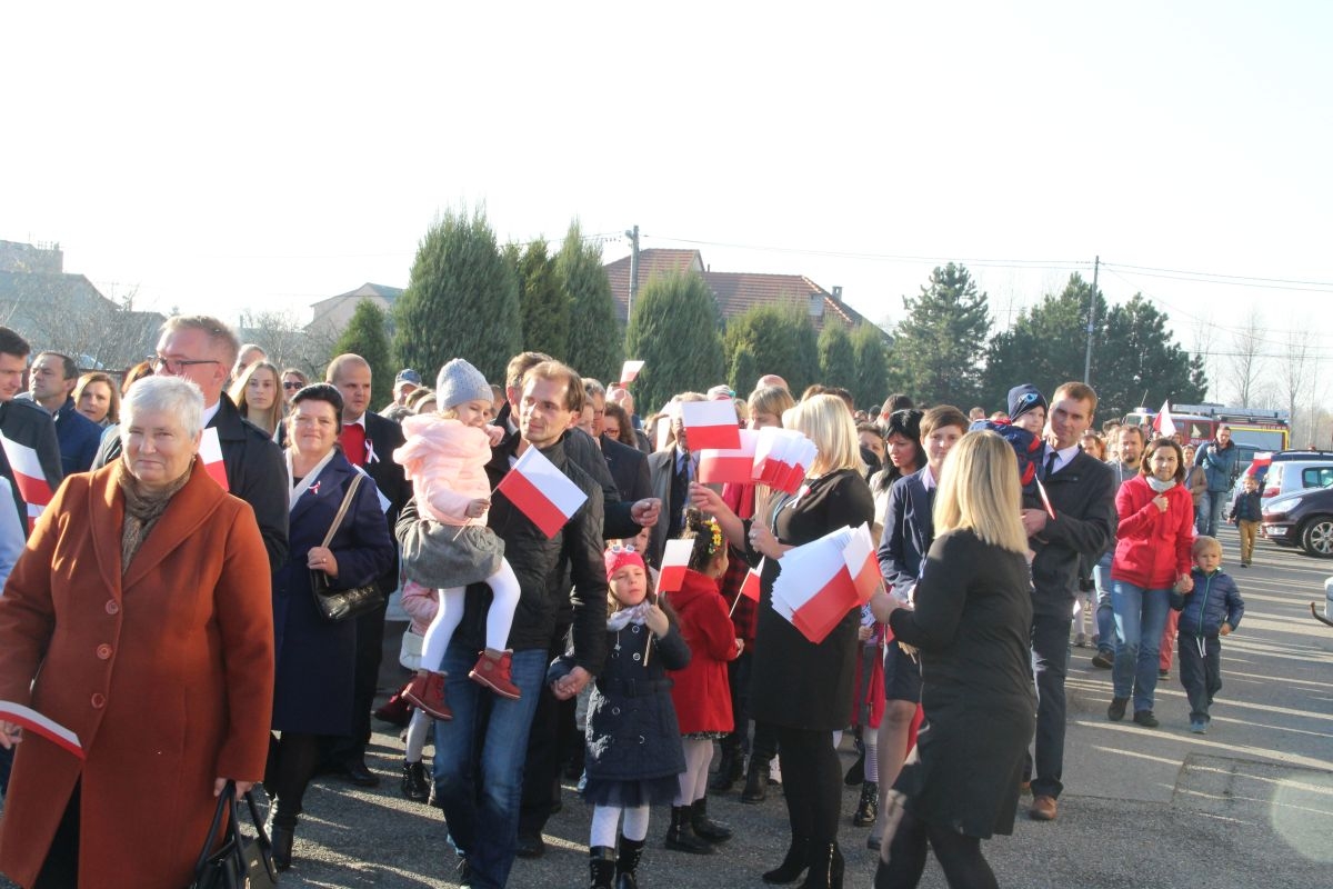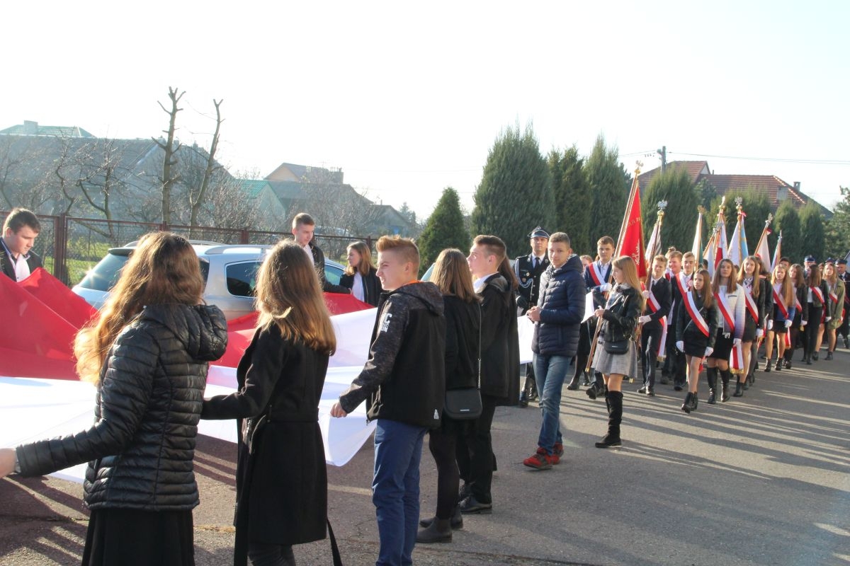 Po zakończeniu liturgii władze samorządowe, delegacje szkół i jednostek OSP wraz z pocztami sztandarowymi, a także przybyli mieszkańcy przy akompaniamencie Orkiestry Dętej z Okulic przemaszerowali do budynku Publicznej Szkoły Podstawowej w Rzezawie, gdzie miały miejsce dalsze uroczystości związane z celebracją Święta Niepodległości. W marszu wzięło udział w sumie kilkaset osób. Wiele z nich miało ze sobą biało-czerwone flagi. Największa z nich miała kilka metrów długości i była niesiona przez młodzież z terenu gminy Rzezawa.