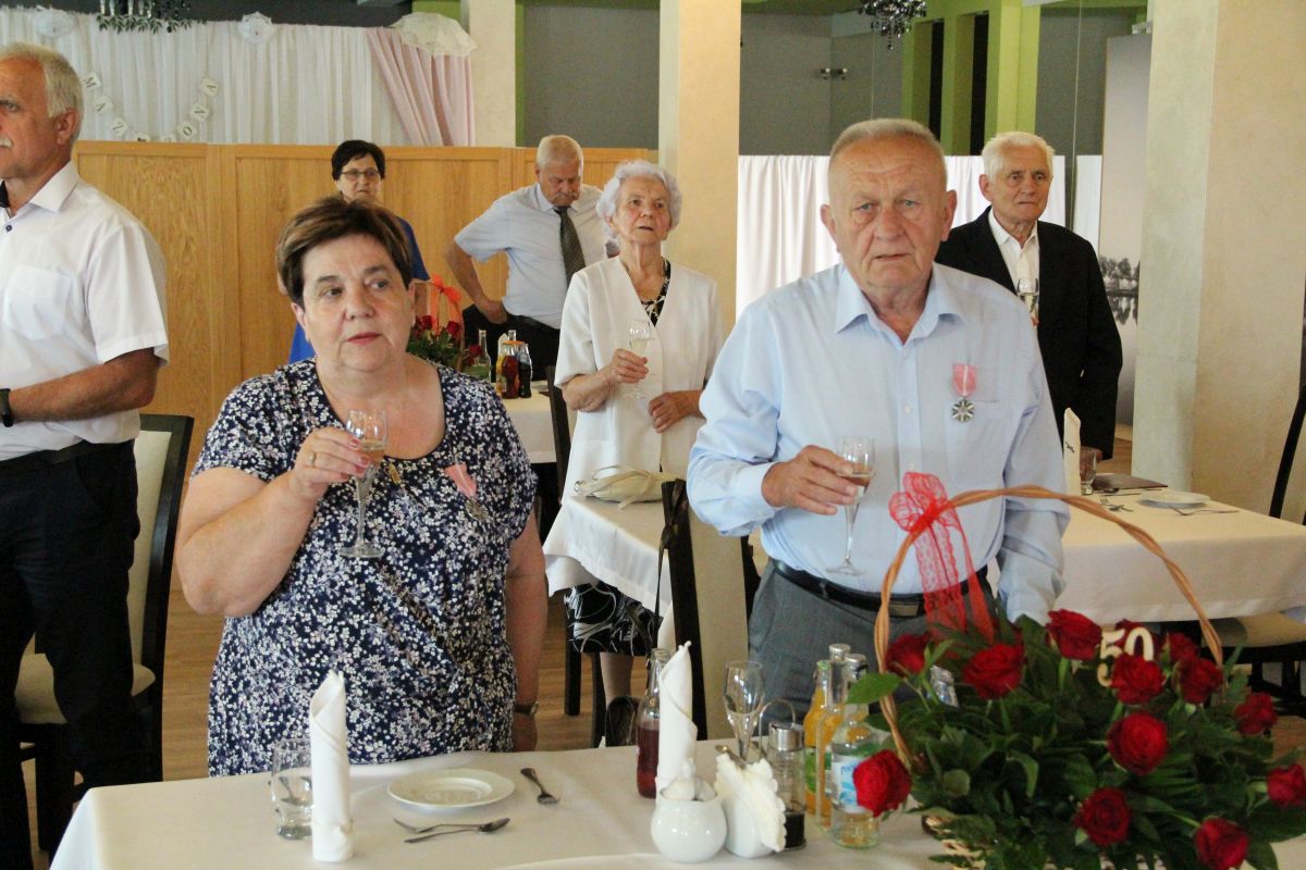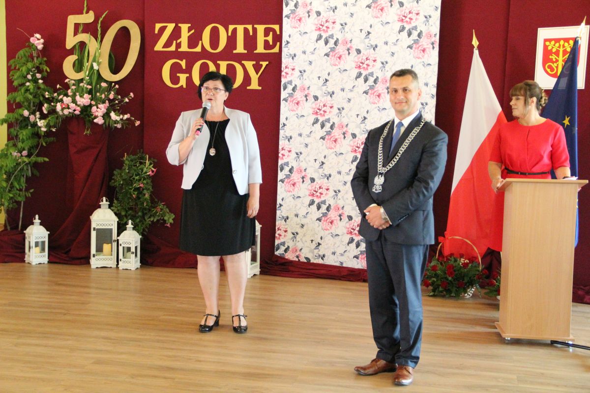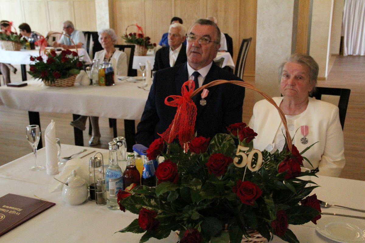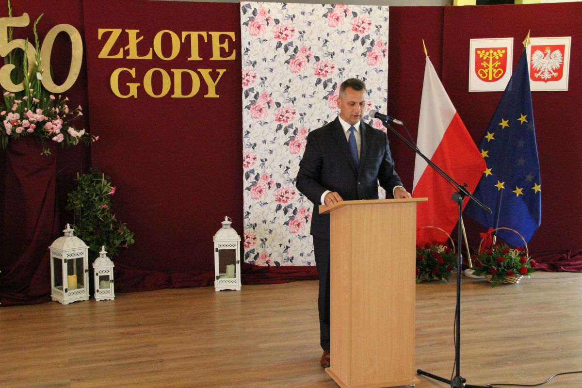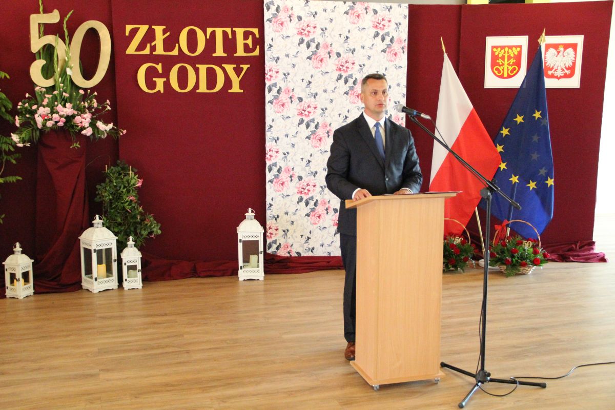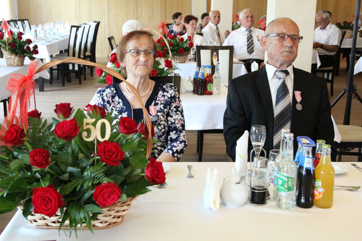 Wójt podkreślał także, że Jubilaci są wspaniałym wzorem dla innych, szczególnie dla młodych małżeństw. - Pół wieku temu ślubowaliście przed sobą i Bogiem miłość, wierność, uczciwość małżeńską oraz wspólne życie aż do śmierci. Państwa obecność tutaj drodzy Jubilaci dowozi, że dochowaliście tej przysięgi. Przez te wszystkie lata małżeństwa z całą pewnością przeżyliście wiele niezwykle pięknych, cudownych, podniosłych i niesamowitych chwil. Zdarzały się jednak zapewne także gorsze momenty, chwile ciężkie, a być może nawet i tragiczne. Bez względu na zaistniałą sytuację byliście jednak zawsze ze sobą i wzajemnie się wspieraliście. Byliście ze sobą na dobre i na złe. Bo taka właśnie powinna być miłość. Nie wystarczy dzielić z kimś życia, kiedy wszystko jest piękne, człowiek jest młody, zdrowy, nie ma żadnych zmartwień, ale także w sytuacjach, kiedy spotykają nas kłopoty i różnego rodzaju problemy. Prawdziwe, zgodne i dobre małżeństwo to takie, które przetrwa wszystkie życiowe zawieruchy, by po latach zyskać wzajemne zrozumienie, tolerancję i szacunek - podkreślał Mariusz Palej.