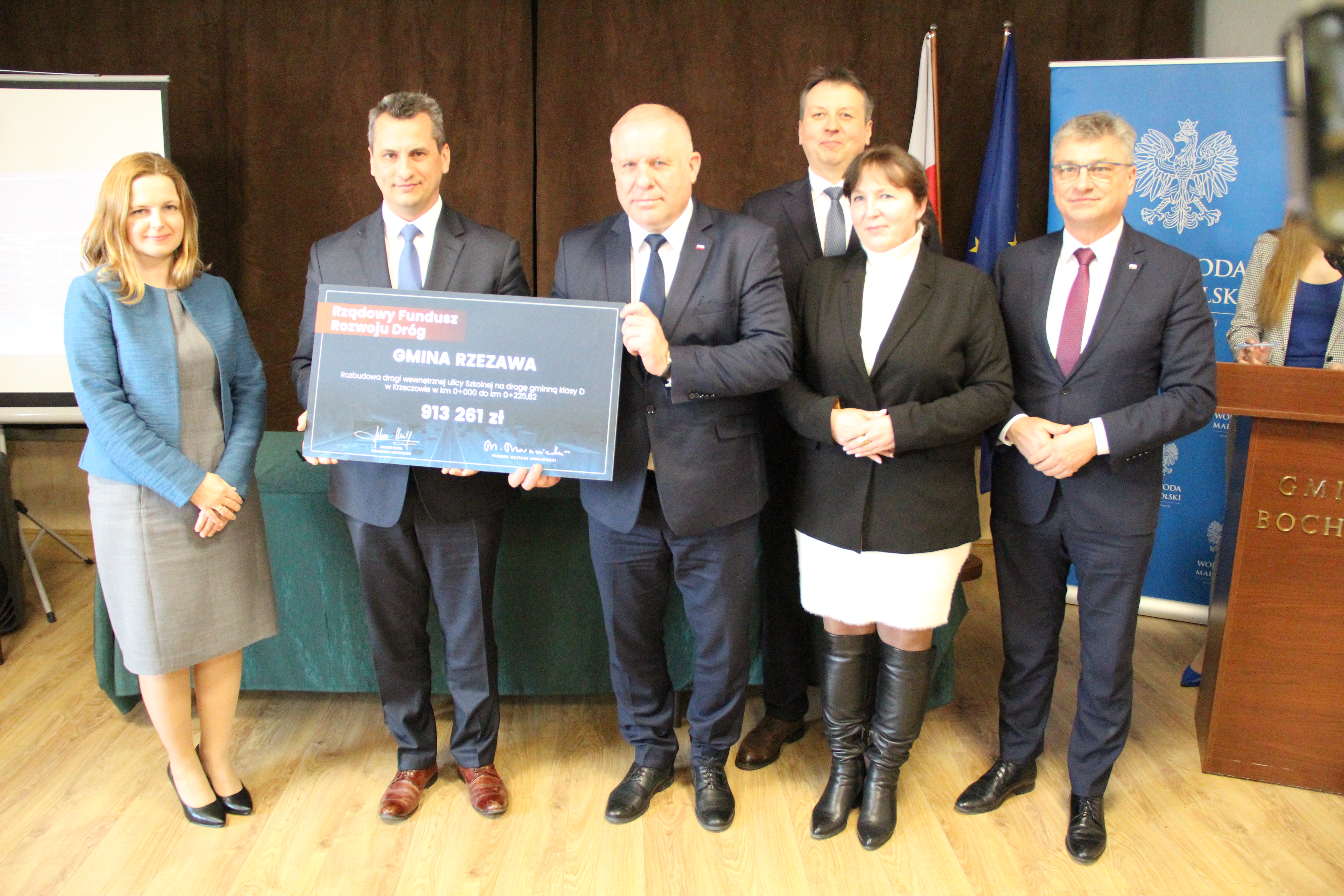 25 marca Wójt Gminy Rzezawa Mariusz Palej odebrał z rąk Wicewojewody Małopolskiego Ryszarda Pagacza symboliczny czek w wysokości ponad 913 tys. zł na rozbudowę ulicy Szkolnej w Krzeczowie. To niezwykle ważna inwestycja, która będzie miała ogromny wpływ na poprawę bezpieczeństwa w tym miejscu.