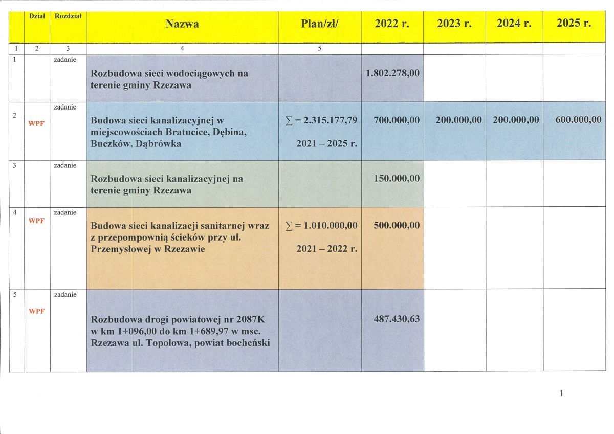 1. Rozbudowa sieci wodociągowych na trenie gminy Rzezawa - 1.802.278,00 zł;