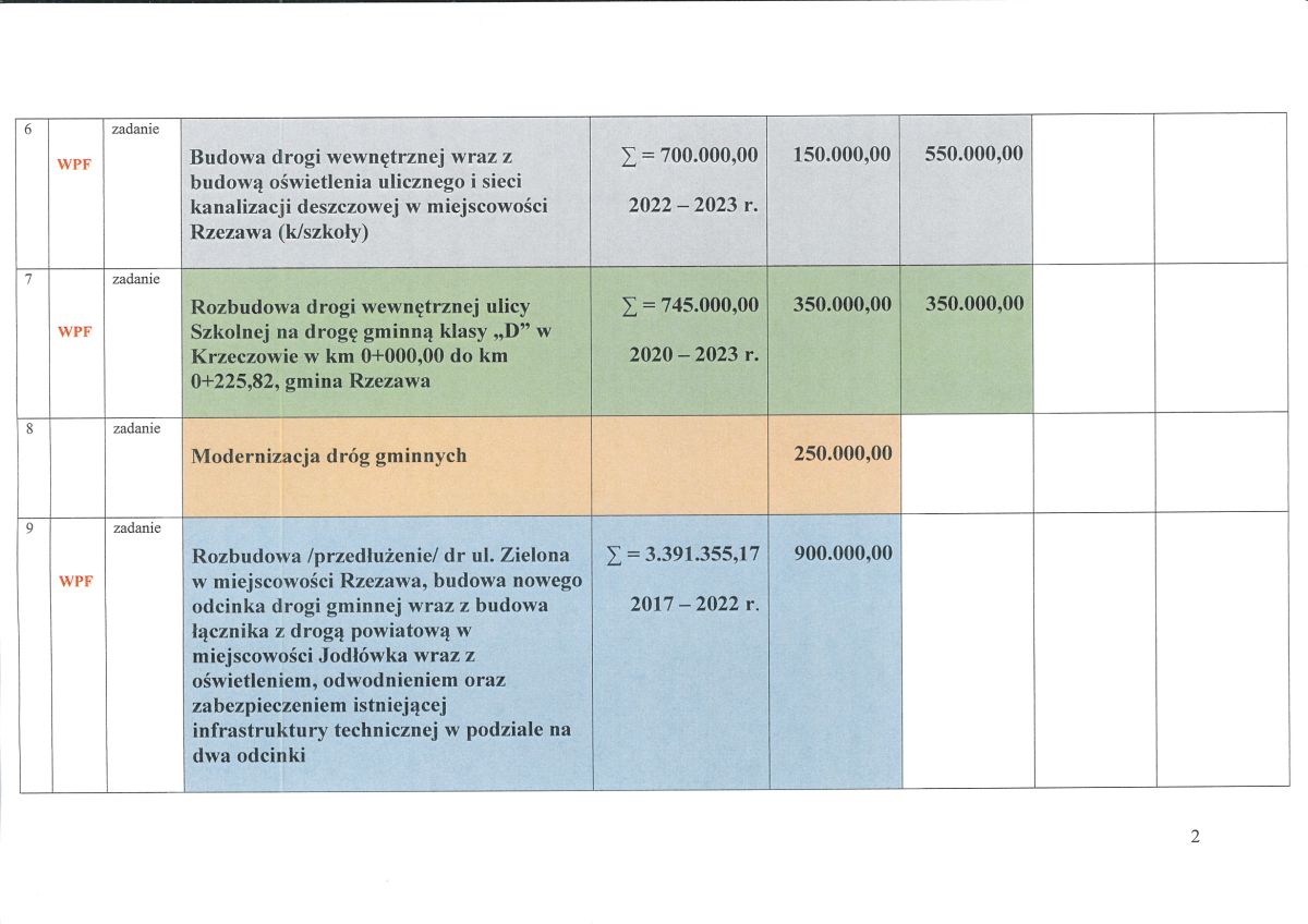 9. Rozbudowa /przedłużenie/ drogi ul. Zielona na odcinku od km 0+897,00 do km 0+979,25 w miejscowości Rzezawa, budowa nowego odcinka drogi gminnej od km 0+979,25 do km 1+510,00 wraz z budową łącznika z drogą powiatową Nr 1442K Krzeczów-Grądy w miejscowości Jodłówka wraz z oświetleniem, odwodnieniem oraz zabezpieczeniem istniejącej infrastruktury technicznej w podziale na dwa odcinki: 1) Budowa drogi gminnej od km 0+979,25 do km 1+510,00 w miejscowości Jodłówka wraz z rozbudową drogi gminnej ul. Zielona nr K5800329 od km 0+897,00 do km 0+979,25 w miejscowości Rzezawa, gmina Rzezawa; 2)Budowa drogi gminnej od km 0+382,92 w miejscowości Jodłówka - 900.000,00 zł;