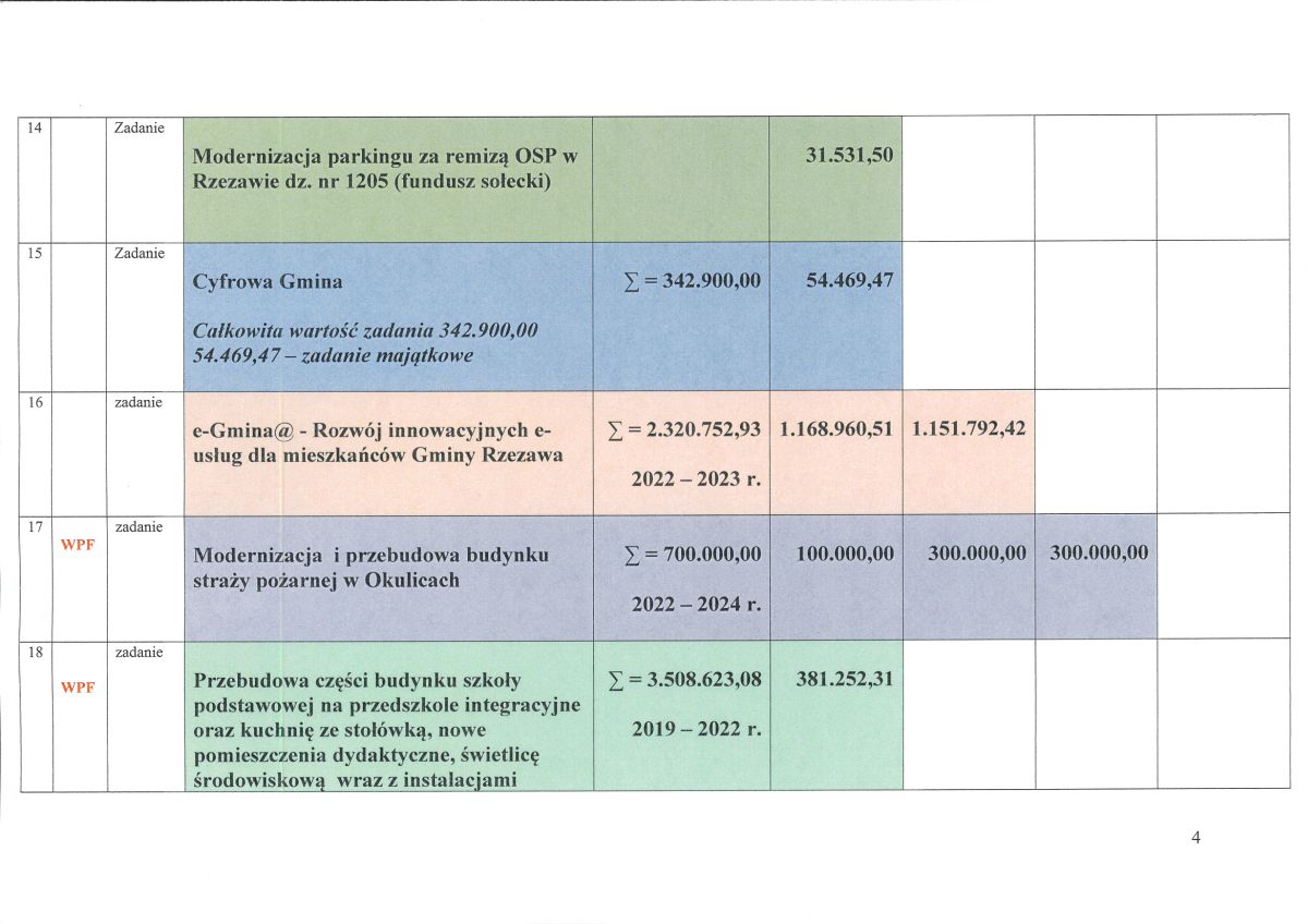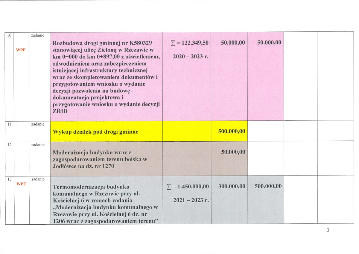 10. Rozbudowa drogi gminnej nr K580329 stanowiącej ulicę Zieloną w Rzezawie w km 0+000 do km 0+897,00 z oświetleniem, odwodnieniem oraz zabezpieczeniem istniejącej infrastruktury technicznej wraz ze skompletowaniem dokumentów i przygotowaniem wniosku o wydanie decyzji pozwolenia na budowę - dokumentacja projektowa i przygotowanie wniosku o w danie decyzji ZRID - 50.000,00 zł;