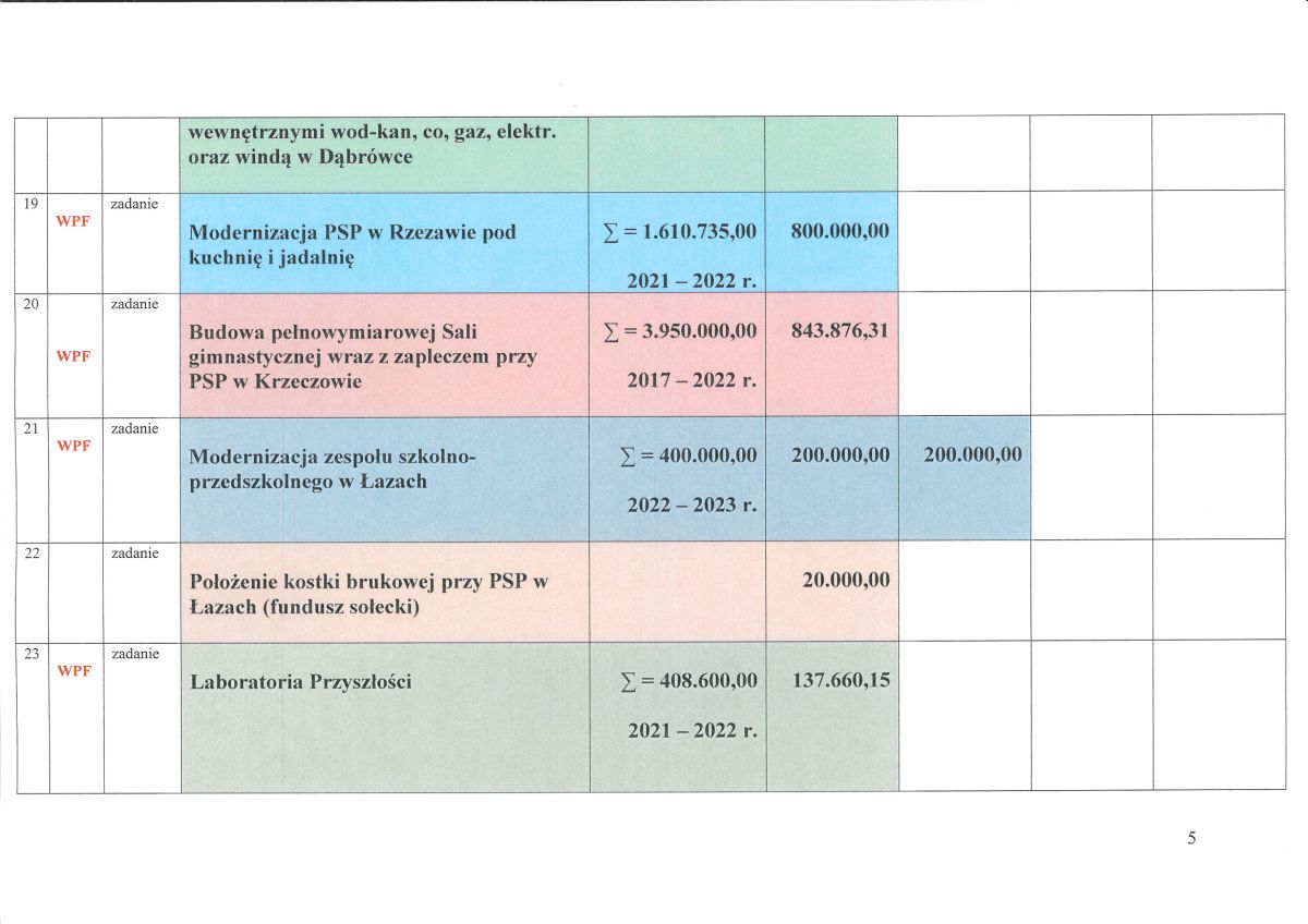 20. Budowa pełnowymiarowej sali gimnastycznej wraz z zapleczem przy Publicznej Szkole Podstawowej w Krzeczowie - finansowanie z funduszu przeciwdziałania COVID-19 - 843.876,31 zł;