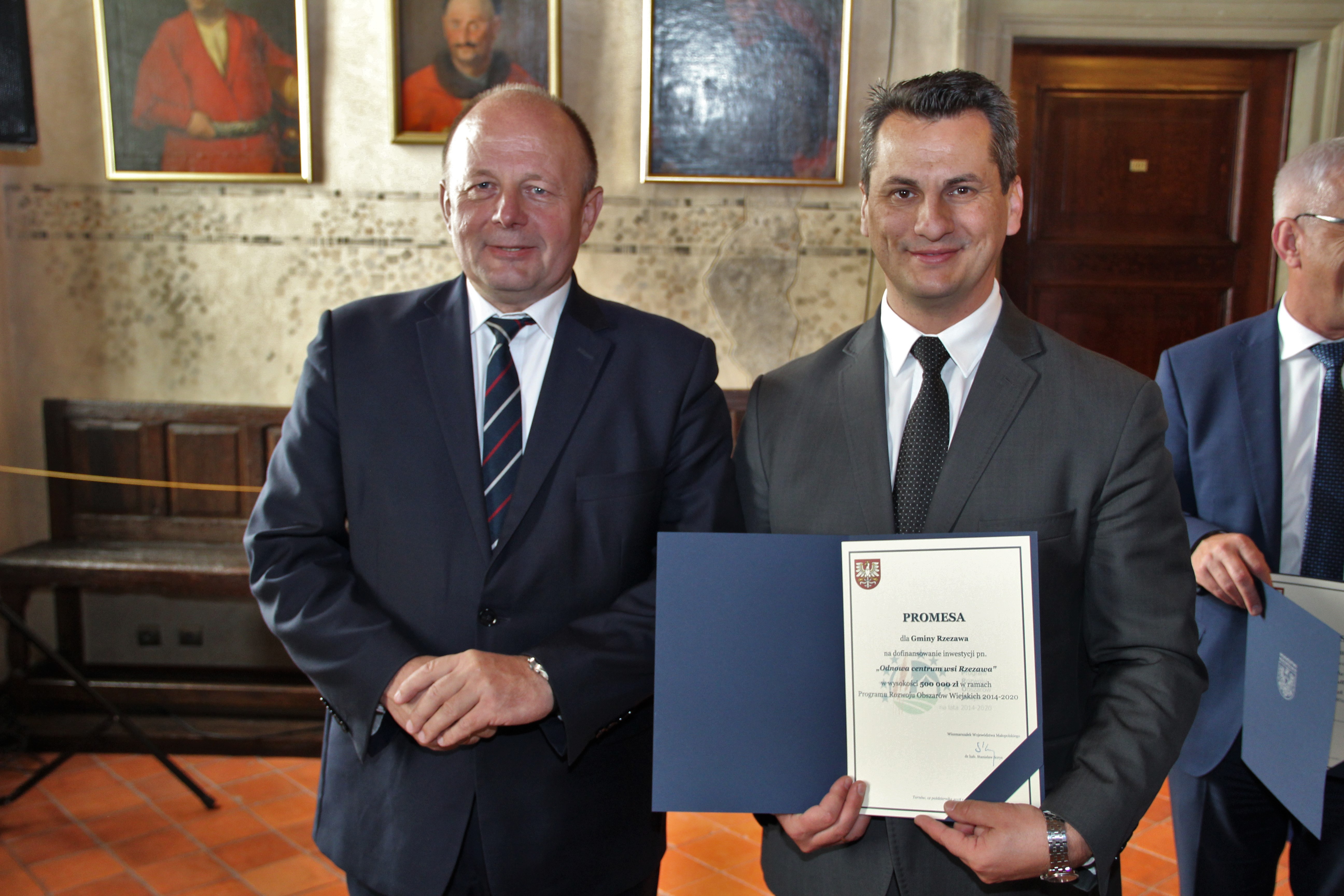 Promesę dla Gminy Rzezawa na realizację zaplanowanej inwestycji z Programu Rozwoju Obszarów Wiejskich Mariusz Palej odebrał z rąk Wicemarszałka Województwa Małopolskiego Stanisława Sorysa. Jej uroczyste przekazanie odbyło się w piątek 12.X.2018 r. w tarnowskim Ratuszu.