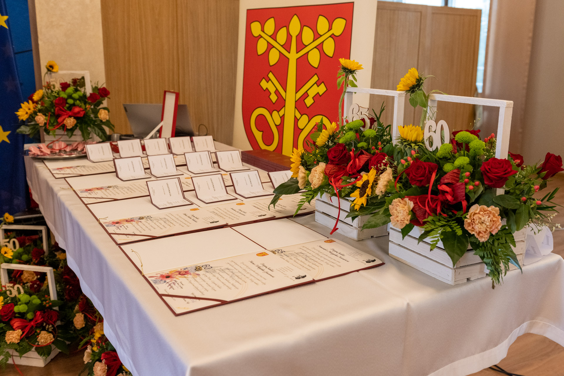 Za nami niezwykle piękna i podniosła uroczystość. Małżeństwa z terenu gminy Rzezawa, które w tym roku obchodzą Złote Gody, zostały odznaczone medalami „za długoletnie pożycie małżeńskie”. W uroczystości wzięły udział także pary świętujące diamentowe i żelazne gody, a więc 60. i 65. rocznicę ślubu. Wszystkim Jubilatom serdecznie gratulujemy.
