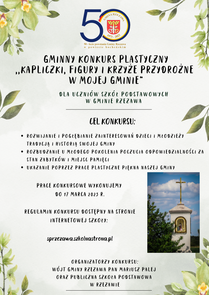 Wójt Gminy Rzezawa Mariusz Palej oraz Publiczna Szkoła Podstawowa w Rzezawie zapraszają na konkurs plastyczny pn. „Kapliczki, Figury i Krzyże Przydrożne w Mojej Gminie”. Termin wykonania prac: do 17 marca br. Więcej szczegółów z załączniku.