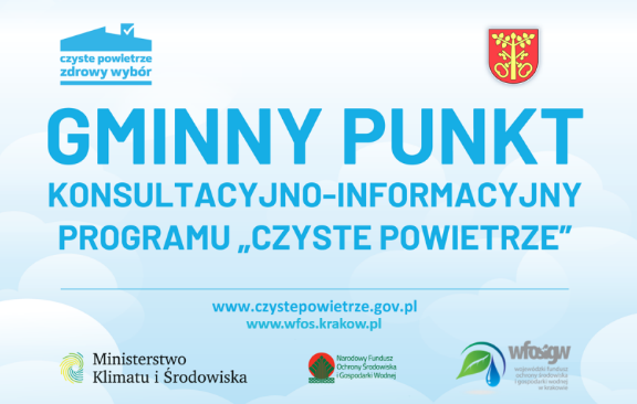 Gminny Punkt Konsultacyjno – Informacyjny Programu Czyste Powietrze czynny jest w Urzędzie Gminy Rzezawa w pokoju nr 22 w każdy poniedziałek w godzinach 14:00 - 16:00 oraz od wtorku do piątku w godzinach 12:00 – 14:00 lub w godzinach pracy urzędu po wcześniejszym telefonicznym umówieniu terminu pod numerem tel. 14 648 48 22.
