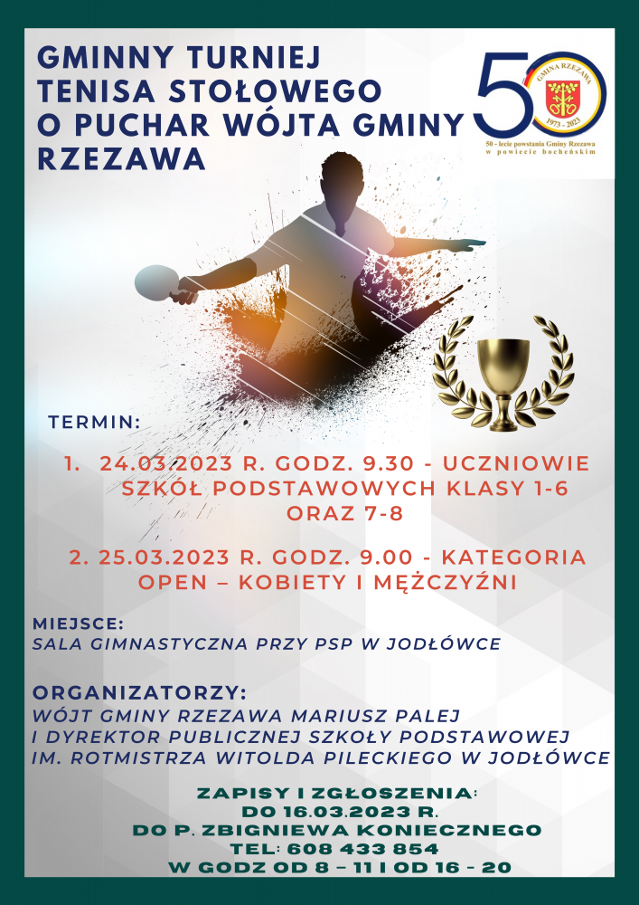 Wójt Gminy Rzezawa Mariusz Palej i Dyrektor Publicznej Szkoły Podstawowej im. Rotmistrza Witolda Pileckiego w Jodłówce zapraszają na Gminny Turniej Tenisa Stołowego o Puchar Wójta Gminy Rzezawa. Szczegóły na plakacie i w regulaminie.