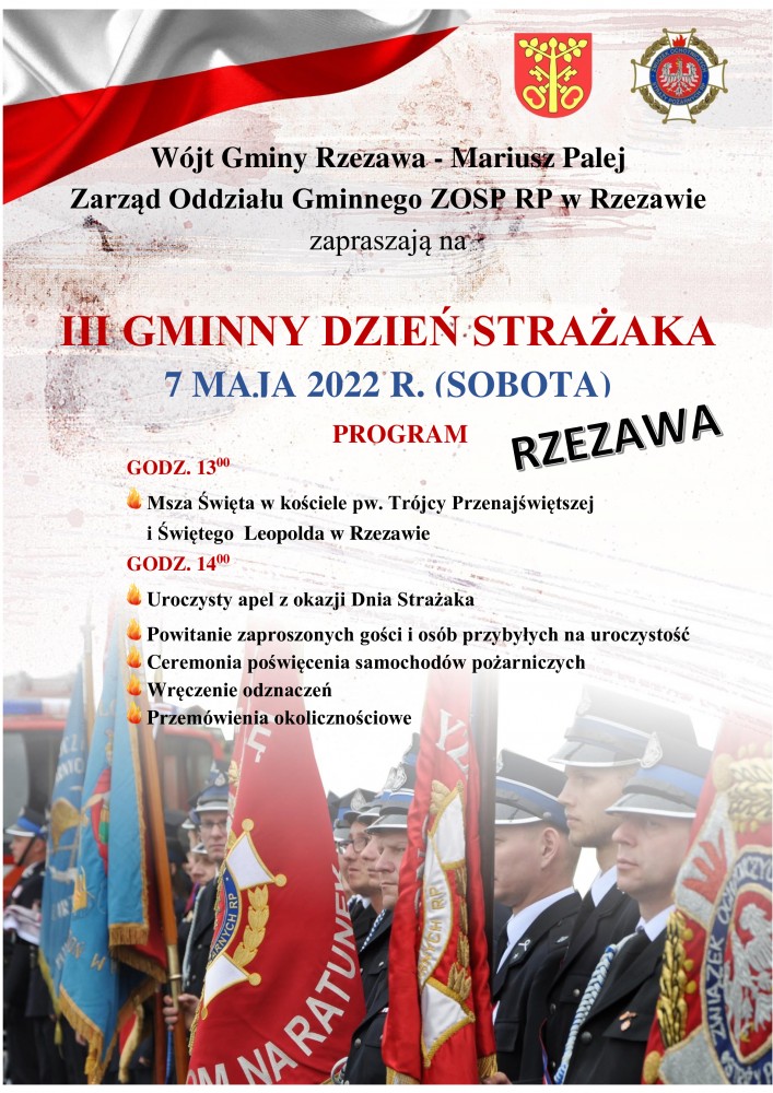 Wójt Gminy Rzezawa Mariusz Palej oraz Zarząd Oddziału Gminnego ZOSP RP w Rzezawie zapraszają na III Gminny Dzień Strażaka, który odbędzie się 7 maja 2022r. (sobota) w Rzezawie. Szczegóły na plakacie.