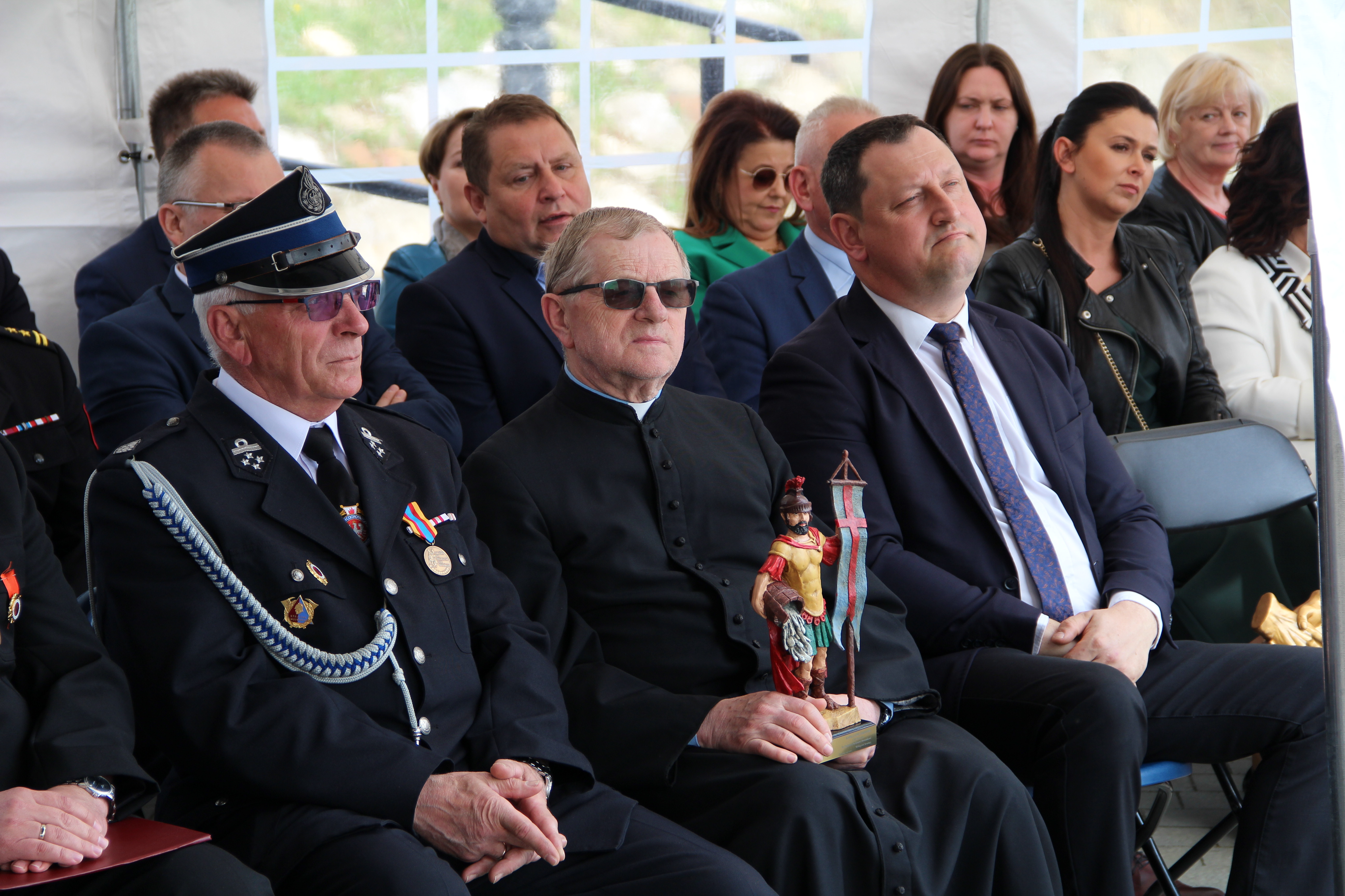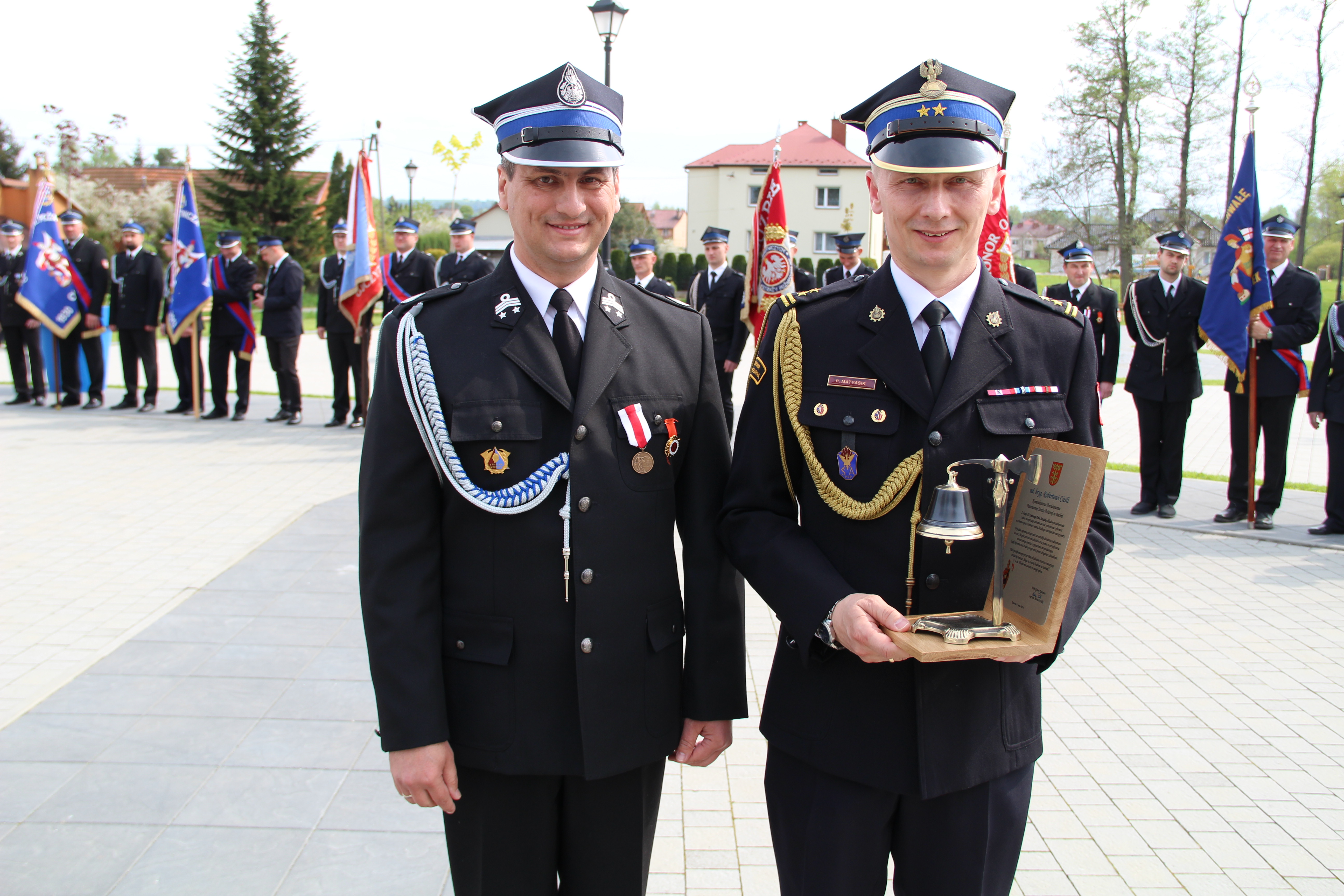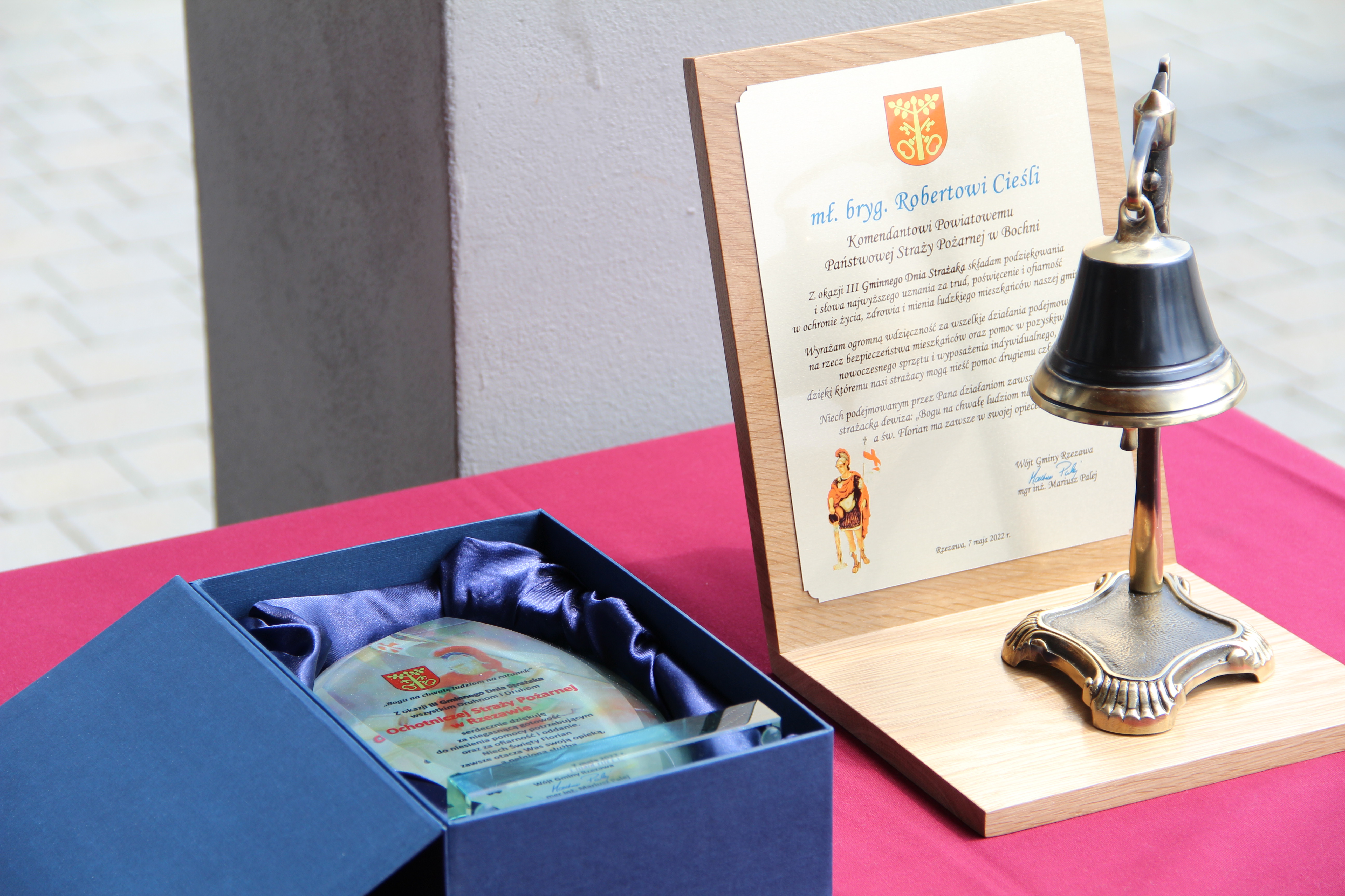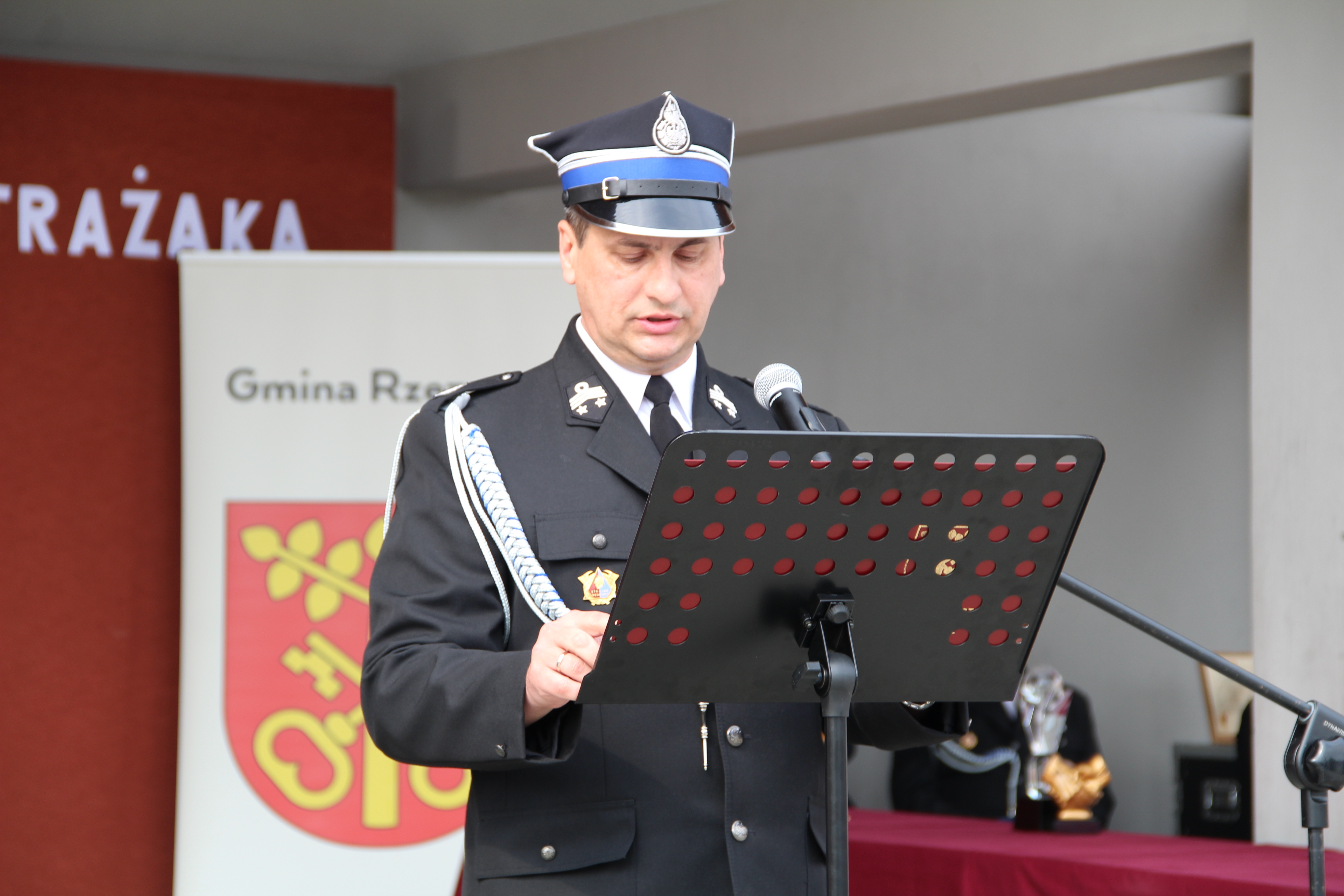 Następie Wójt Mariusz Palej podziękował Komendantowi Powiatowej Państwowej Straży Pożarnej w Bochni mł. bryg. Robertowi Cieśli za owocną współpracę i poprawę bezpieczeństwa na terenie gminy Rzezawa. W imieniu Komendanta pamiątkową statuetkę odebrał bryg. Paweł Matyasik.