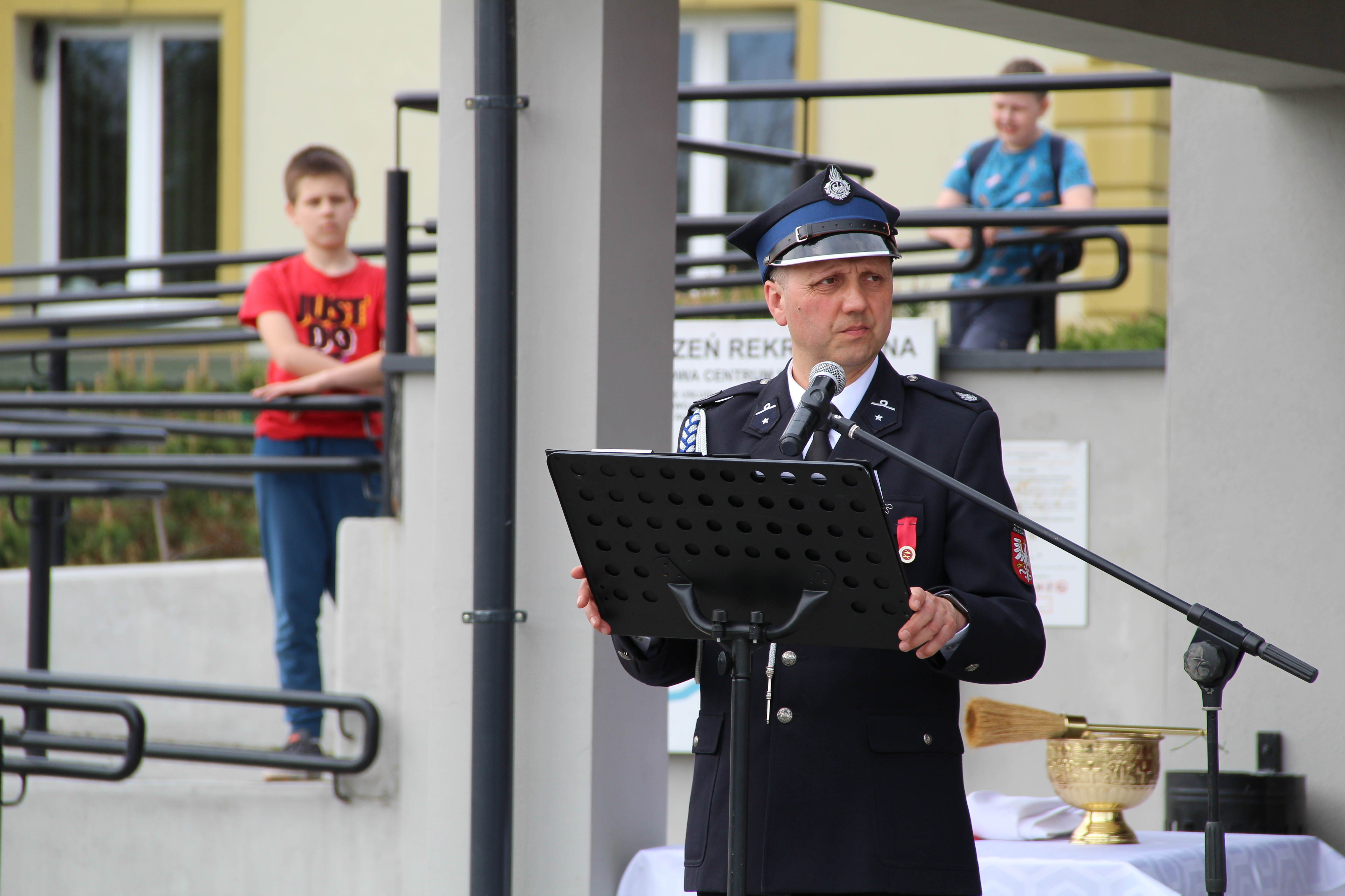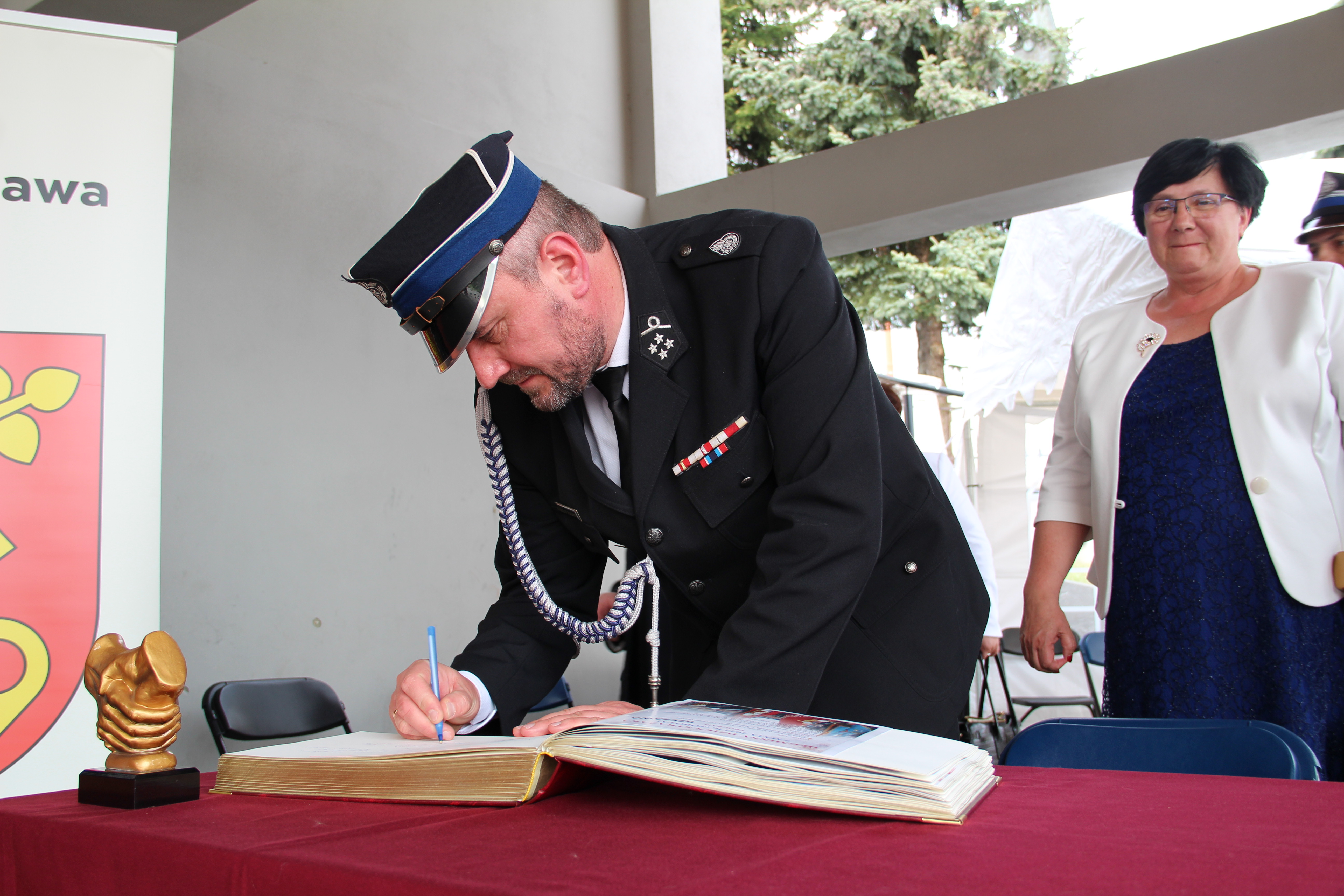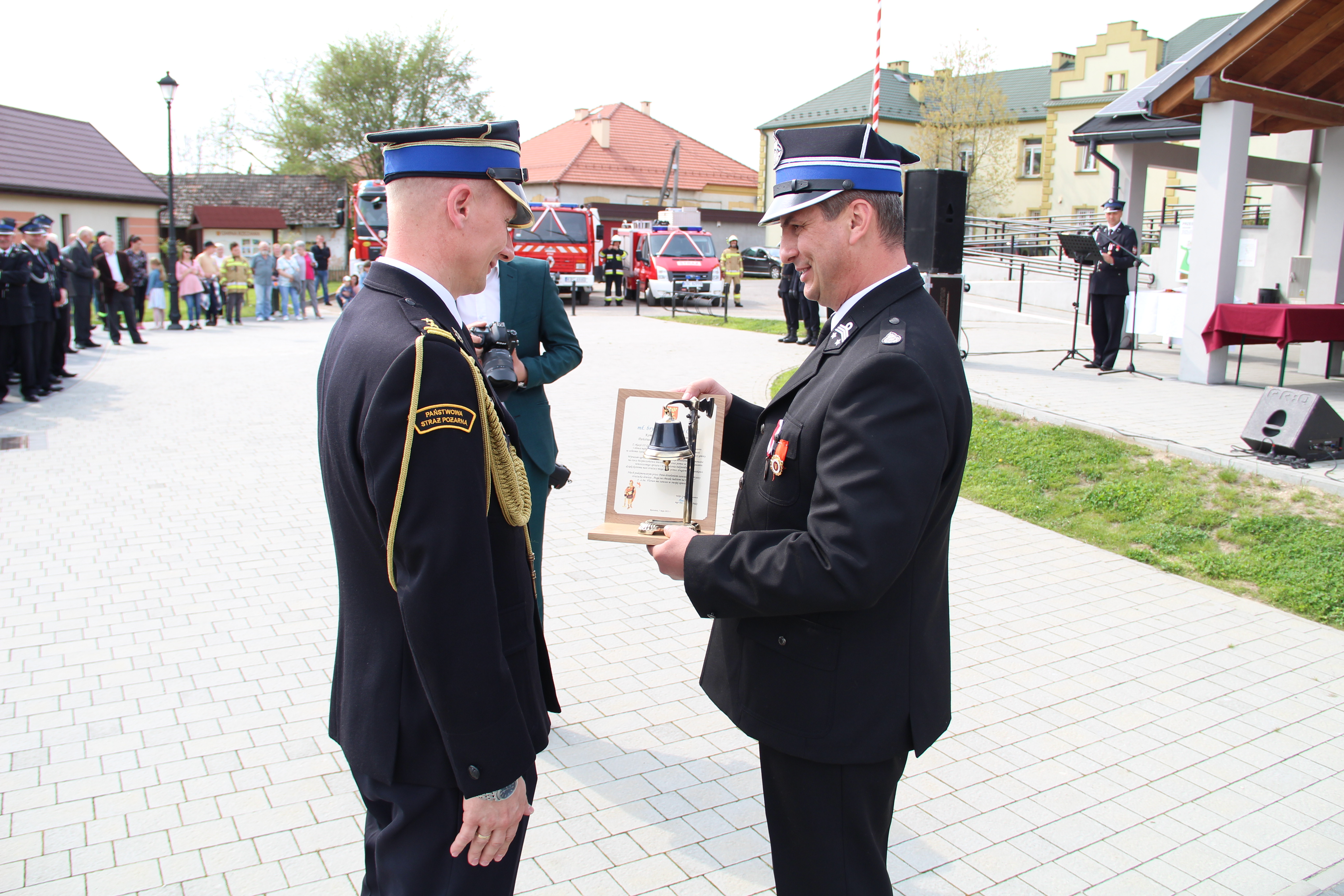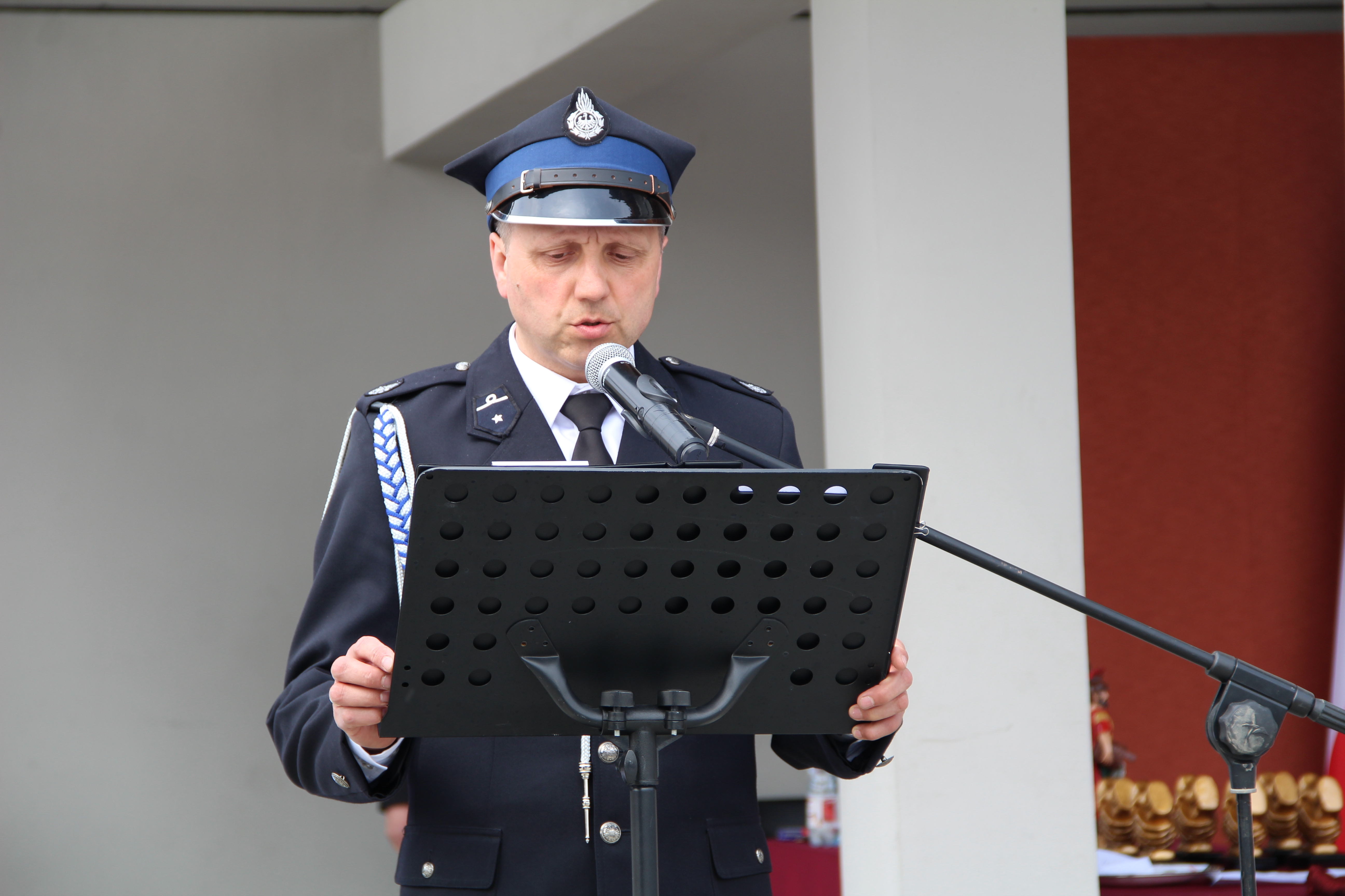Następie Wójt Mariusz Palej podziękował Komendantowi Powiatowej Państwowej Straży Pożarnej w Bochni mł. bryg. Robertowi Cieśli za owocną współpracę i poprawę bezpieczeństwa na terenie gminy Rzezawa. W imieniu Komendanta pamiątkową statuetkę odebrał bryg. Paweł Matyasik.