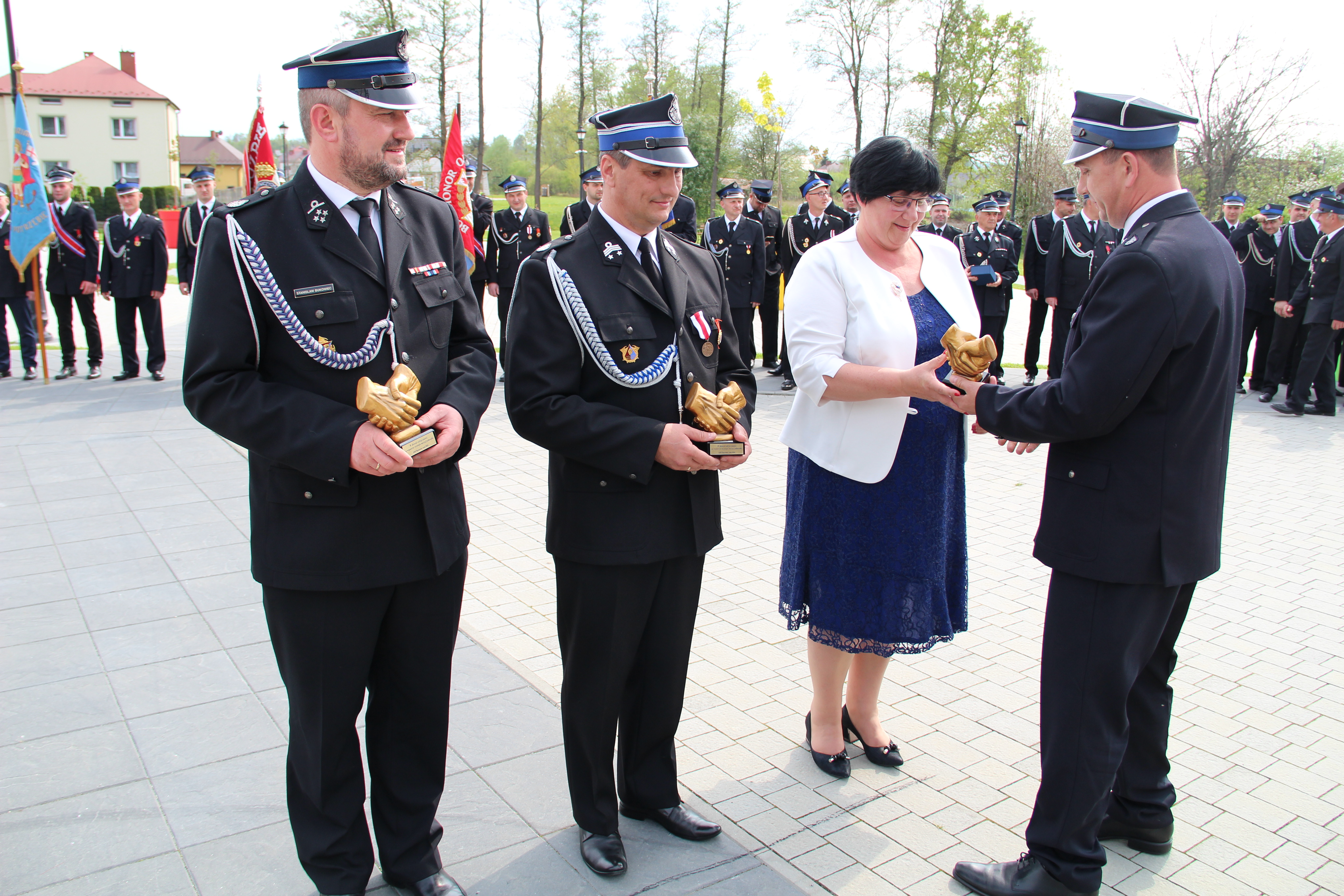 Następie w dowód wdzięczności za rozwój jednostki OSP Rzezawa jej prezes Leszek Trąba wręczył okolicznościowe statuetki Posłowi na Sejm RP Stanisławowi Bukowcowi, Wójtowi Mariuszowi Palejowi oraz Przewodniczącej Rady Gminy Rzezawa Barbarze Kwiecińskiej.