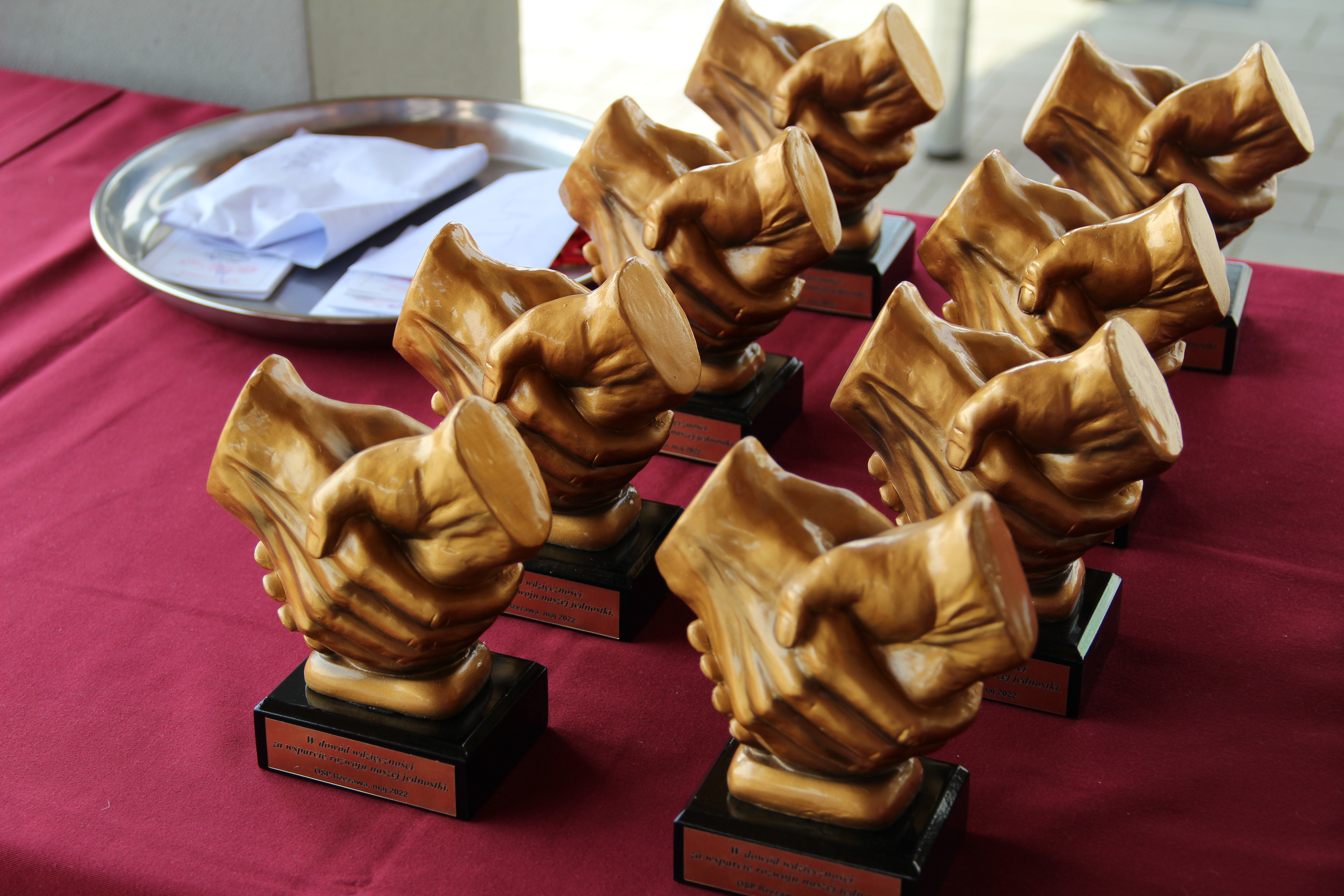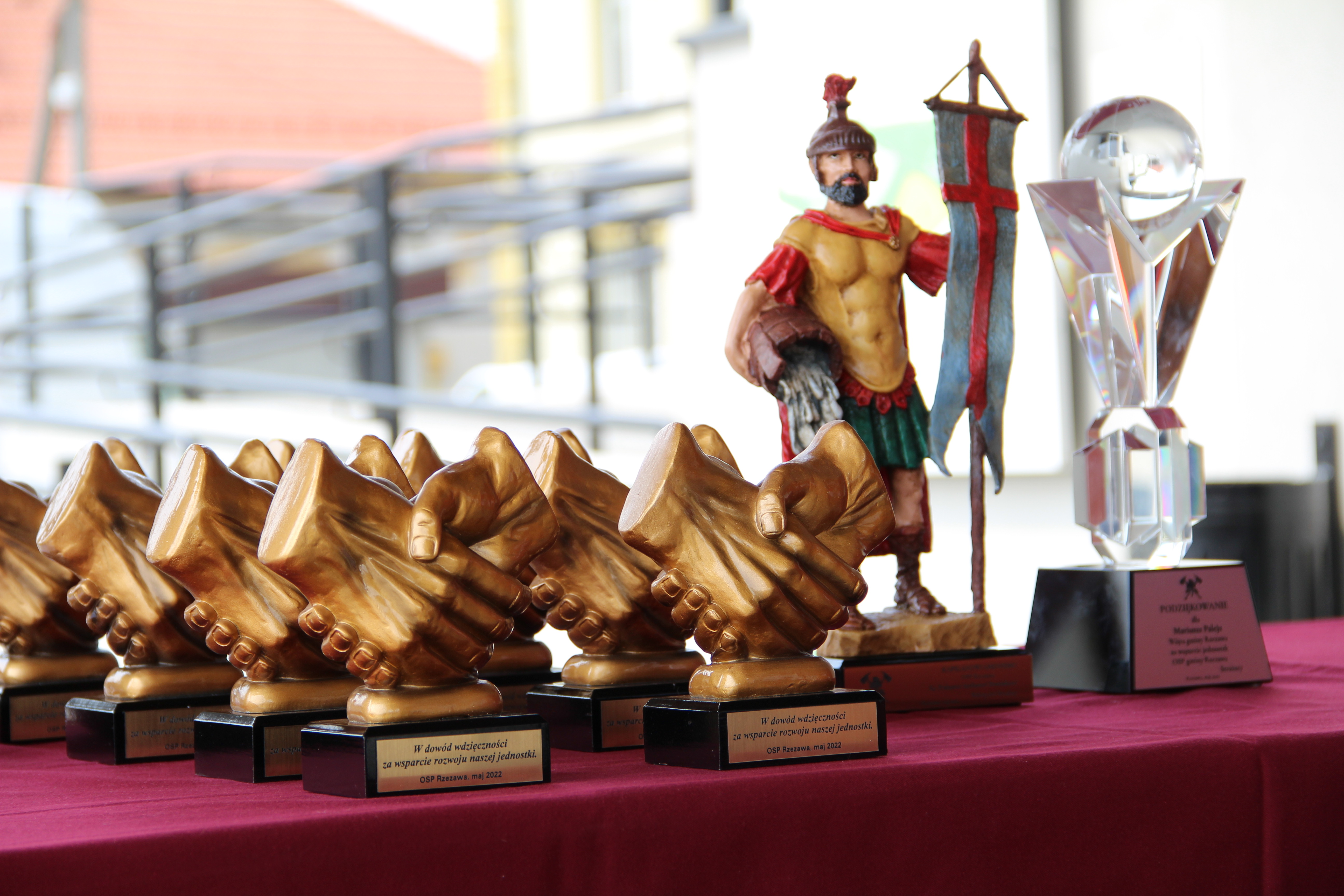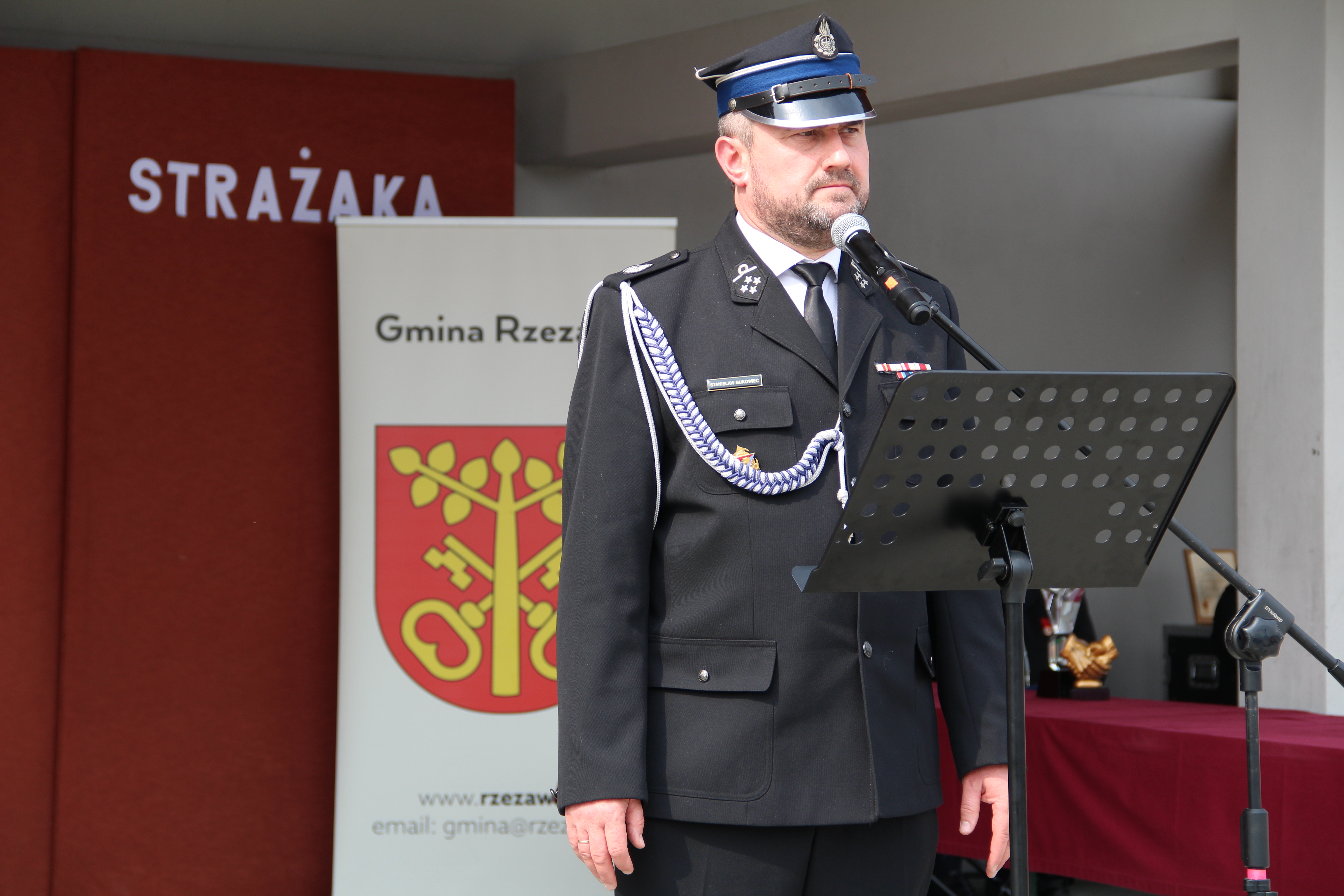 Wójt Mariusz Palej podziękował również wszystkim jednostkom OSP z terenu gminy Rzezawa, wręczając ich przedstawicielom pamiątkowe trofea.