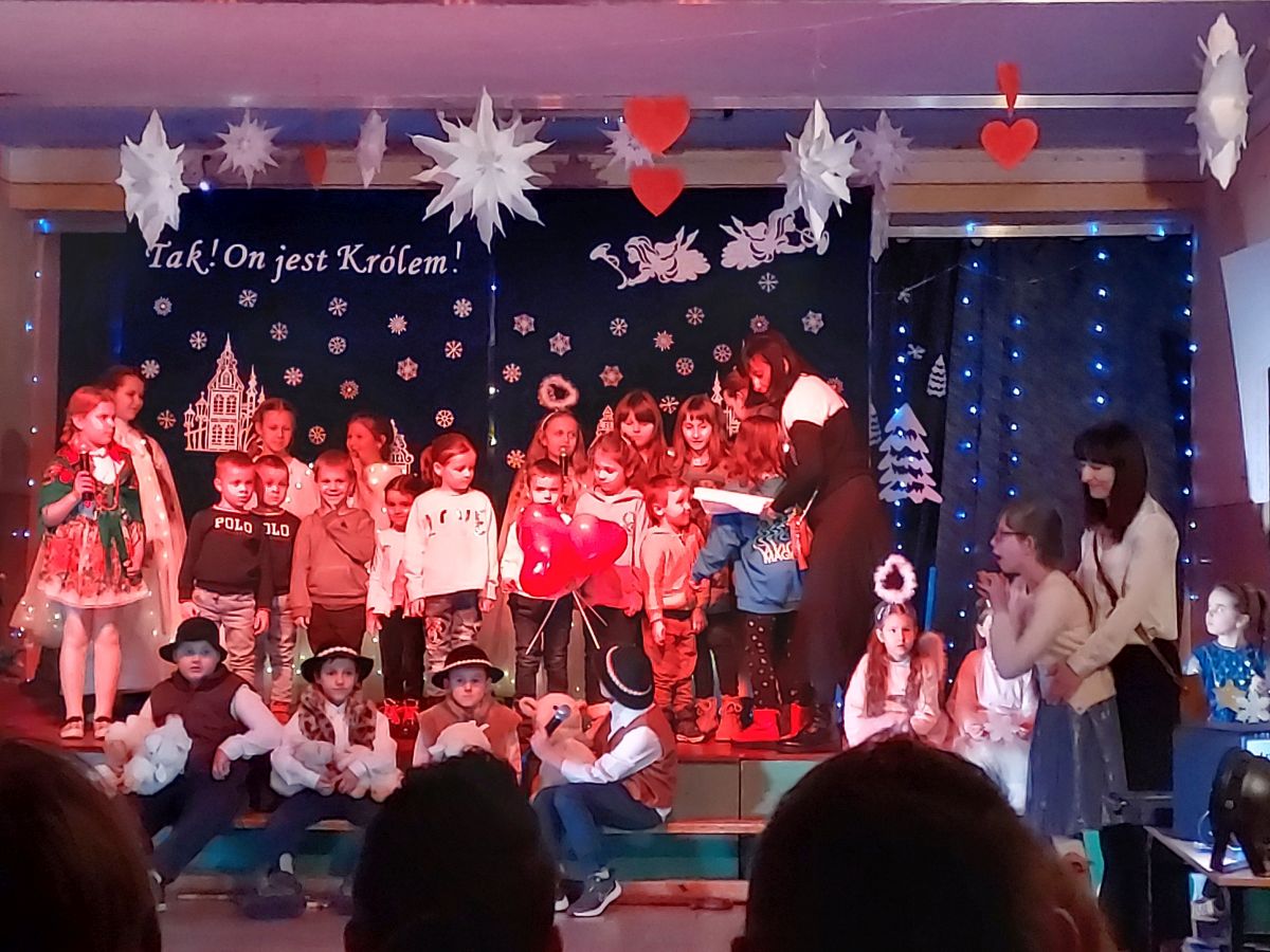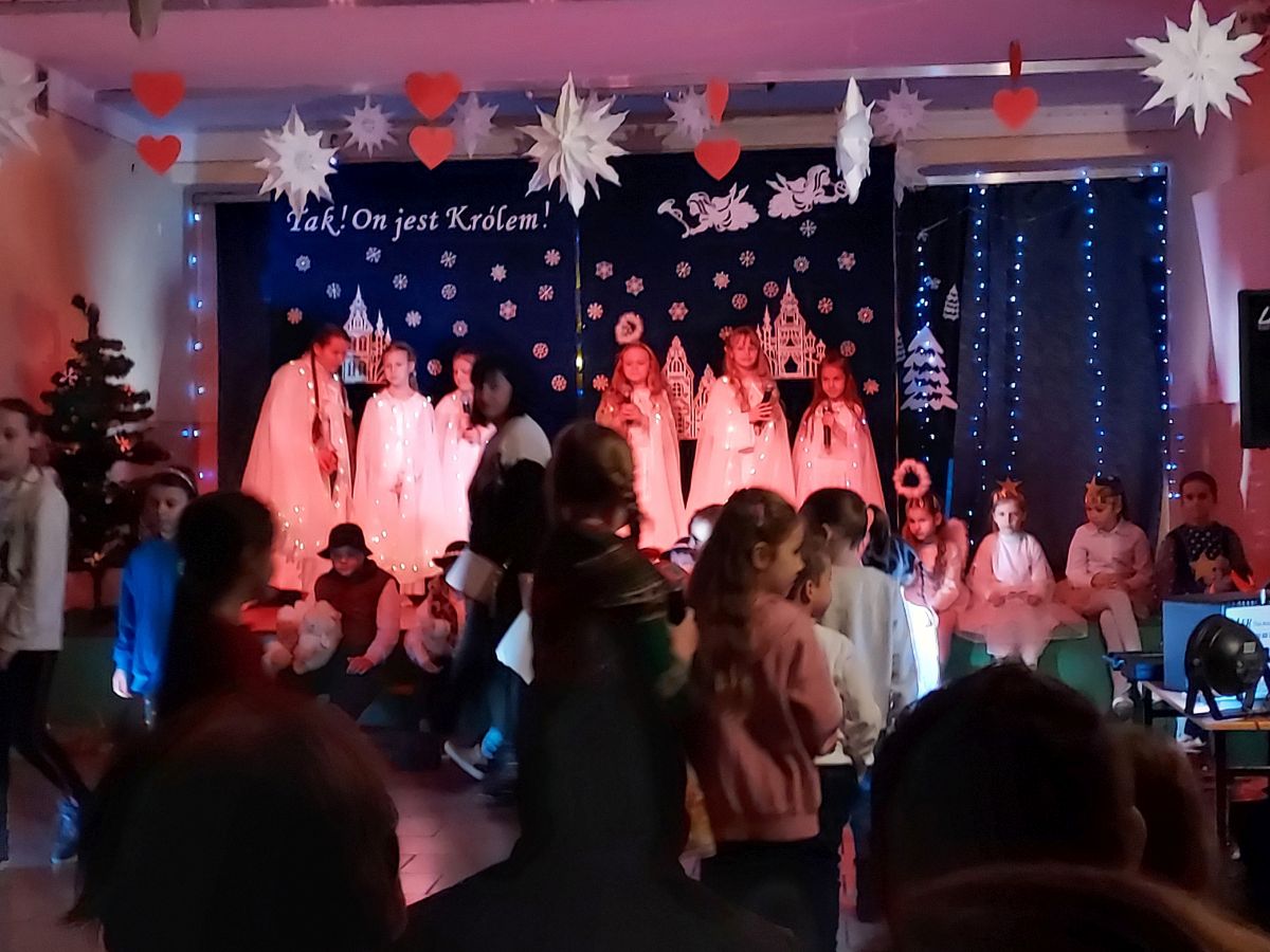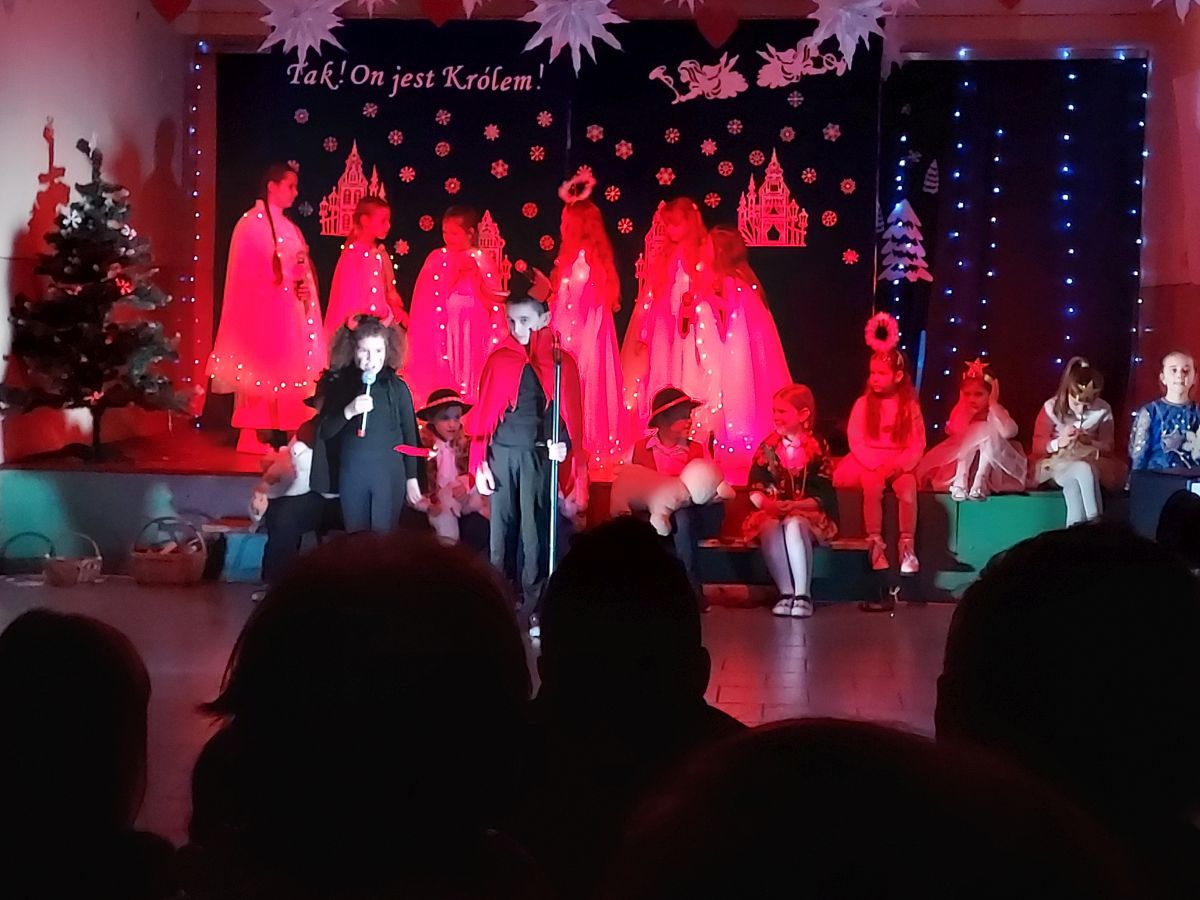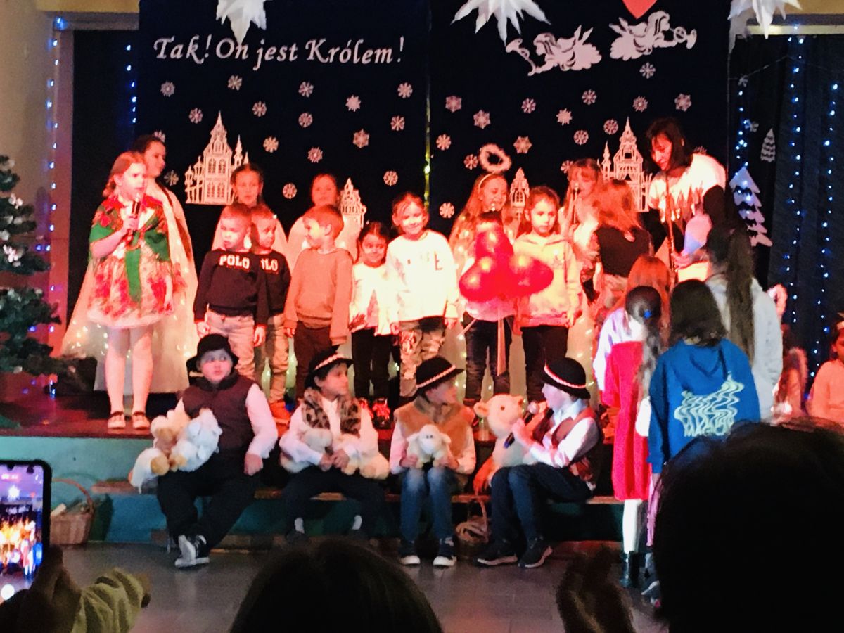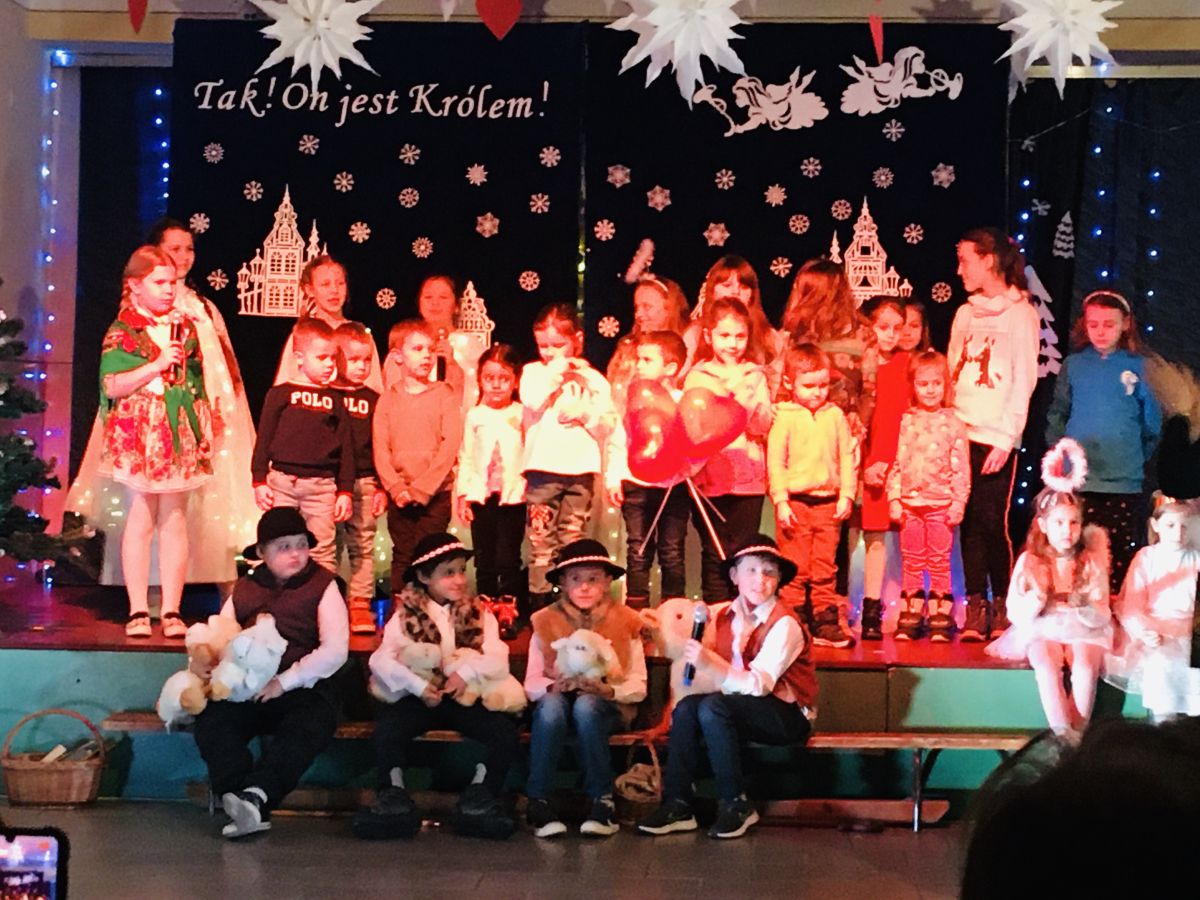 „Tak, To On! On- jest Królem świata”- wielokrotnie rozbrzmiewał refren piosenki. Wymowna scenografia, zagospodarowanie przestrzeni teatralnej, barwne kostiumy, gra świateł oraz ogromne zaangażowanie młodych aktorów, wychowawcy i rodziców przyniosło efekty. Przedstawienie wywarło olbrzymie wrażenie i poruszyło serca licznie zgromadzonej publiczności. Aktorzy zostali nagrodzeni gromkimi brawami za pięknie przygotowane widowisko muzyczno-taneczne. Inscenizacja przygotowana pod kierunkiem wychowawczyni kl. II p. Agaty Lekkiej i nauczyciela muzyki p. Pawła Lekkiego uprzyjemniła każdemu poświąteczne chwile.