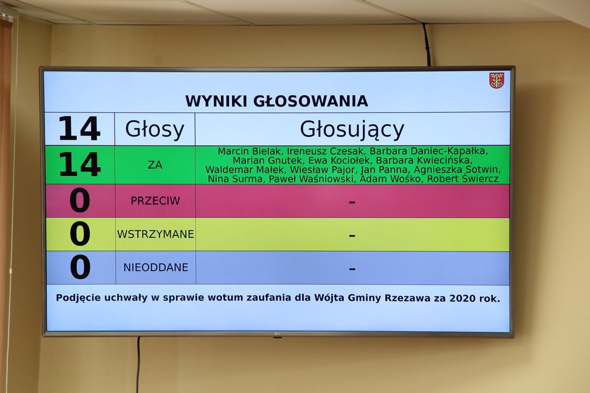 Rada Gminy Rzezawa podjęła jednogłośnie uchwałę w sprawie udzielenia Wójtowi Mariuszowi Palejowi wotum zaufania oaz absolutorium za realizację budżetu za 2020 rok.