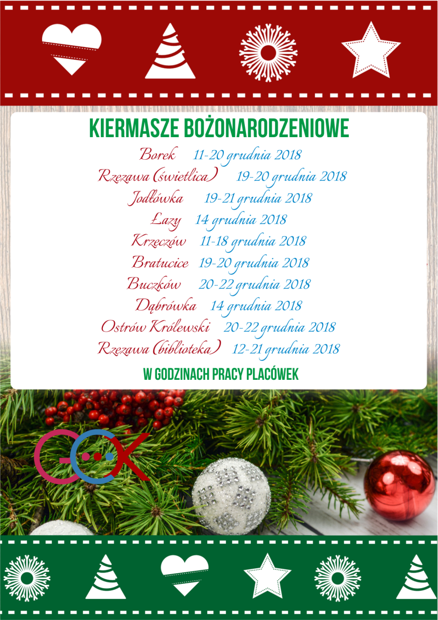 Tradycyjnie już zapraszamy Państwa do naszych bibliotek i świetlic na Kiermasze Bożonarodzeniowe. Na przybyłych czekać będą niepowtarzalne stroiki świąteczne oraz ozdoby wykonane samodzielnie przez dzieci, młodzież oraz dorosłych uczęszczających na placówki GCKCZiS.