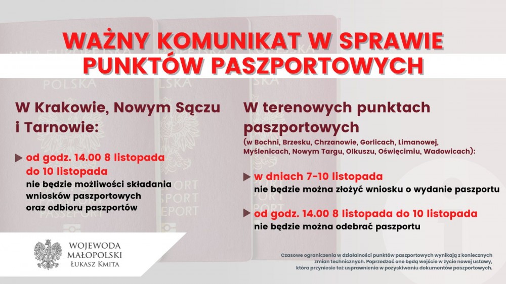 W związku z zaplanowanym wejściem w życie nowej ustawy o dokumentach paszportowych nastąpią ograniczenia w działalności wszystkich punktów paszportowych, w tym w Bochni oraz w Brzesku, Szczegóły w załączniku.
