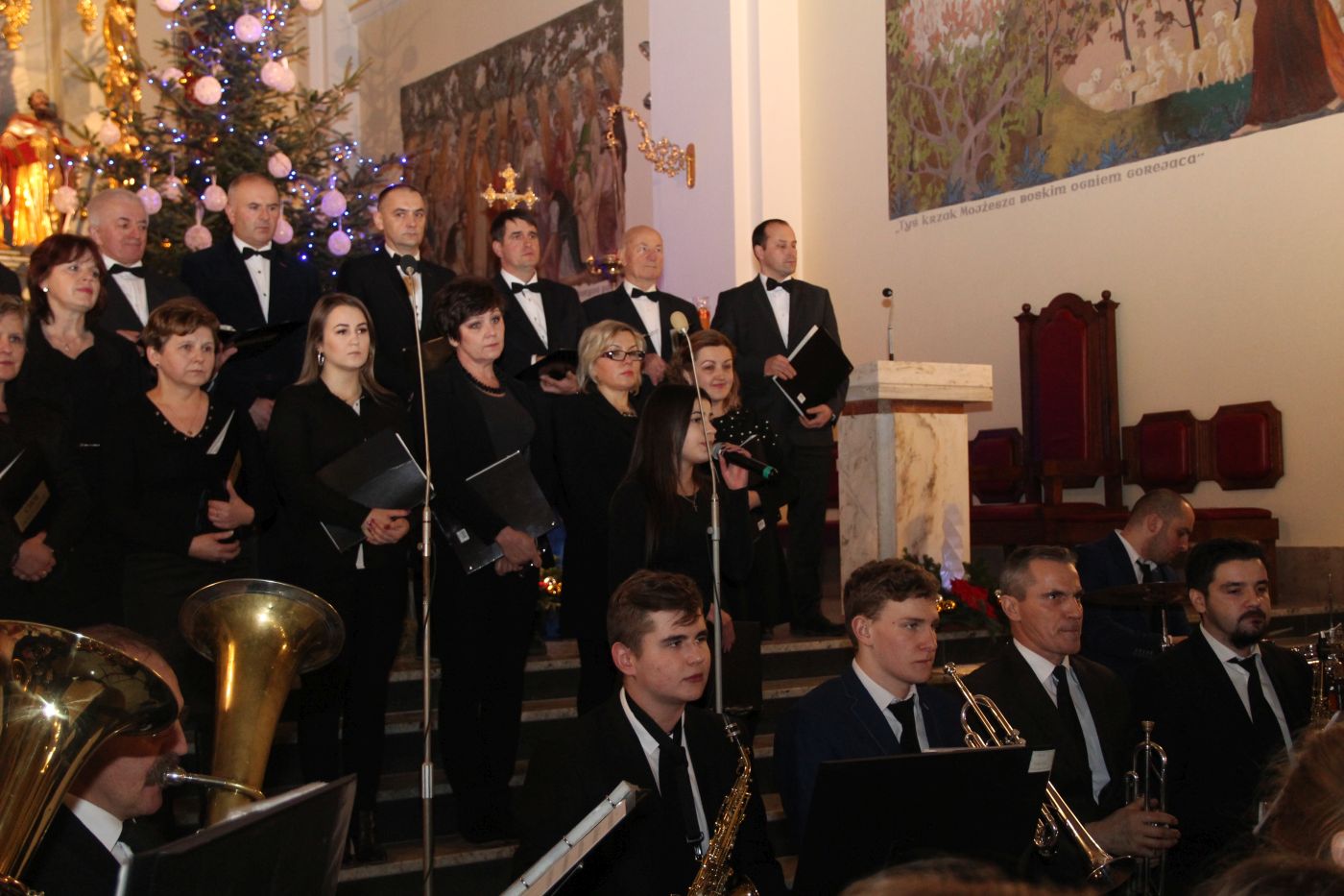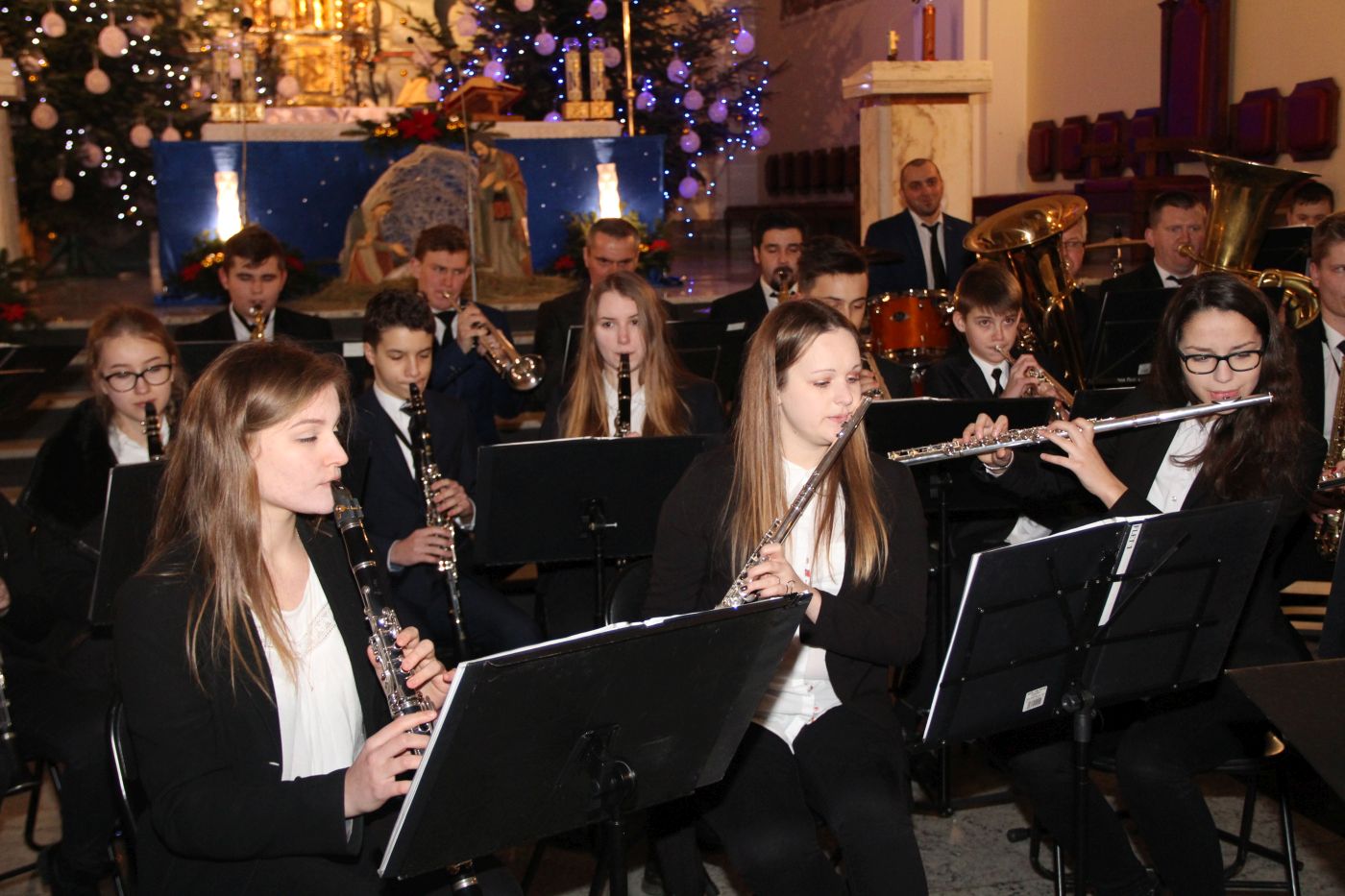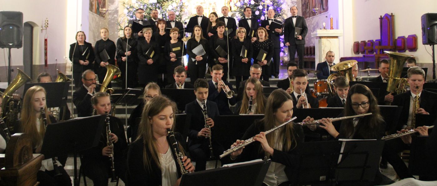 w tym kilka w towarzystwie wokalu solistów. Drugą część muzycznego spotkania wypełniły utwory muzyki klasycznej i filmowej. I tutaj można było podziwiać kunszt artystyczny obydwóch zespołów, które przepięknie wykonały m.in. „Moment for morricone”. Publiczność raz po raz nagradzała wykonawców gromkimi brawami. Ks. Roman Majoch - proboszcz okulickiej parafii podziękował wszystkim za przybycie i zaprosił zgromadzonych już na następny koncert noworoczny za rok. A na koniec wspólnie zaśpiewano kolędę "Bóg się rodzi".