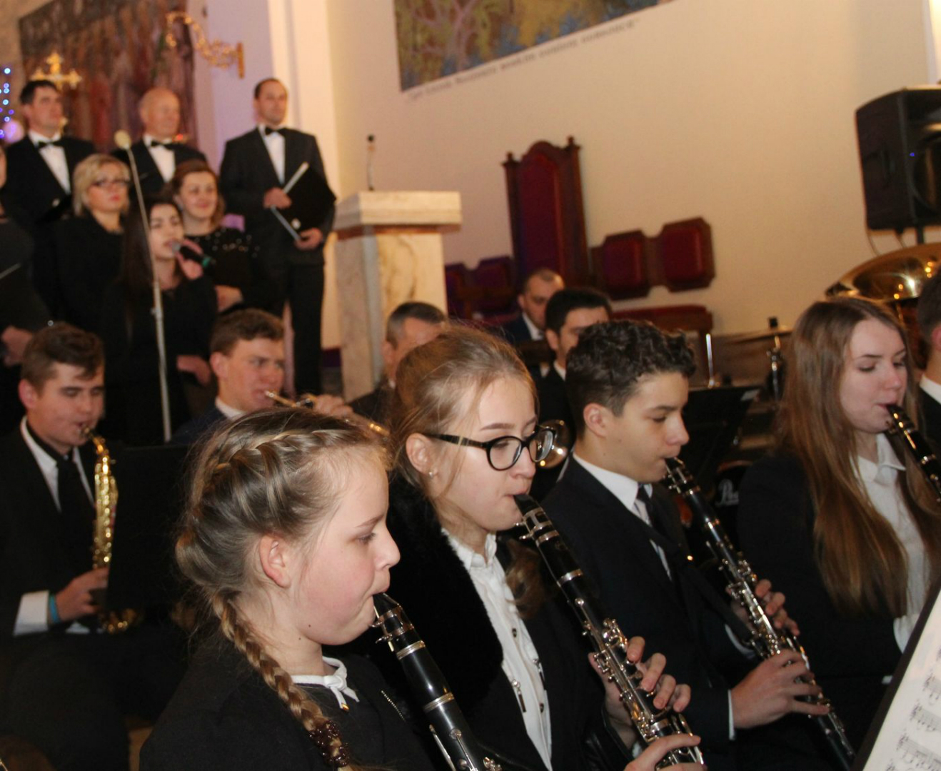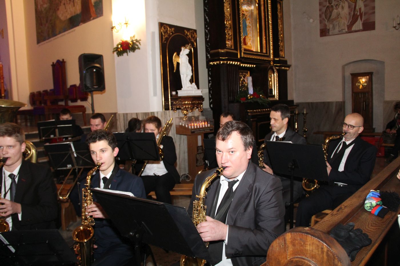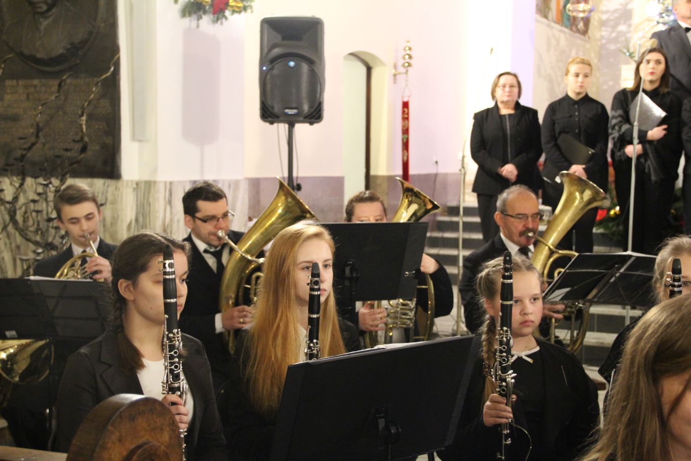w tym kilka w towarzystwie wokalu solistów. Drugą część muzycznego spotkania wypełniły utwory muzyki klasycznej i filmowej. I tutaj można było podziwiać kunszt artystyczny obydwóch zespołów, które przepięknie wykonały m.in. „Moment for morricone”. Publiczność raz po raz nagradzała wykonawców gromkimi brawami. Ks. Roman Majoch - proboszcz okulickiej parafii podziękował wszystkim za przybycie i zaprosił zgromadzonych już na następny koncert noworoczny za rok. A na koniec wspólnie zaśpiewano kolędę "Bóg się rodzi".
