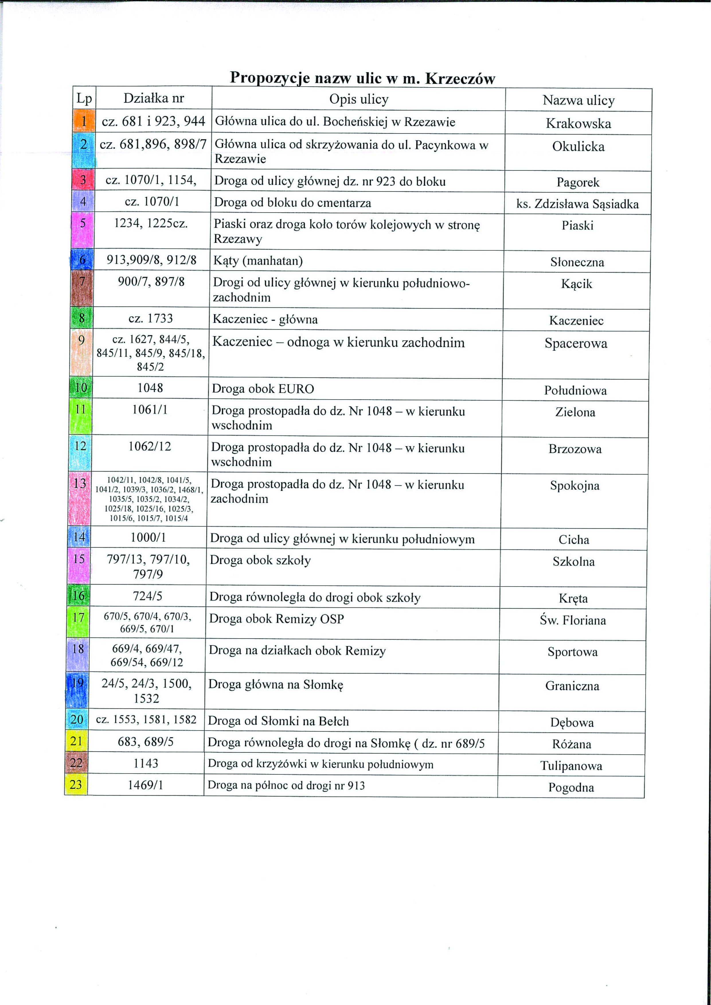 W Krzeczowie będą 23 ulice. Poniżej ich lista: