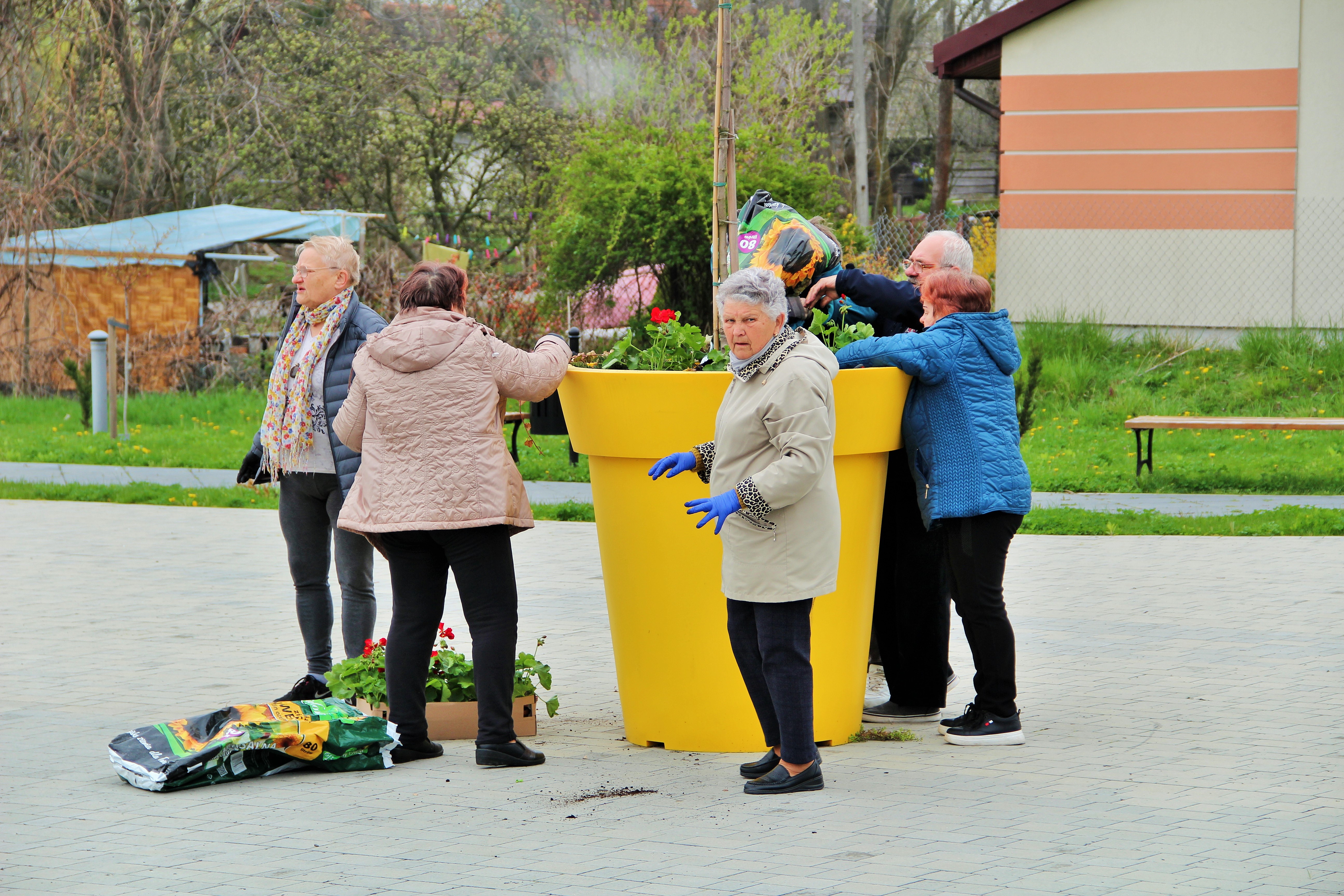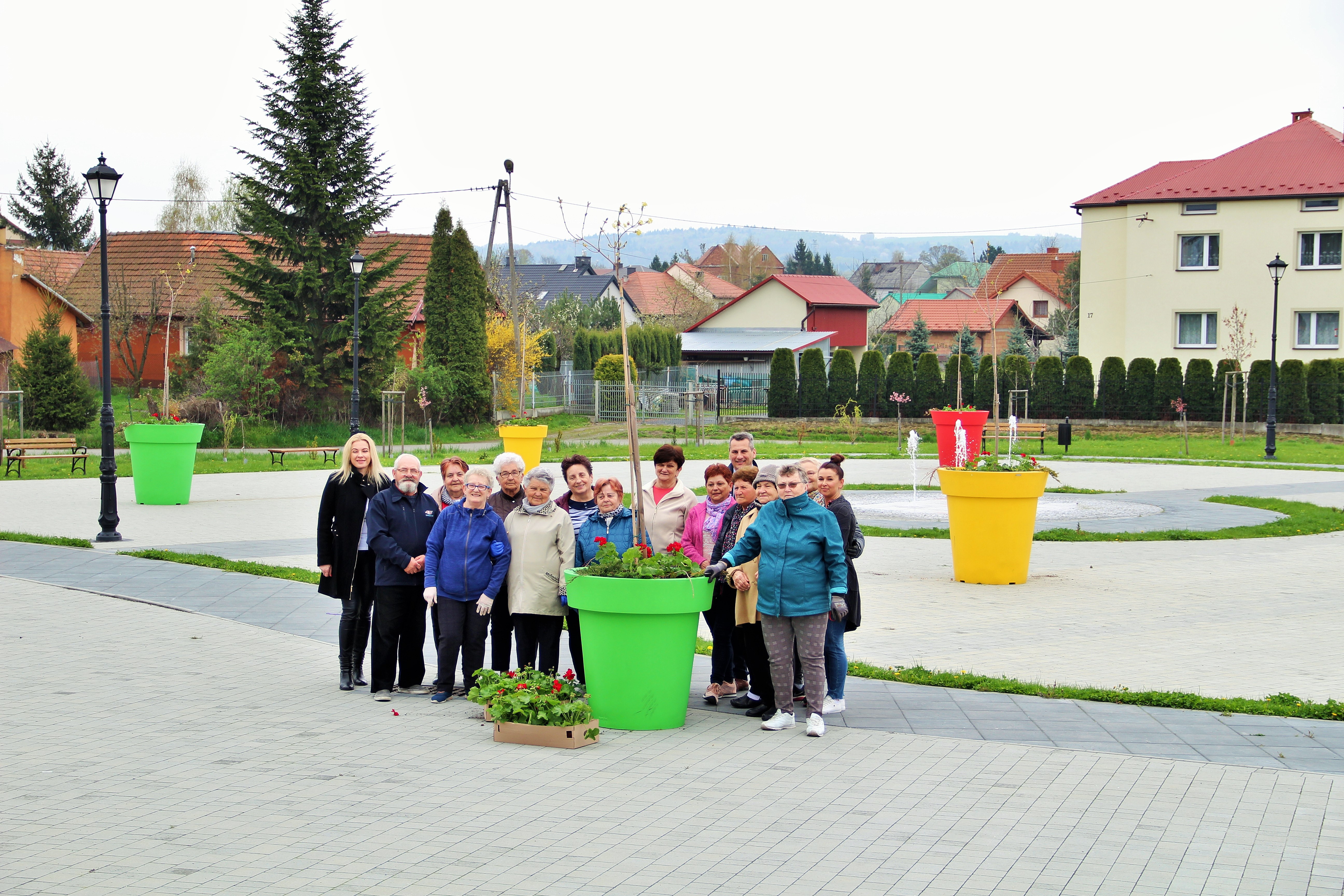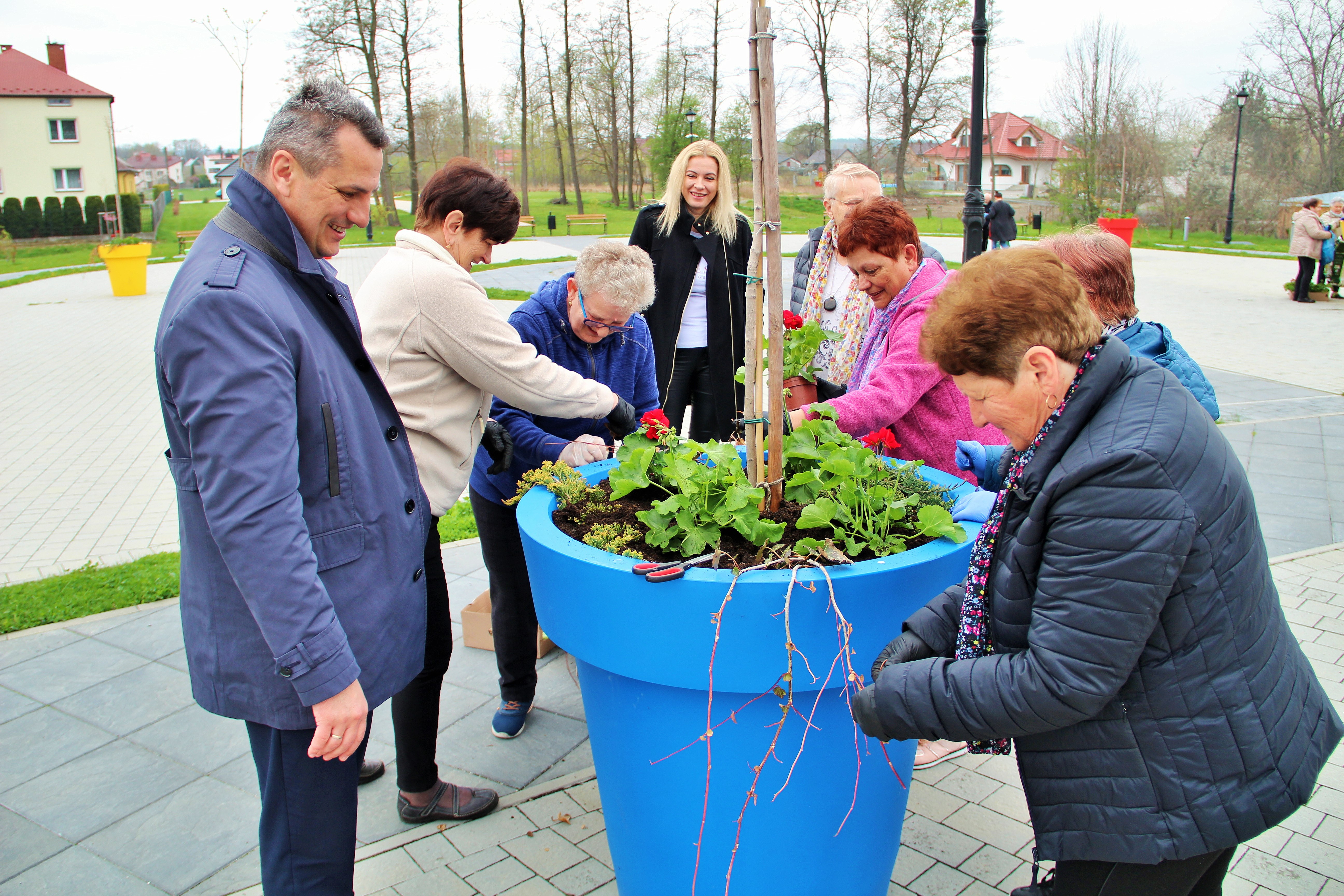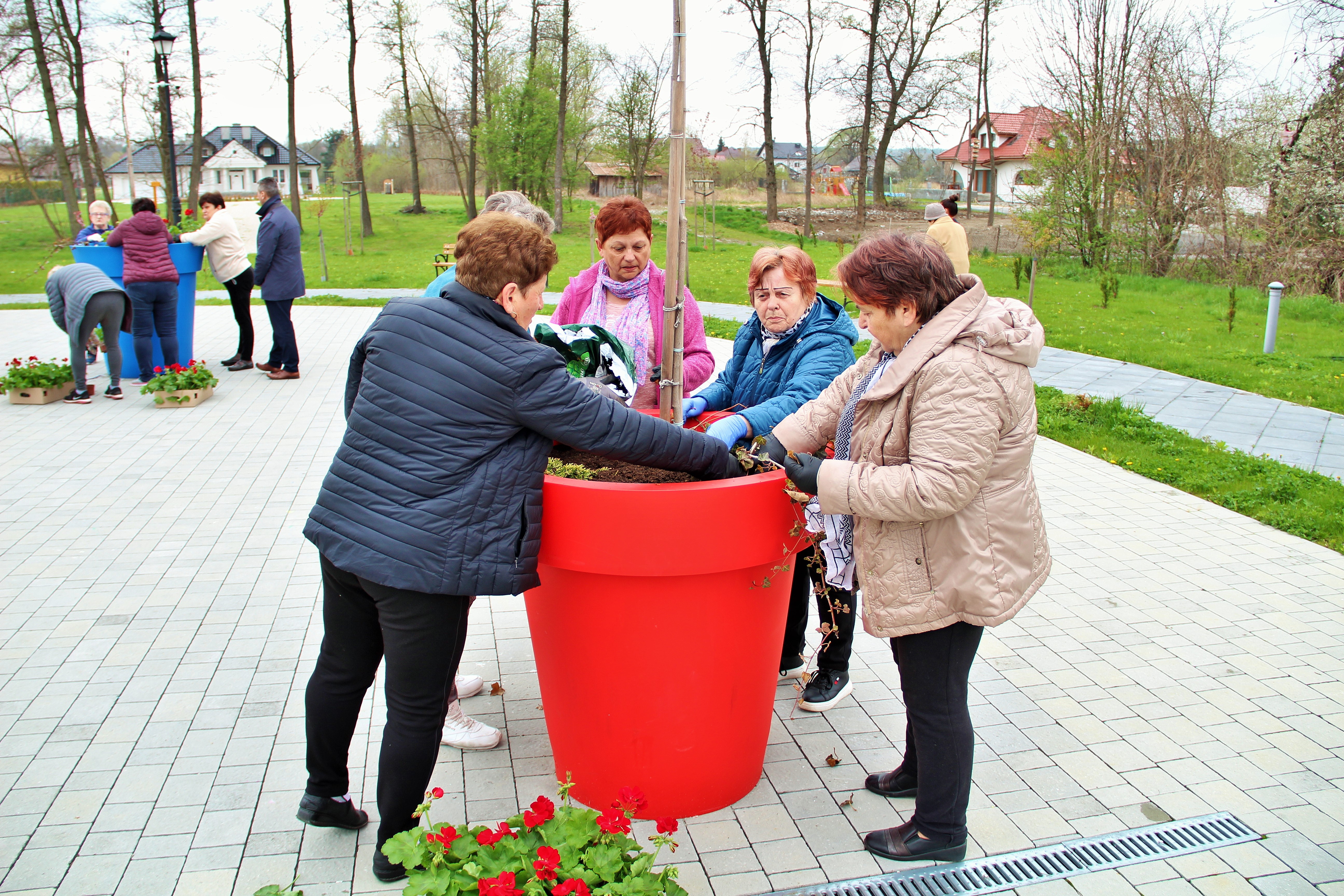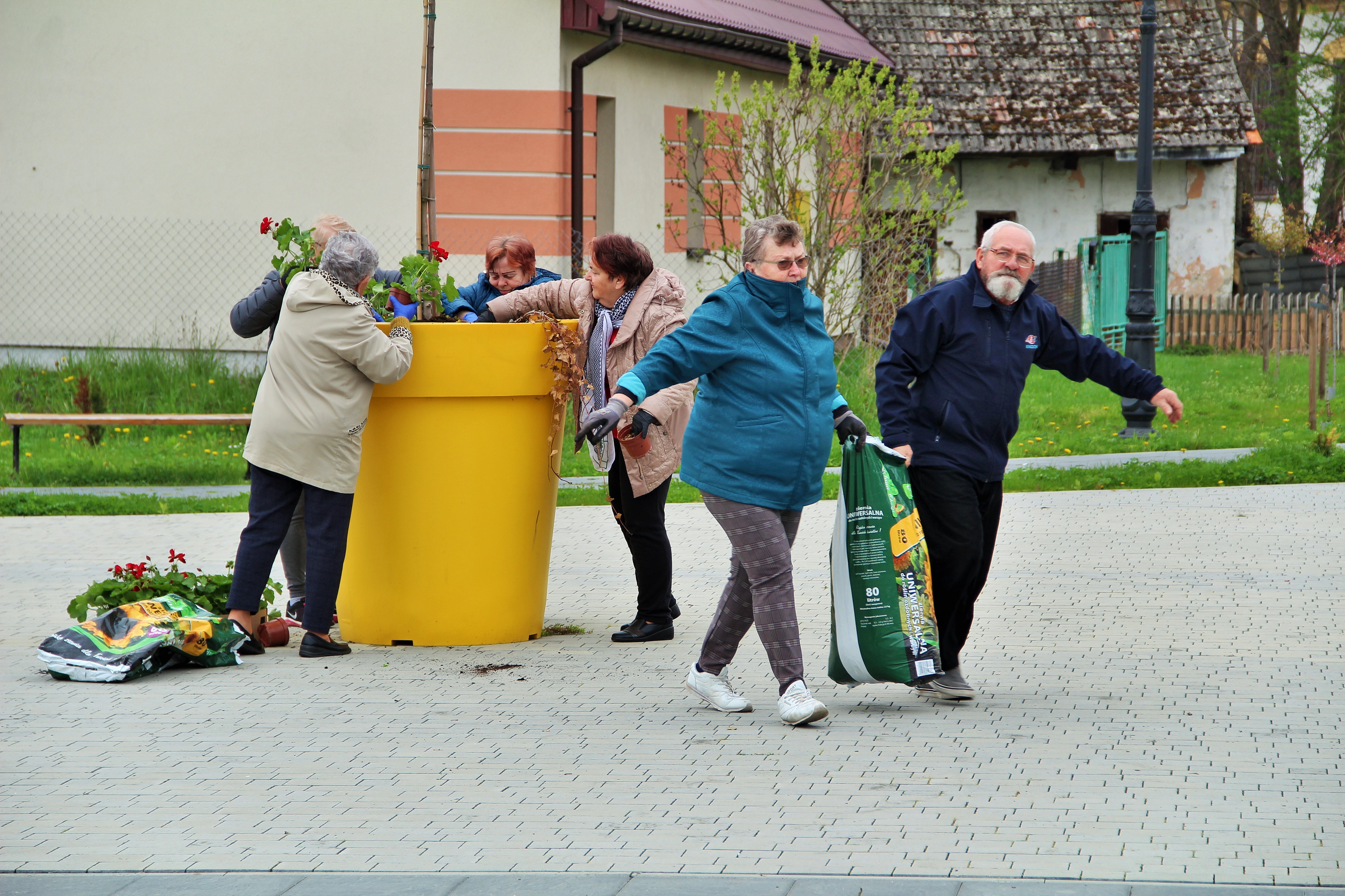 Uczestnicy Klubu Senior + w Rzezawie wzięli udział w akacji sadzenia kwiatów na rzezawskim Ryneczku.