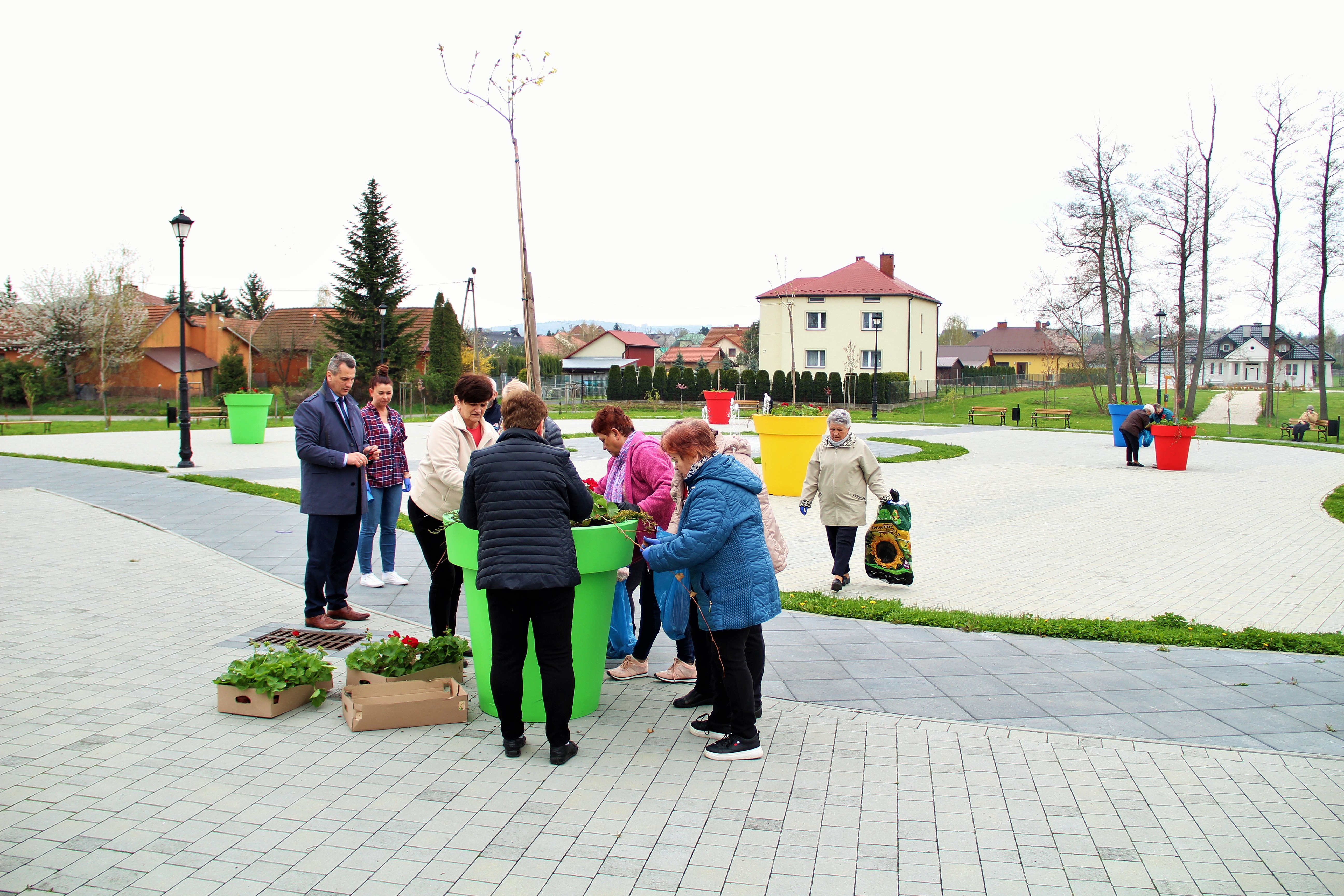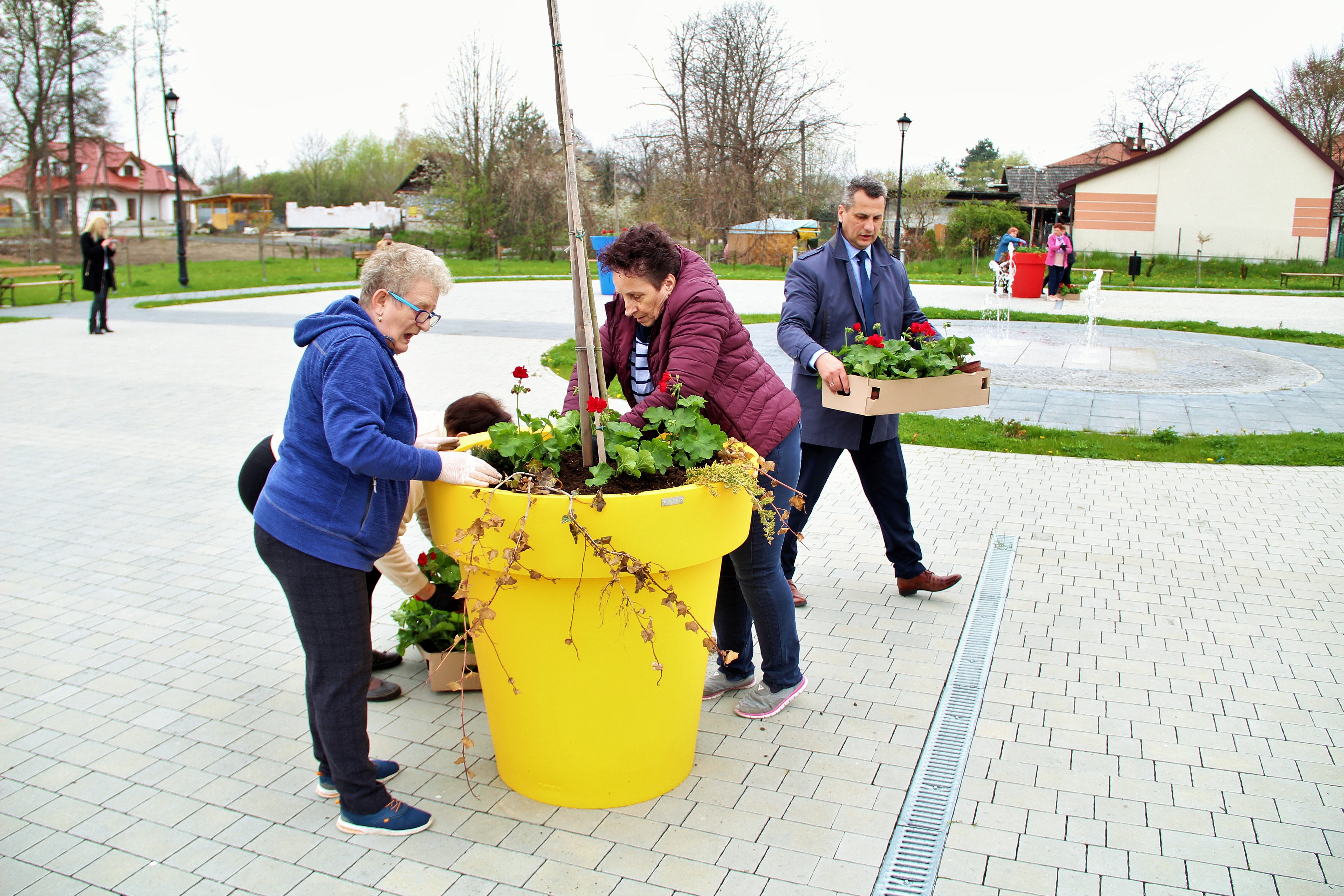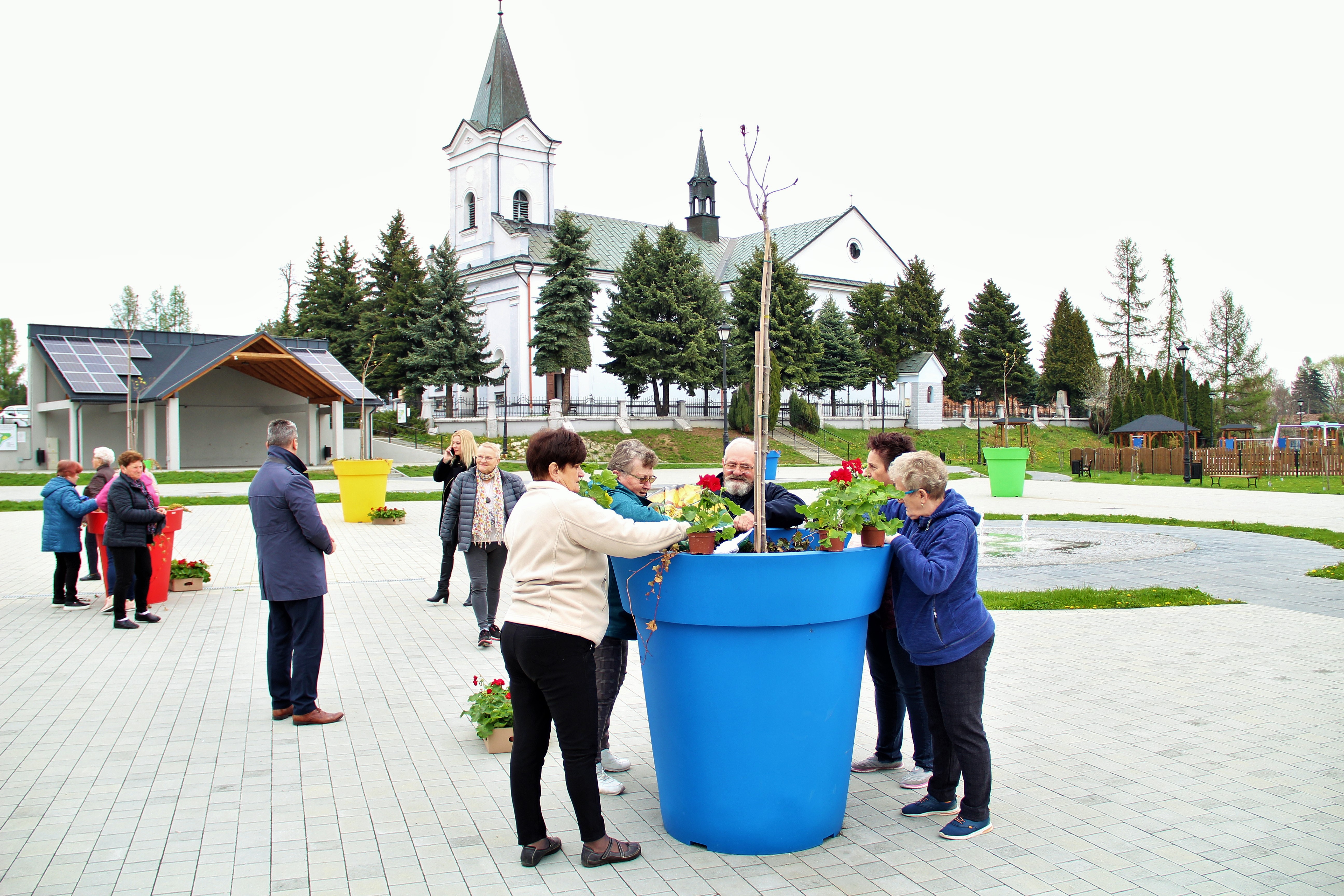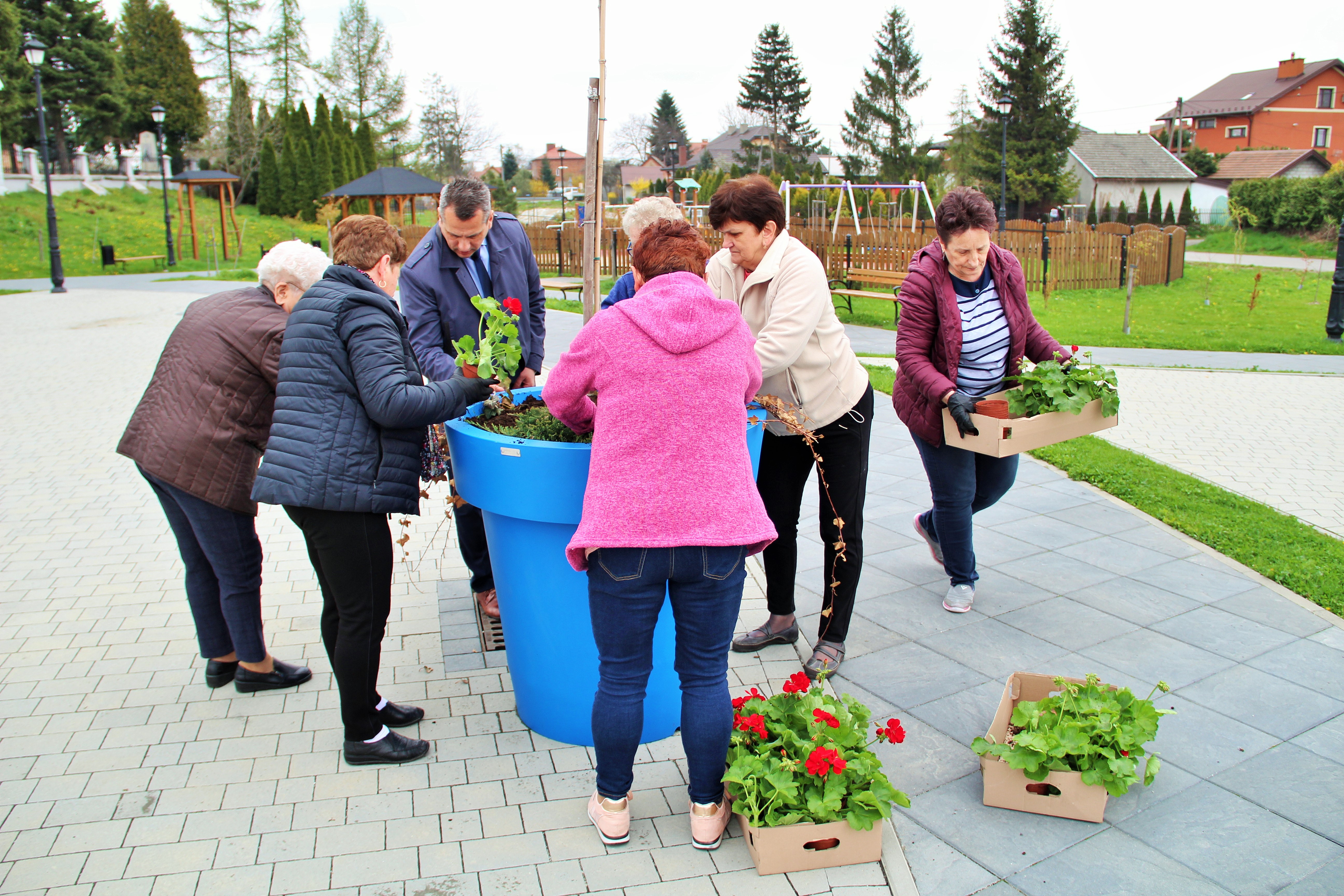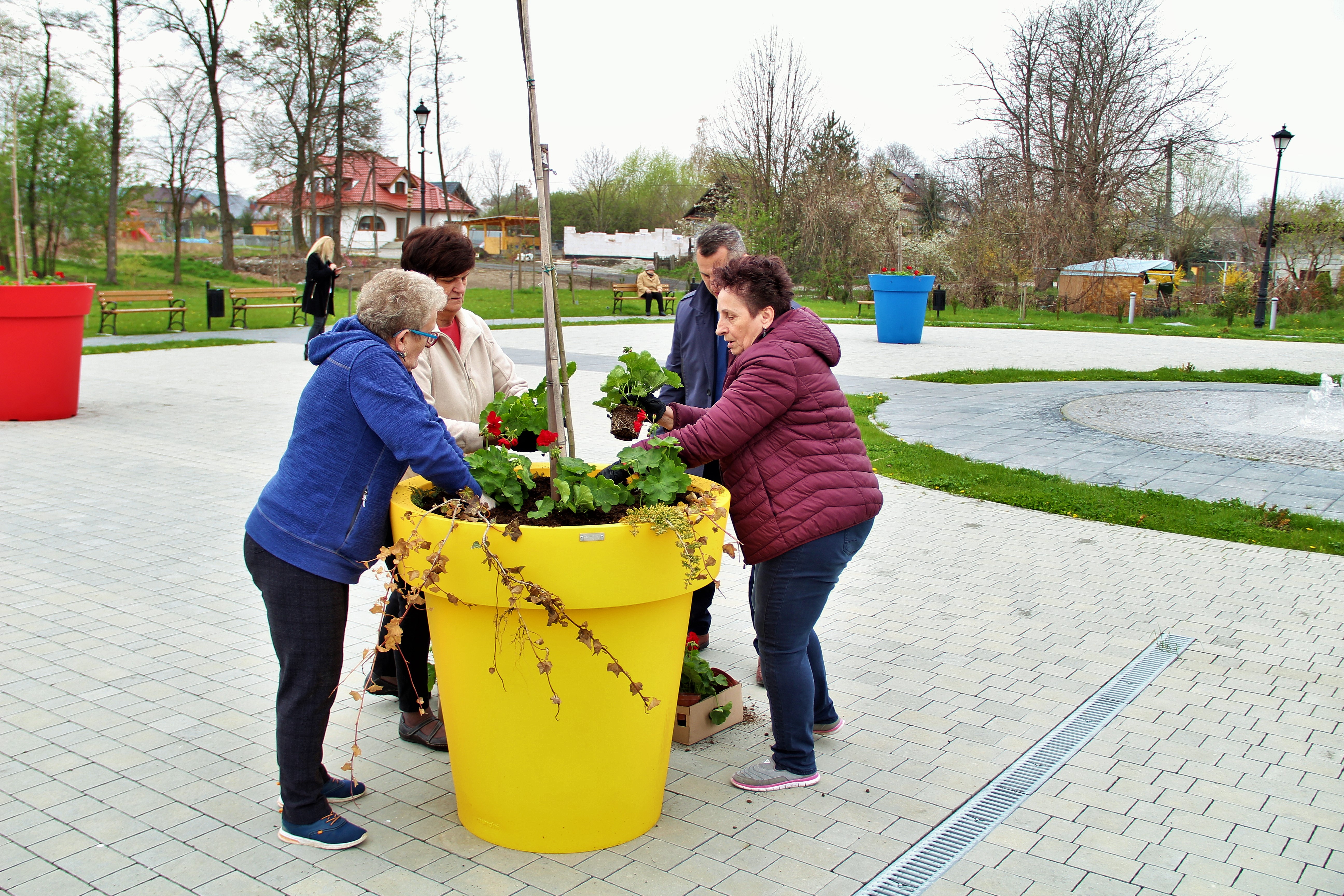 Uczestnicy Klubu Senior + w Rzezawie wzięli udział w akacji sadzenia kwiatów na rzezawskim Ryneczku.