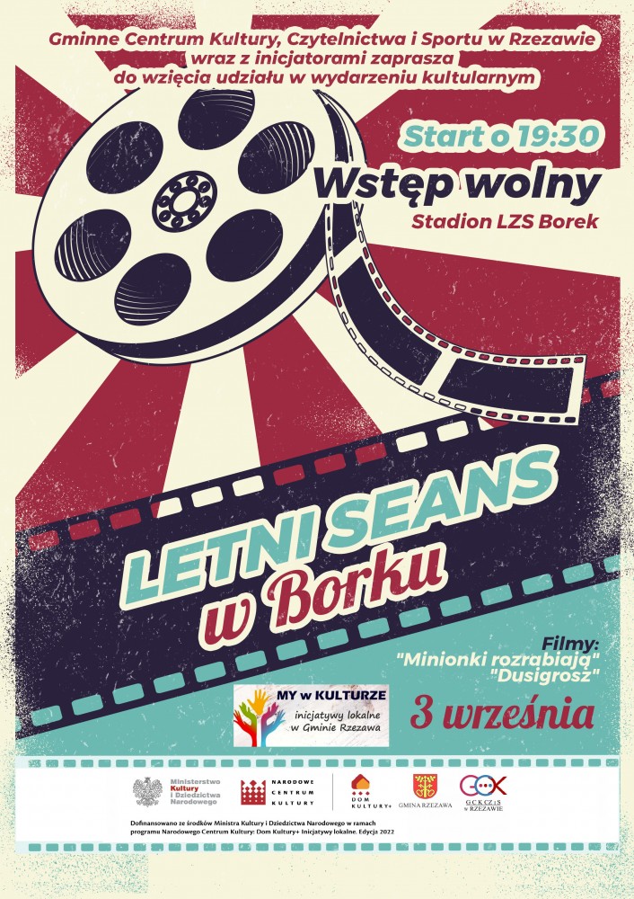 Gminne Centrum Kultury, Czytelnictwa i Sportu w Rzezawie wraz z inicjatorami wydarzenia zaprasza 3 września 2022r. na ,,LETNI SEANS‘’ na stadion LZS Borek. Przygotowano dwie filmowe propozycje ,,Minionki rozrabiają’’ i ,,Dusigrosz’’. Na dzieci czeka popcorn i wata cukrowa. Inicjatywa będzie organizowana przy współpracy LZS Borek, MDP i OSP Borek.